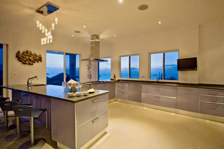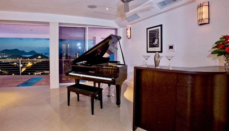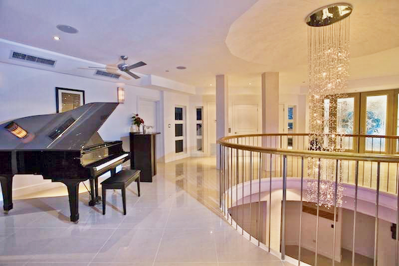 2 guest bedroom suites with private balconies, a self playing baby grand piano, majestic Swarovski chandelier and terrace with glass inset floor looking over infinity pool and ocean provide an ideal space within the villa for friends and family to relax and entertain.