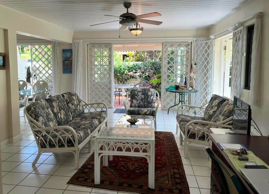 There is an open plan living/dining room with overhead fan and three sets of double doors. The doors lead out to the enclosed terrace, with an abundance of flowers and greenery for privacy.