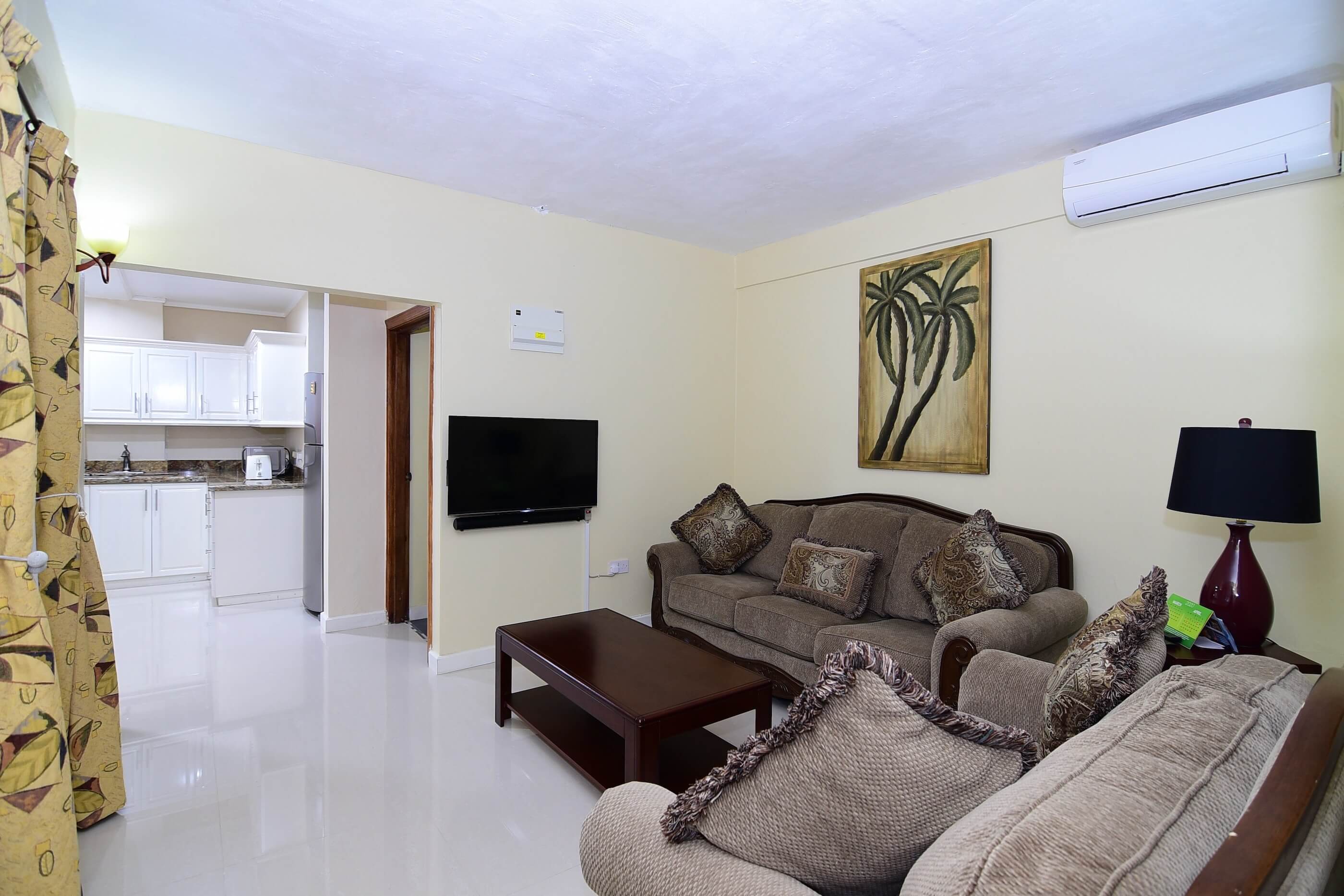 - Generous living room with A/C, opening onto a large balcony