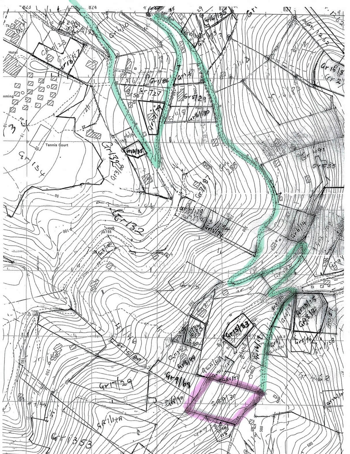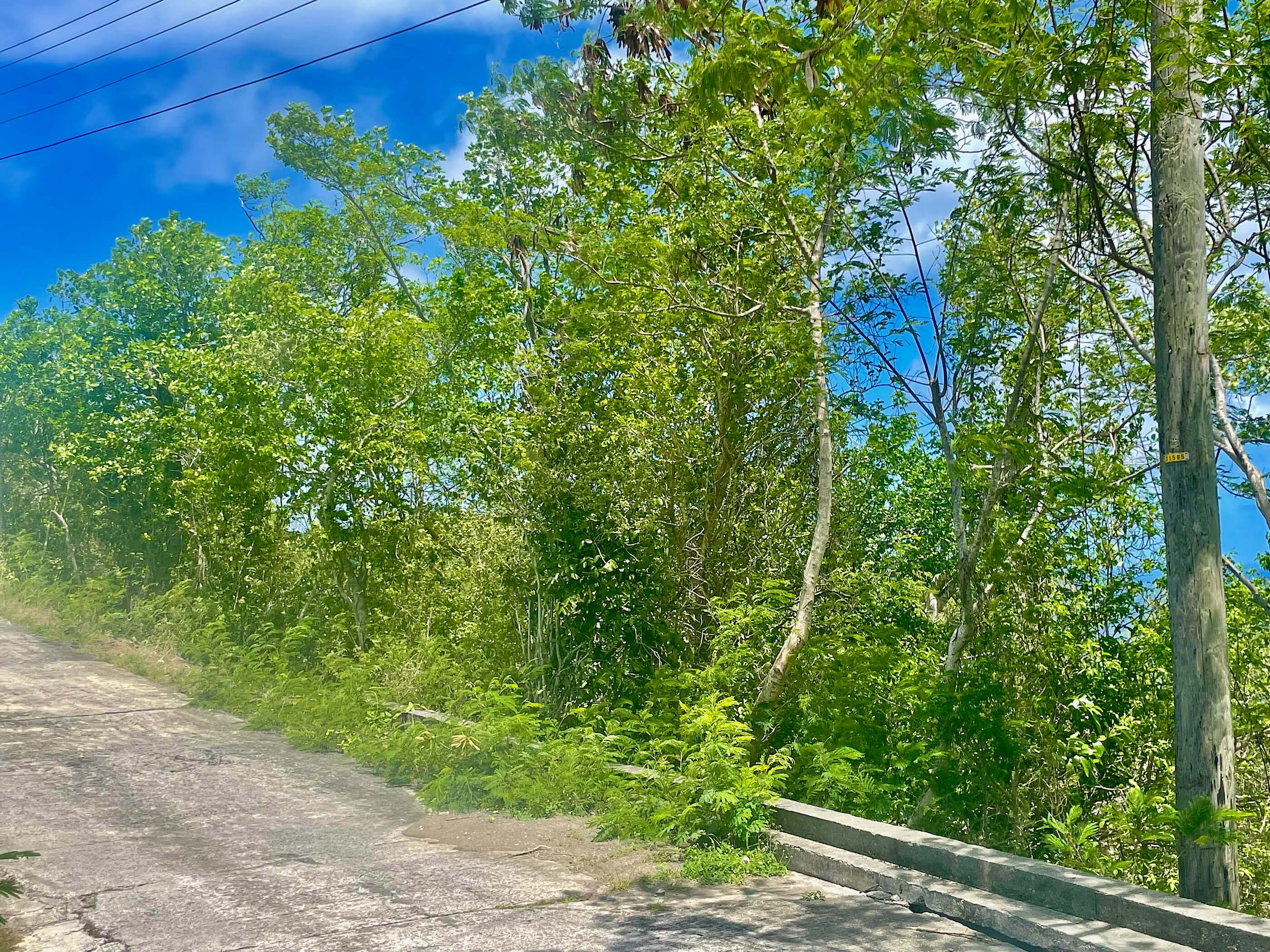 Access: From Sugar Hill crossroads heading toward the harbour, take the left uphill road. After the first flat area, the plot sits on the right as the slope rises again — marked from electricity pole no. 21585 and extending uphill approximately 95 ft to a metal stake at the start of a concrete parking area.