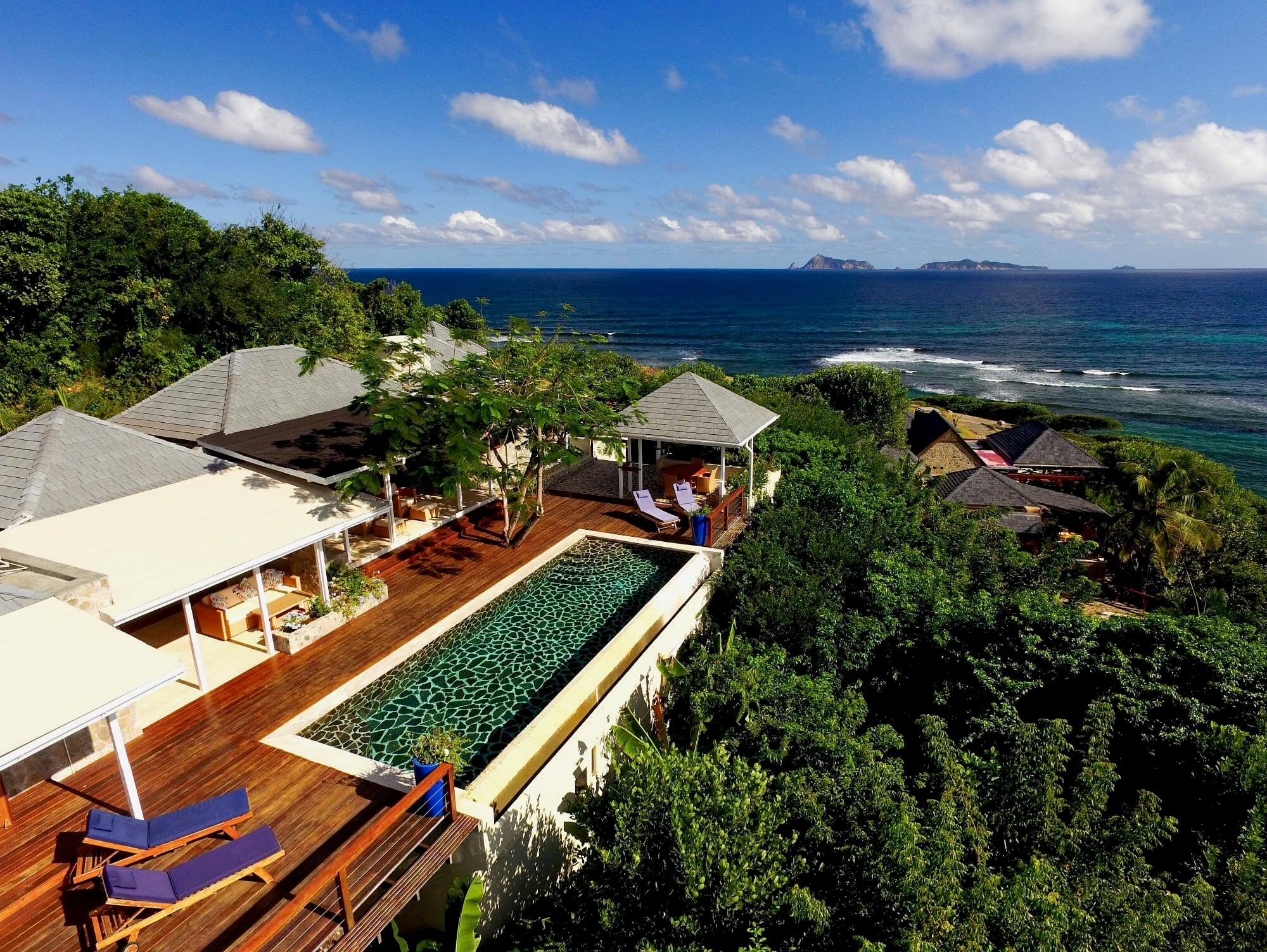 Situated on an elevated site above Crescent Bay, the villa enjoys uninterrupted views across the aquamarine sea to Balliceaux, Battowia, and Mustique. Coconut palms and tropical gardens surround the home, creating a peaceful, naturally beautiful retreat.Outdoor Living at its Finest