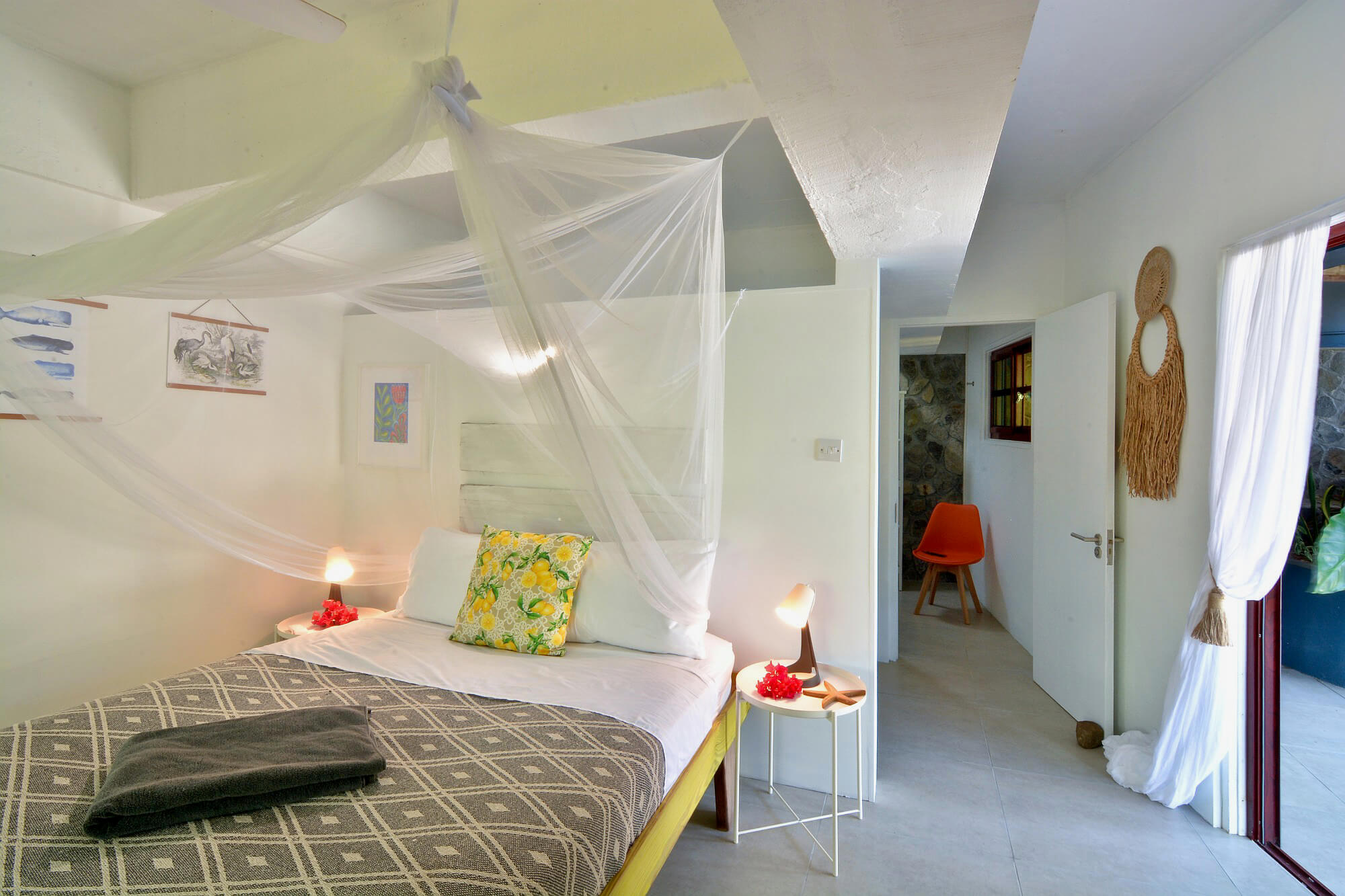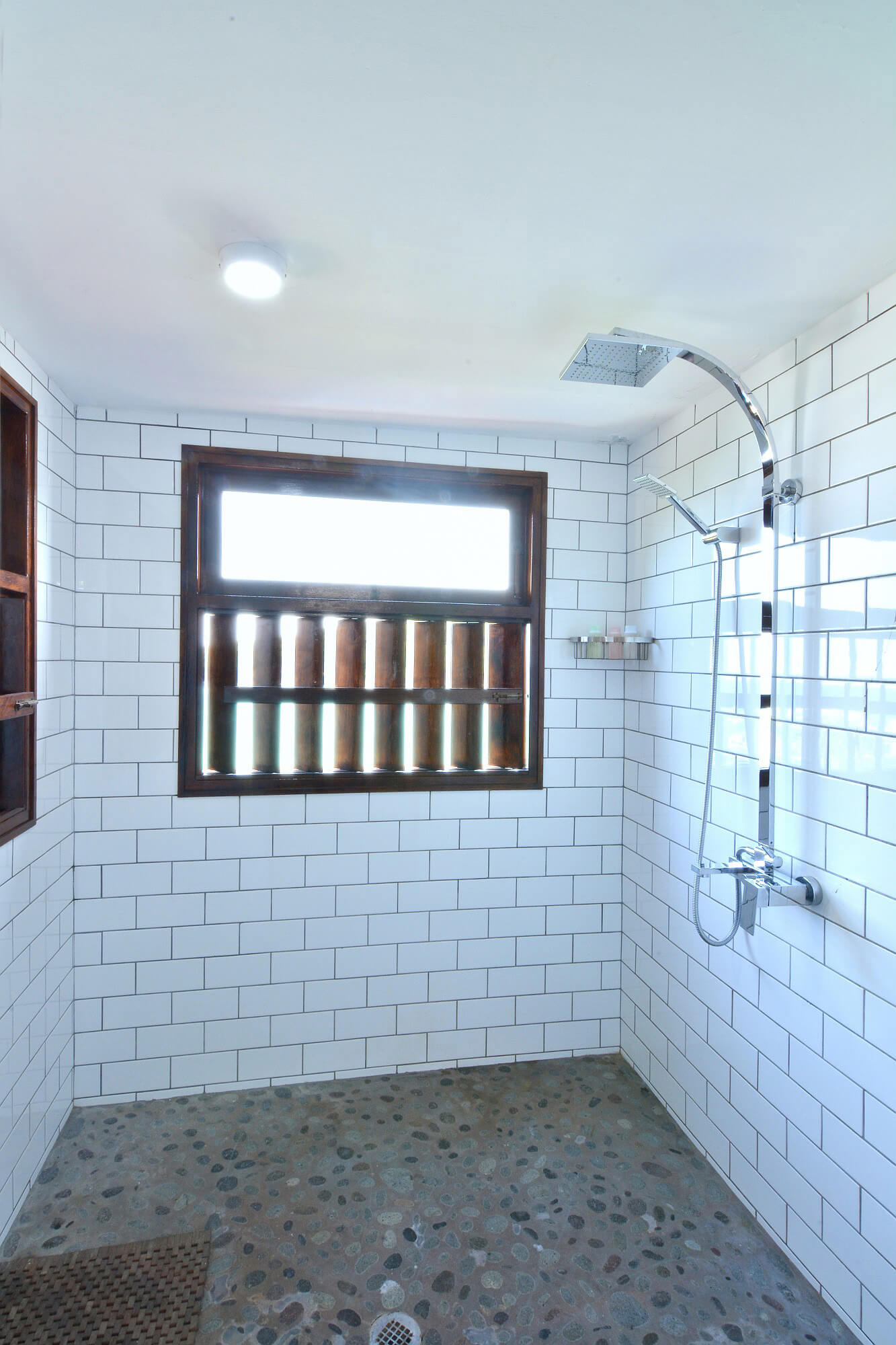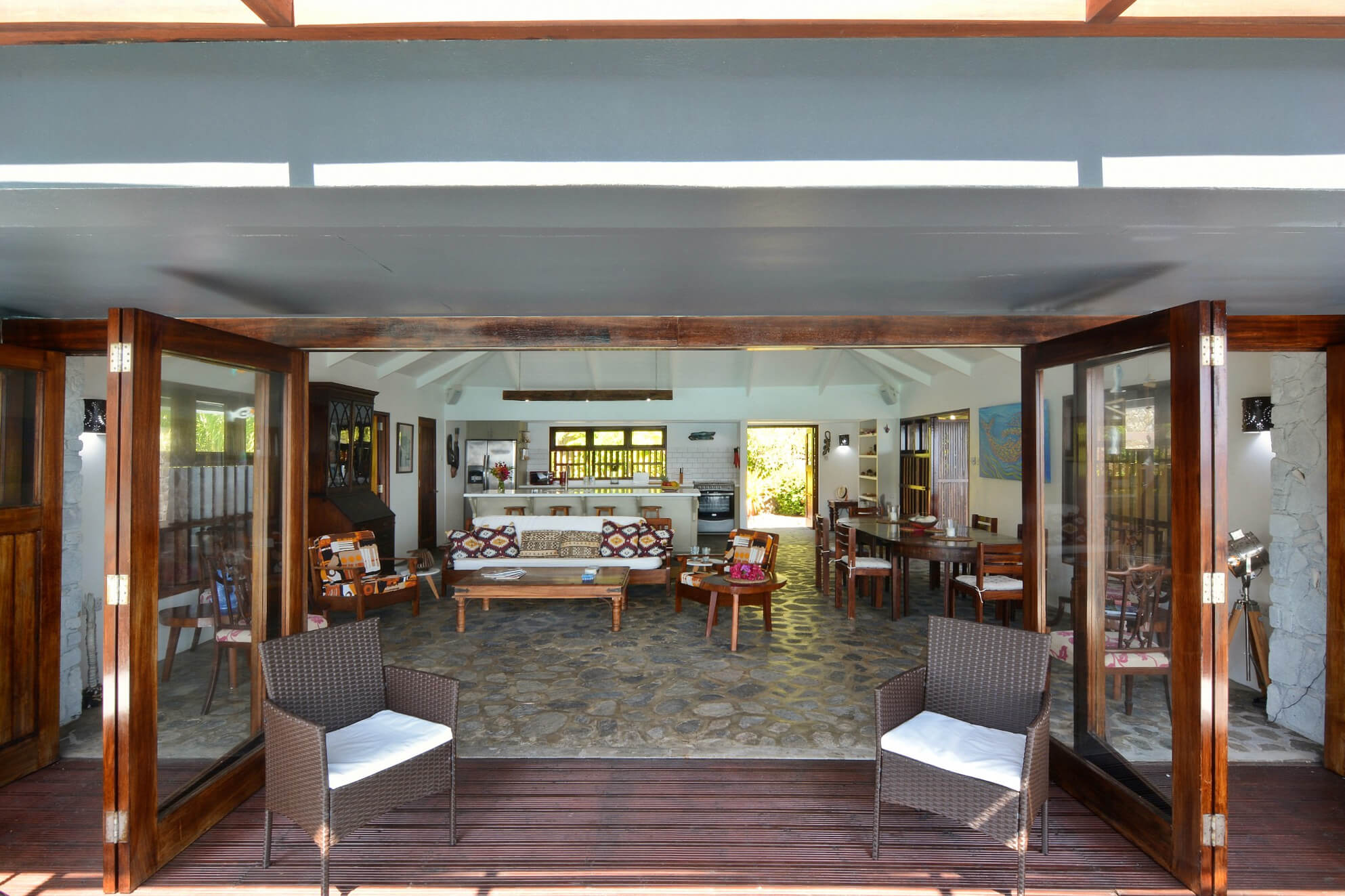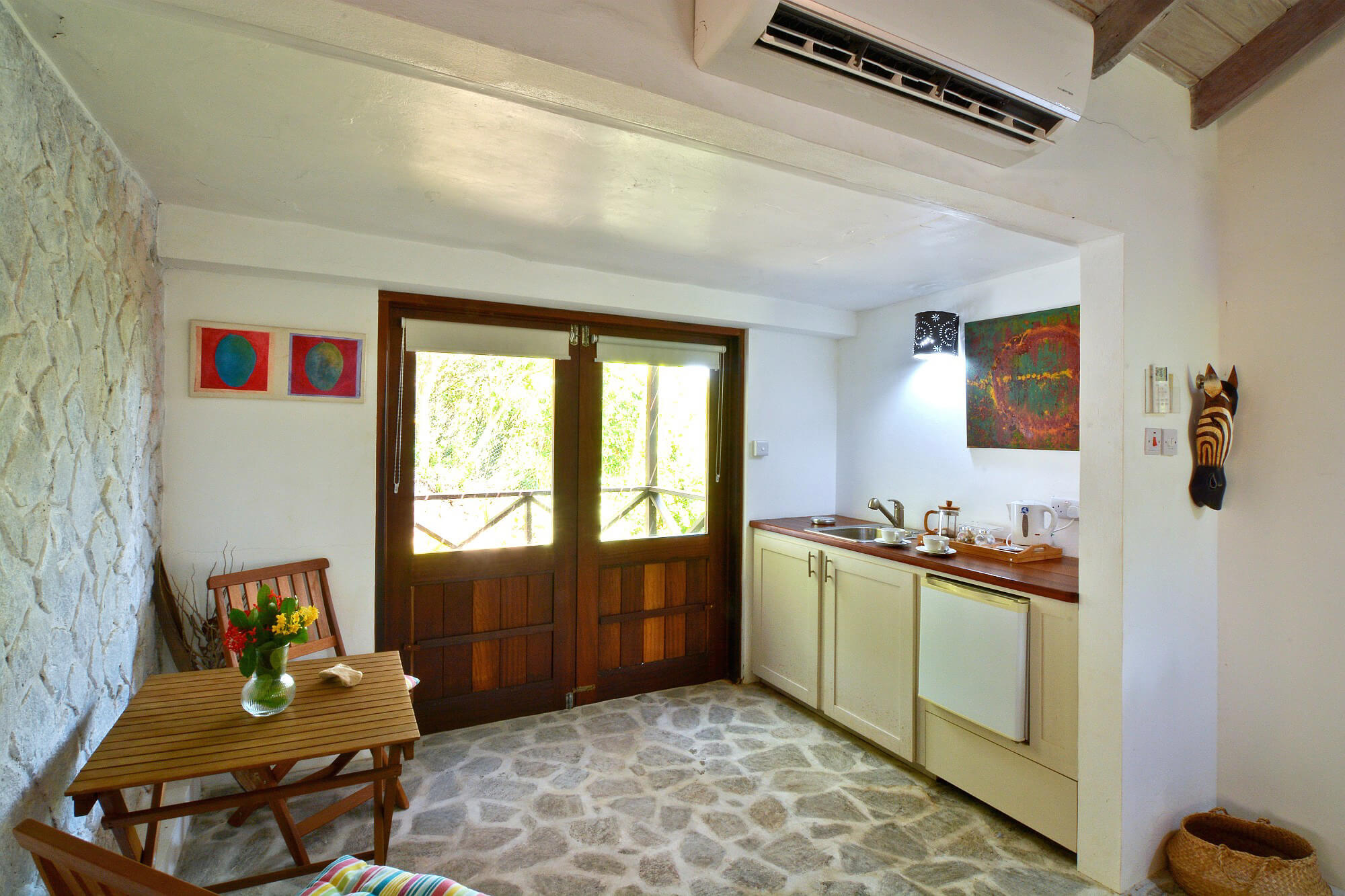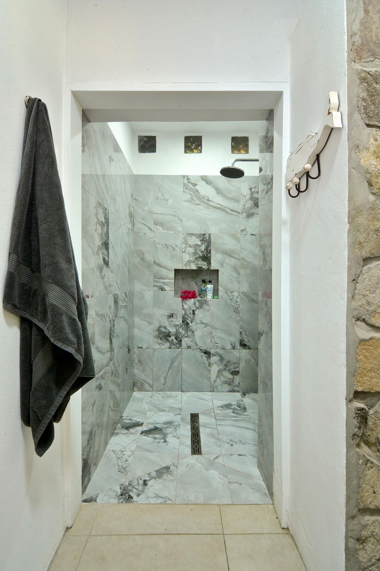 The floors throughout are made from hard wearing and easily maintained local stone, set in a rustic style. The doors and roof have been built from purple and green heart. Many doors and furniture have been handmade by a local craftsman. The roof has been constructed using wooden beams and steel.