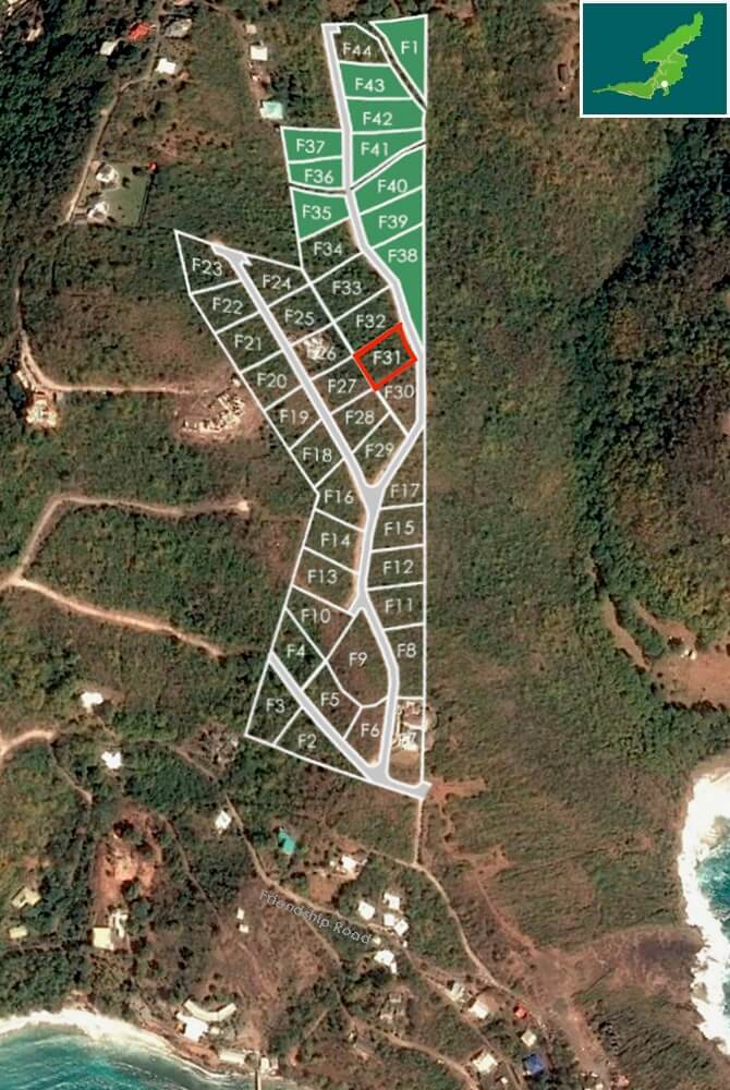 Access is via the Friendship Heights road, which runs up from Friendship Beach and ends just beyond this plot. Lot 31 sits just below the road, offering straightforward access while maintaining privacy.