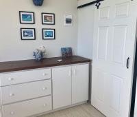 The upper level is comprised of a combined large living area, indoor dining for six and kitchen. There is a laundry room outfitted with a cabinet and sink, washer and dryer. All ceilings are light and airy pickled wood. The Great Room’s ceiling soars 19 ft. to the top of the cupola with a large fan. Triple doors expand over a 13-foot opening to the veranda.The kitchen is equipped with a Whirlpool stainless French-door refrigerator, gas cooktop/oven and microwave. Spacious lower cabinets, white quartz counters and beautiful herringbone mosaic tile backsplash in shades of blue with open upper shelving make the area light and open. Step-out the large, 8-foot tall, mahogany wood pivot door to the back of the home to a gas grill on a custom-built wood stand for outdoor grilling. There is a laundry room outfitted with shelving, cabinet, sink, washer and dryer.