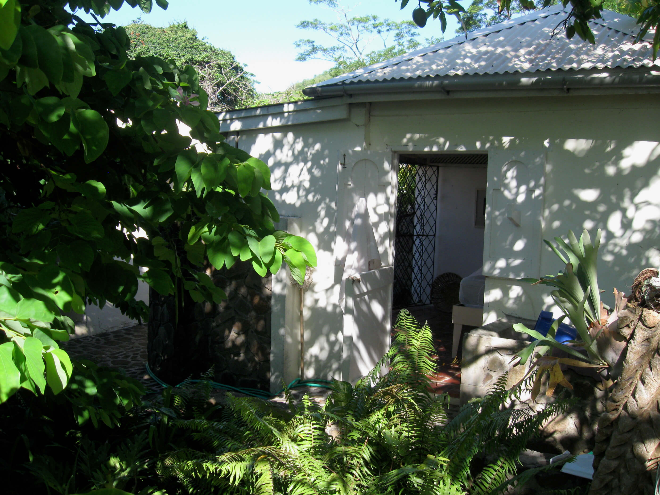 This is a one story home, built on ground level, consisting 2 bedrooms, 1 bathroom, main room and kitchen & office, all spread among three buildings. The house is constructed of cement, stone and red tile for flooring, circular stone walls and stone terracing between the buildings. Every room opens to patios, bringing inside the tropical gardens and beautiful views.