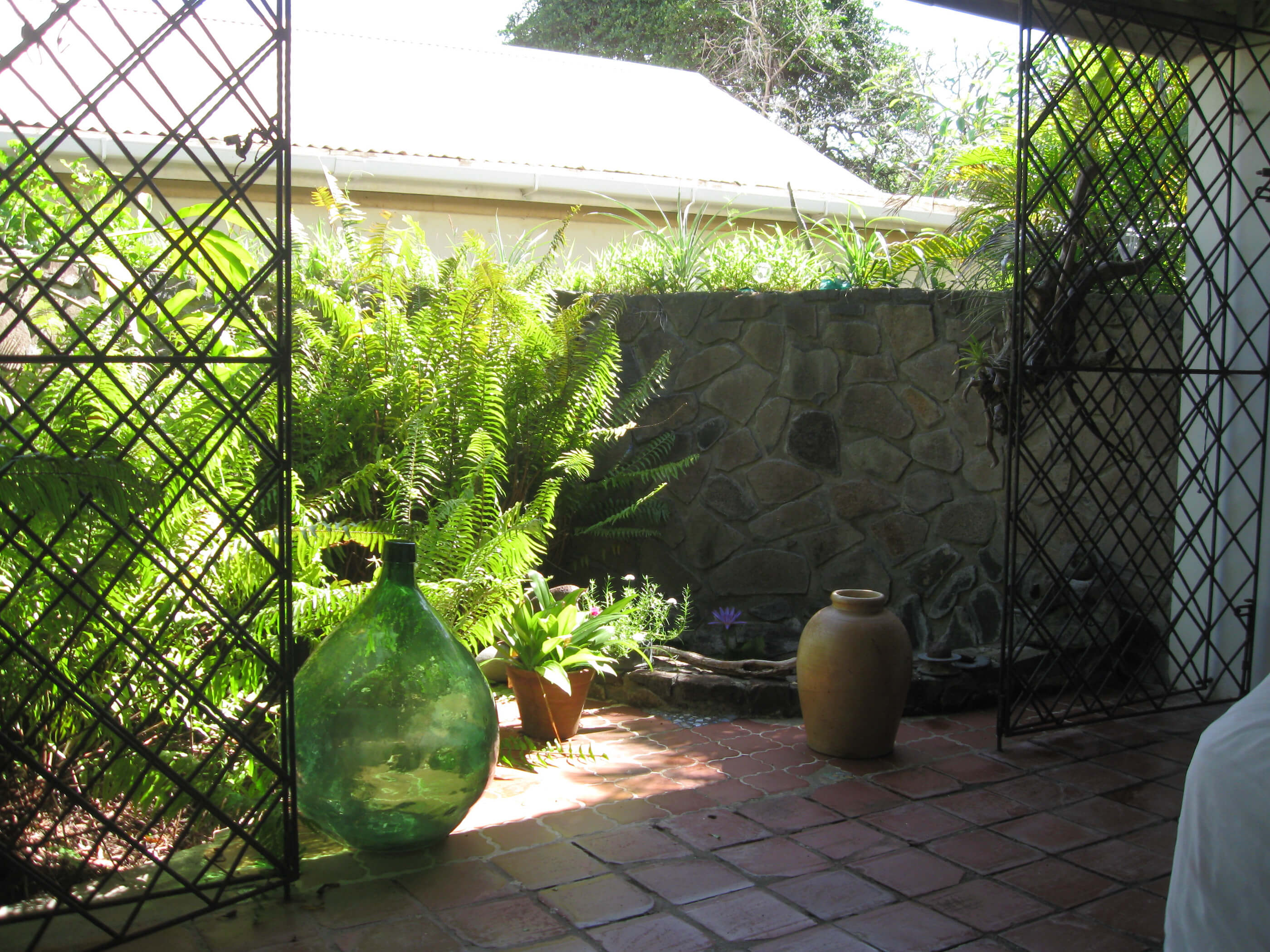 Building two contains the master bedroom, with en suite open air bathroom with circular stone shower, and private small garden with lily pond surrounded by a circular stonewall.