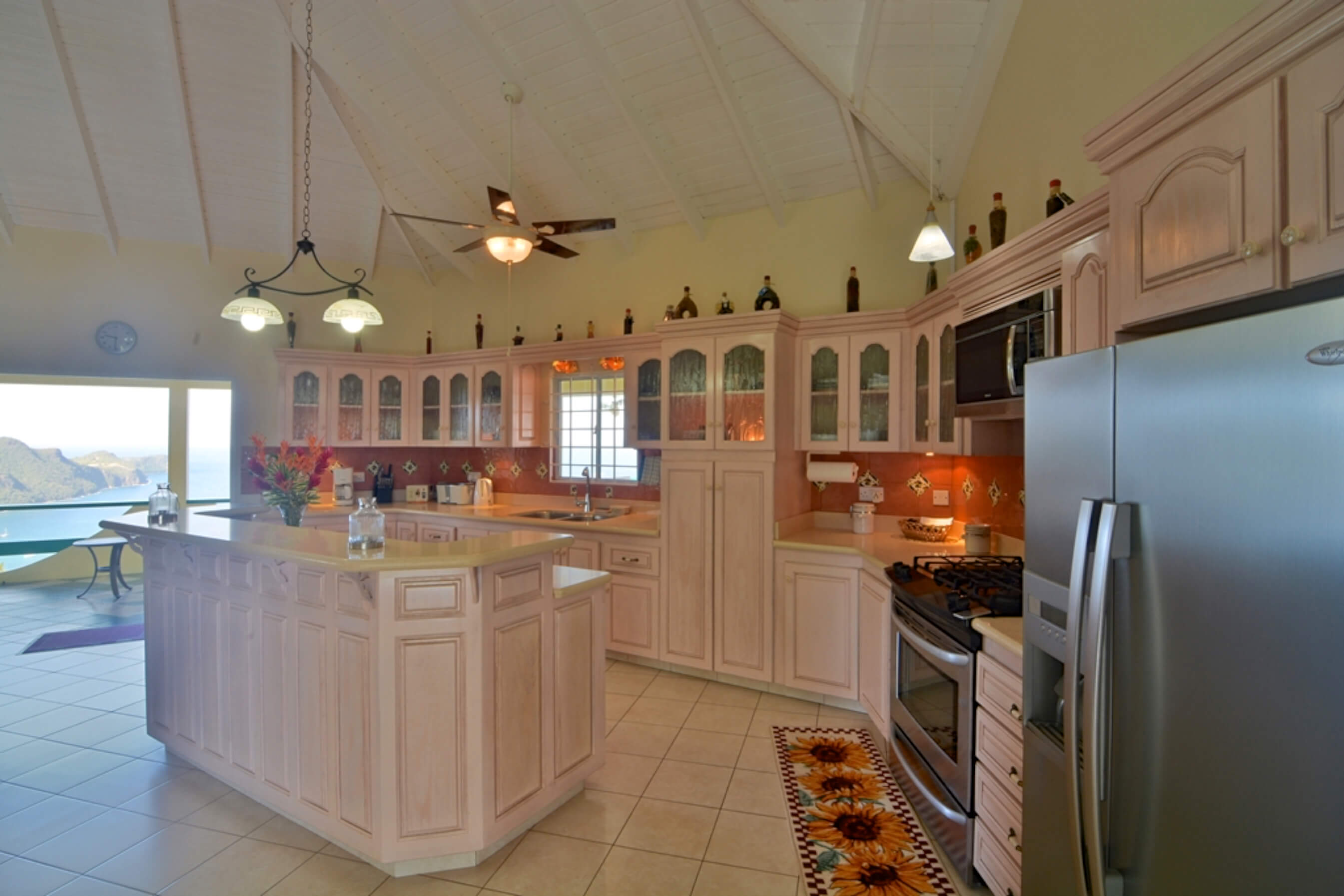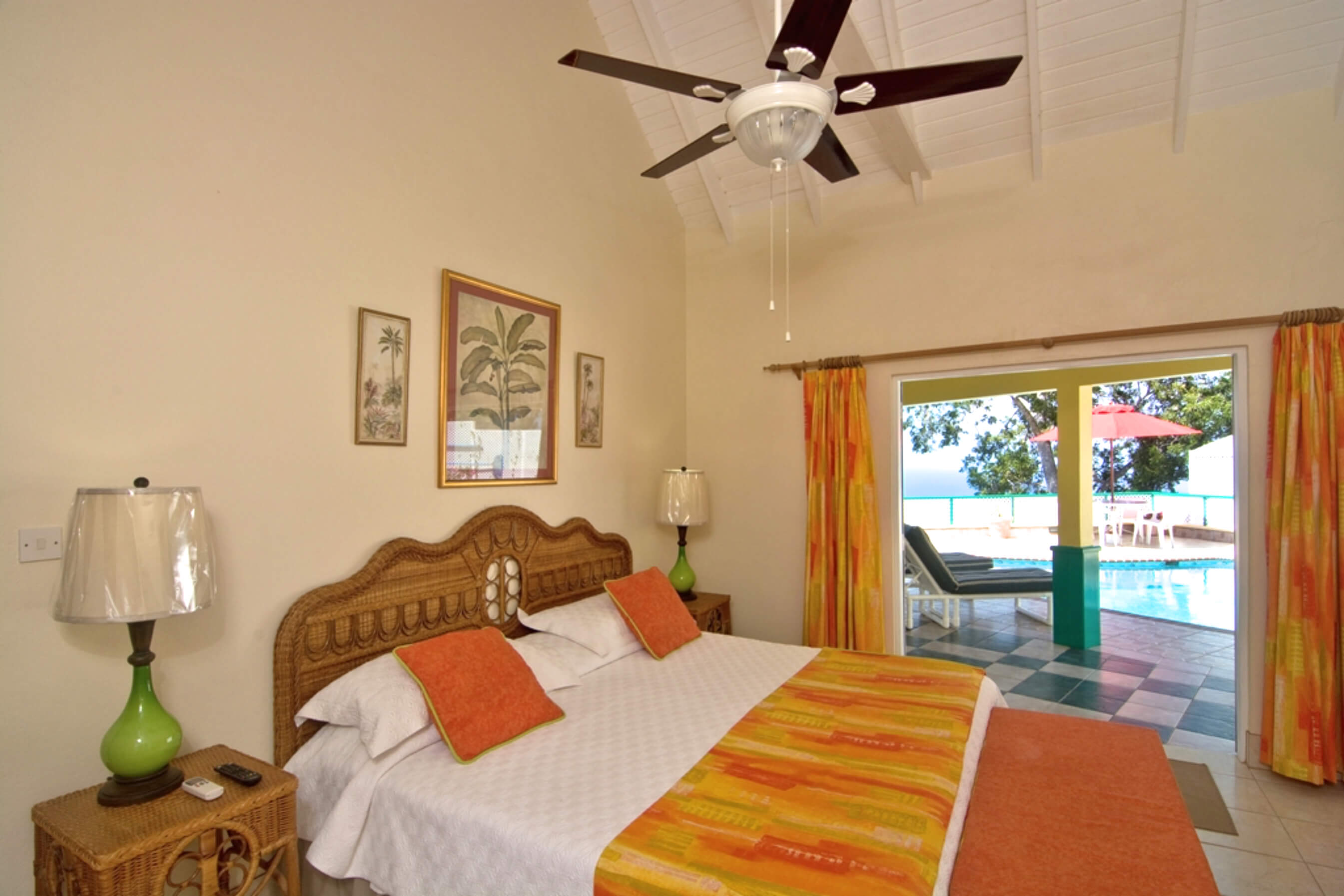 The open plan living room and recently refurbished kitchen both have tiled floors, ceiling fans and large french windows that welcome in the cooling tradewinds and offer delightful glimpses of the ocean and beaches beneath. With impressive vaulted ceilings painted in cool white and ivory and with a clean uncluttered style throughout this villa exudes peace and tranquility.