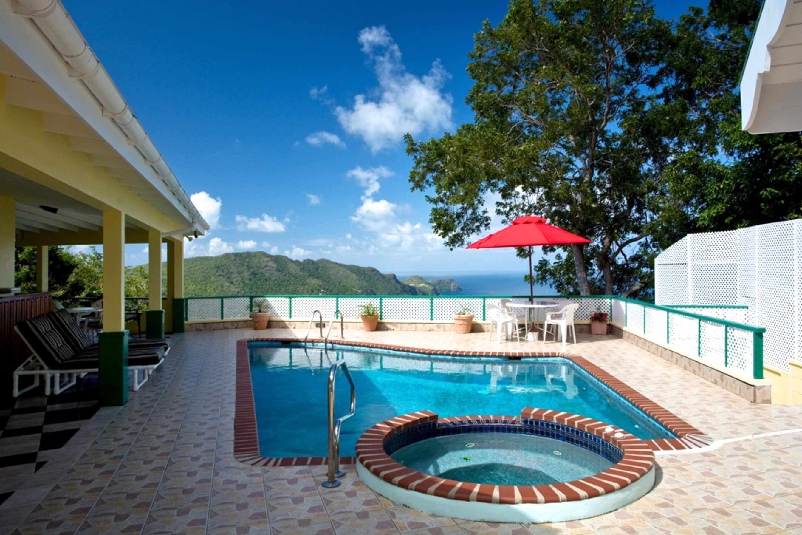 Allamanda boasts its own private Curvaceous pool with the addition of a therapeutic jacuzzi conveniently positioned close to the exterior bar and patio area enjoying great views down to Lower Bay Beach. This large poolside area, tiled in cool stone, is furnished with comfortable sun loungers and has several terracotta pots planted with decorative tropical flowering shrubs.