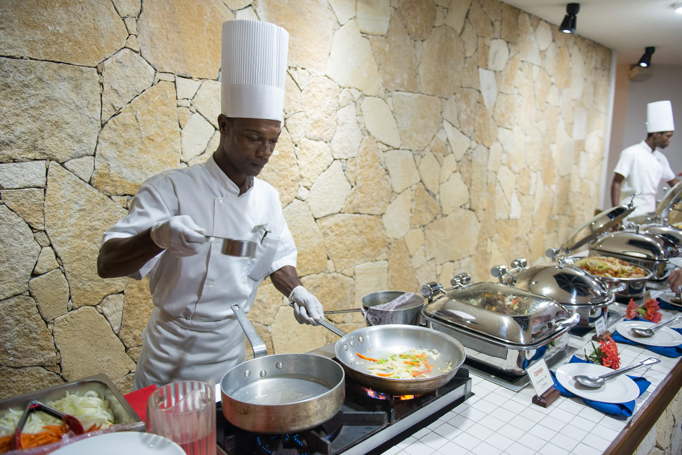There are 2 eating establishments in the resort. Arawakabana is Coyabas signature oceanside restaurant, serving breakfast and dinner, featuring fresh lobster. The Carbet is a poolside grill specialising in burgers, fish, soups and salads.
