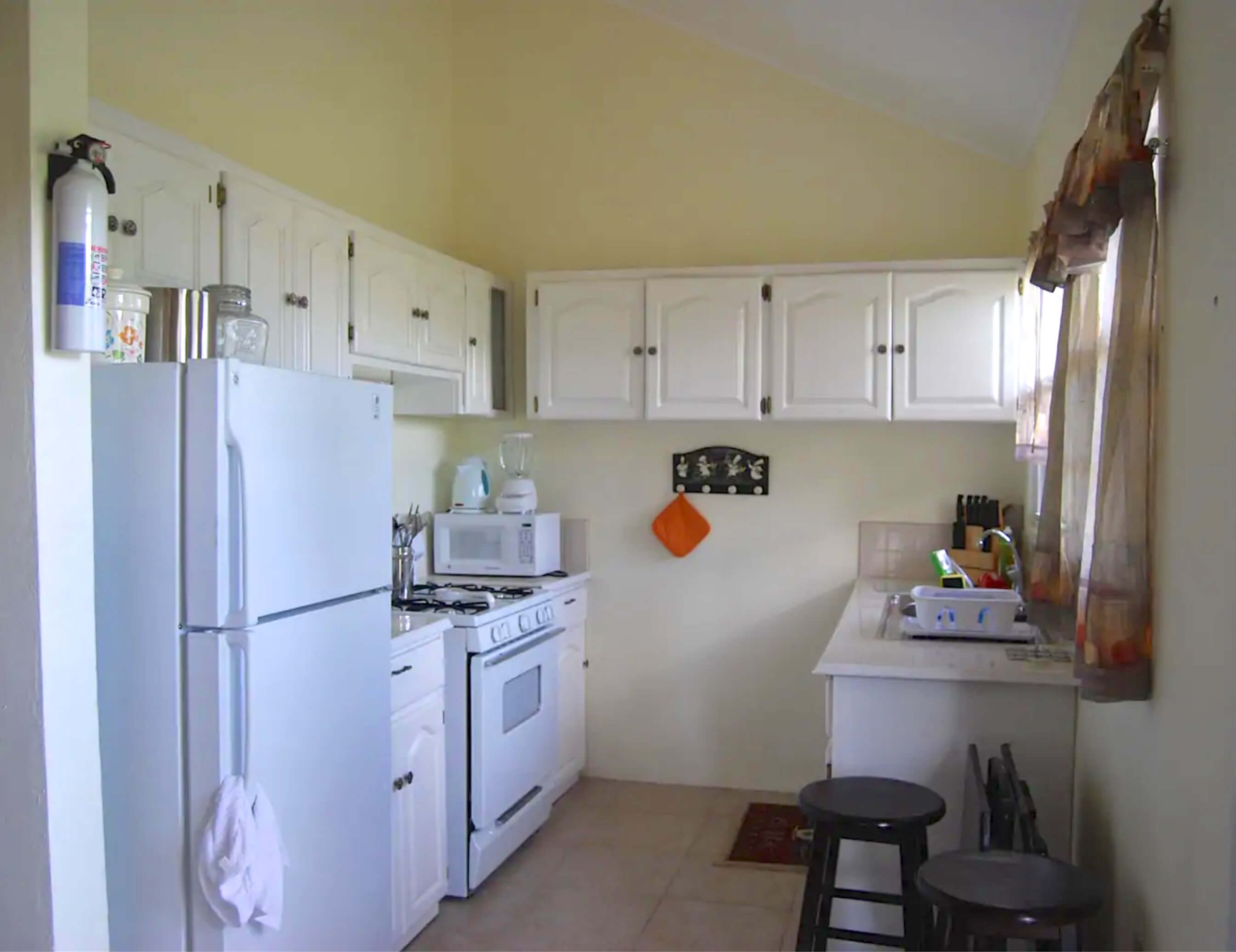This clean, modern apartment has a well equipped kitchen containing amongst other things a refrigerator, coffee maker, toaster, electric kettle, blender, microwave, gas stove and oven.