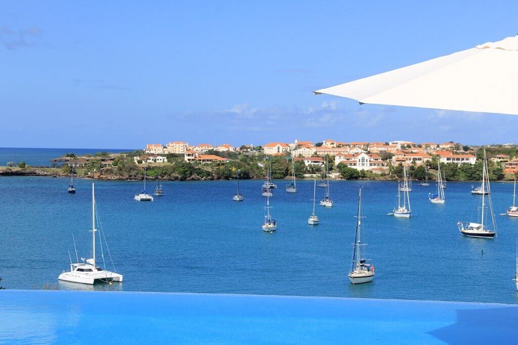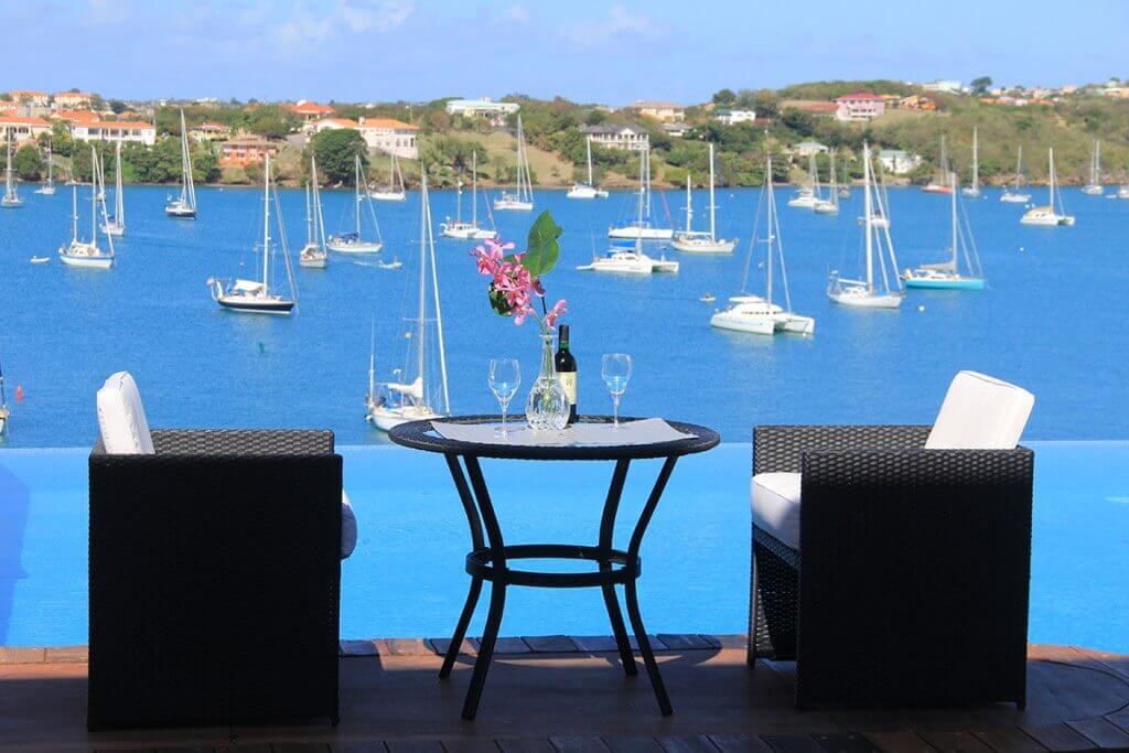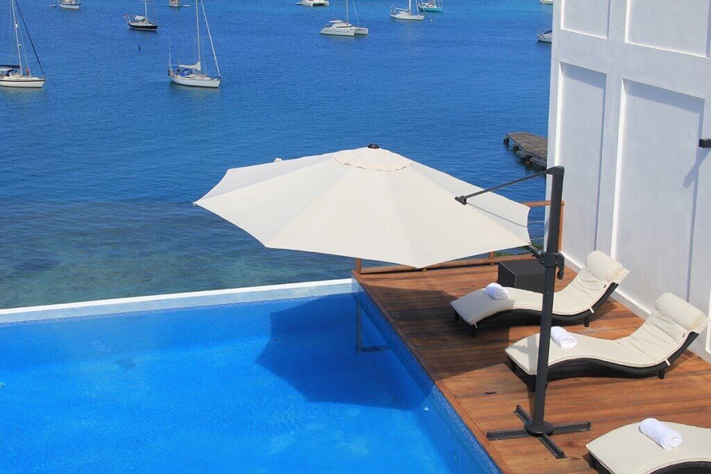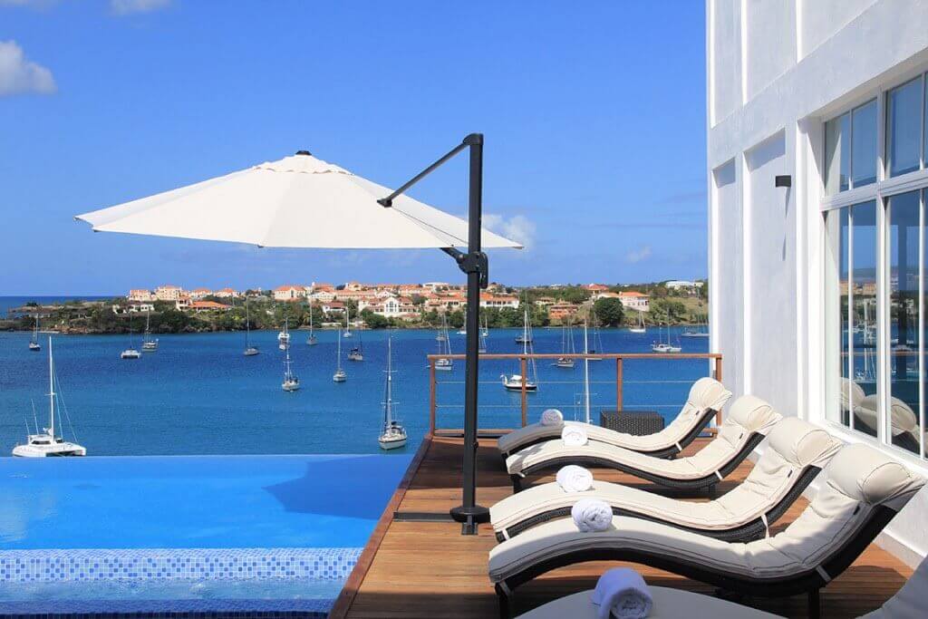 This beautiful infinity pool is 45 ft long, 35 ft wide and at It's deepest point 6ft deep. It's edge overlooks Prickly Bay, the cruise ships and sailing boats and is surrounded by chic sun loungers, pristine sun deck and an adjacent covered gazebo. There is a pool maintenance man who visits 3-4 times a week to clean the pool.