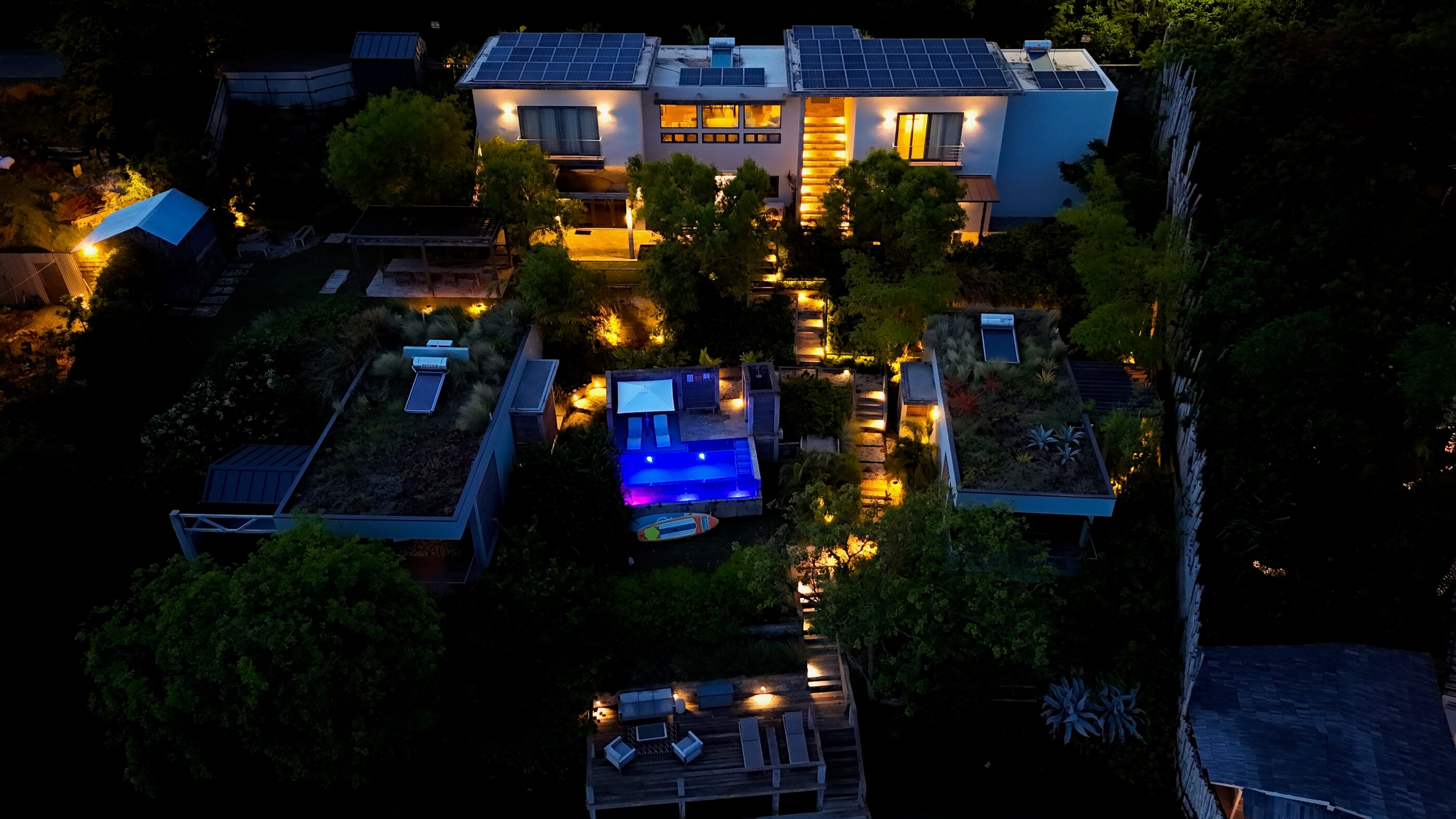 - Rainwater harvesting + purified drinking water throughout