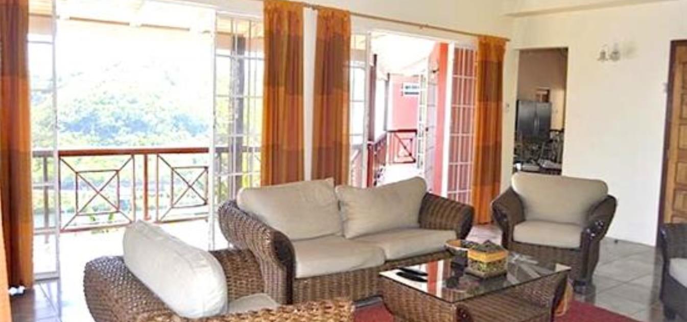 The main interior living space is dominated by a collection of stylish and very comfortable rattan sofas and chairs. There is also a dining area with a glass topped table and chairs for 6 next to french windows that open onto the verandah and views of the harbour below. This villa is particularly spacious and ideal for relaxing with lush tropical hillside and ocean views from every window.