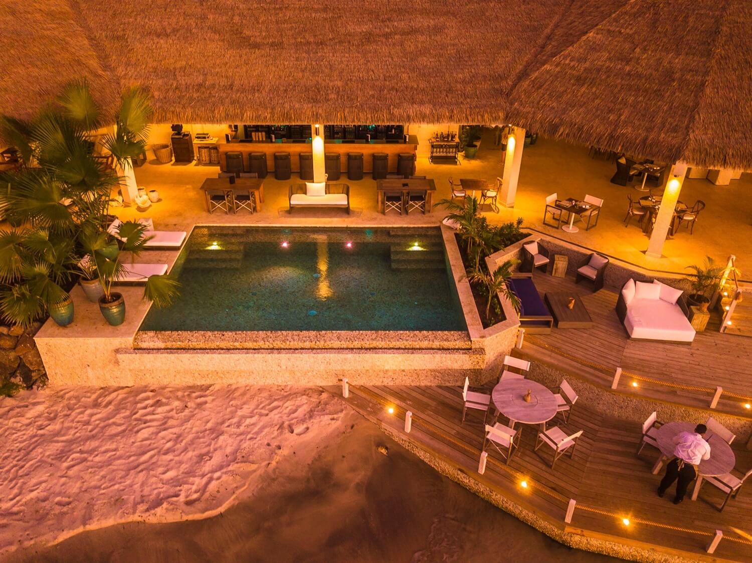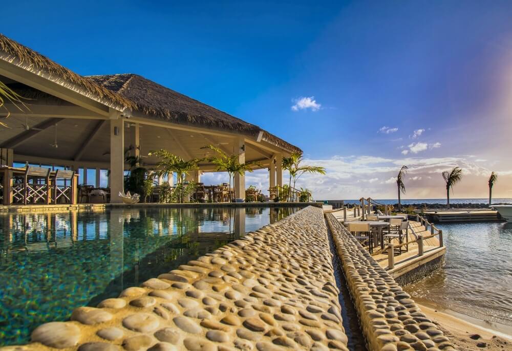 Beautiful large open air restaurant, bar and lounge situated over the turquoise waters Pool and small marina, Resort Speedboat and golf cart.