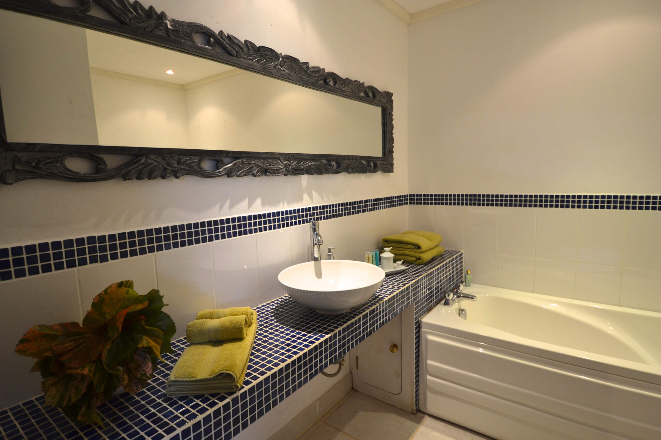 The master bedroom at Stone House is a great space. It is located just off the open pool courtyard, and is decorated in calm, neutral colours. It boasts a fantastic four poster king size bed - the perfect area in which to recharge your batteries. The bedroom has AC, and a mosquito net. There is a dressing table, and storage space including a fabulous antique style mahogany chest, located at the foot of the bed. It's details like this that give Stone House It's charm. There is an en suite bathroom, along with a second guest bathroom.