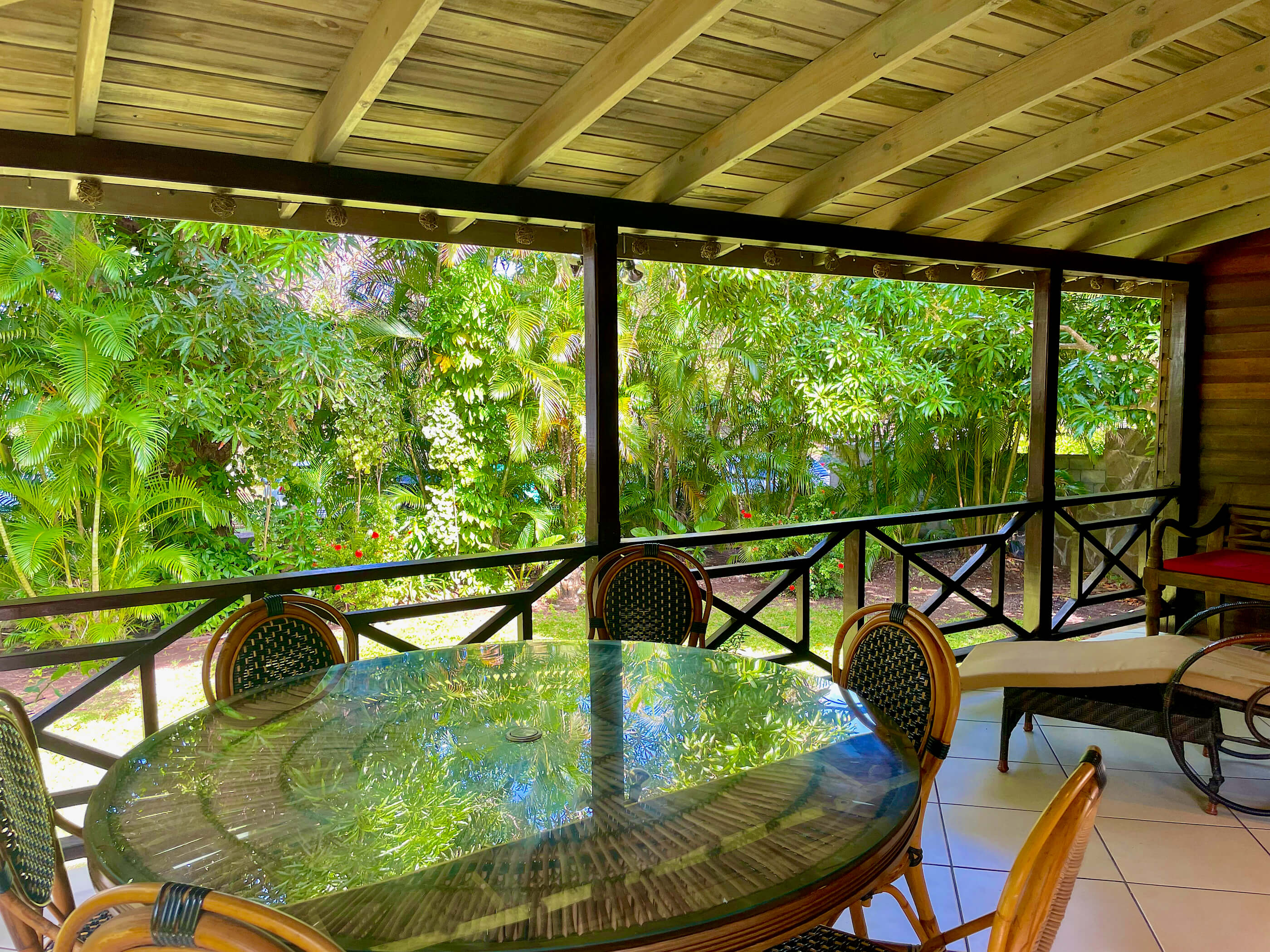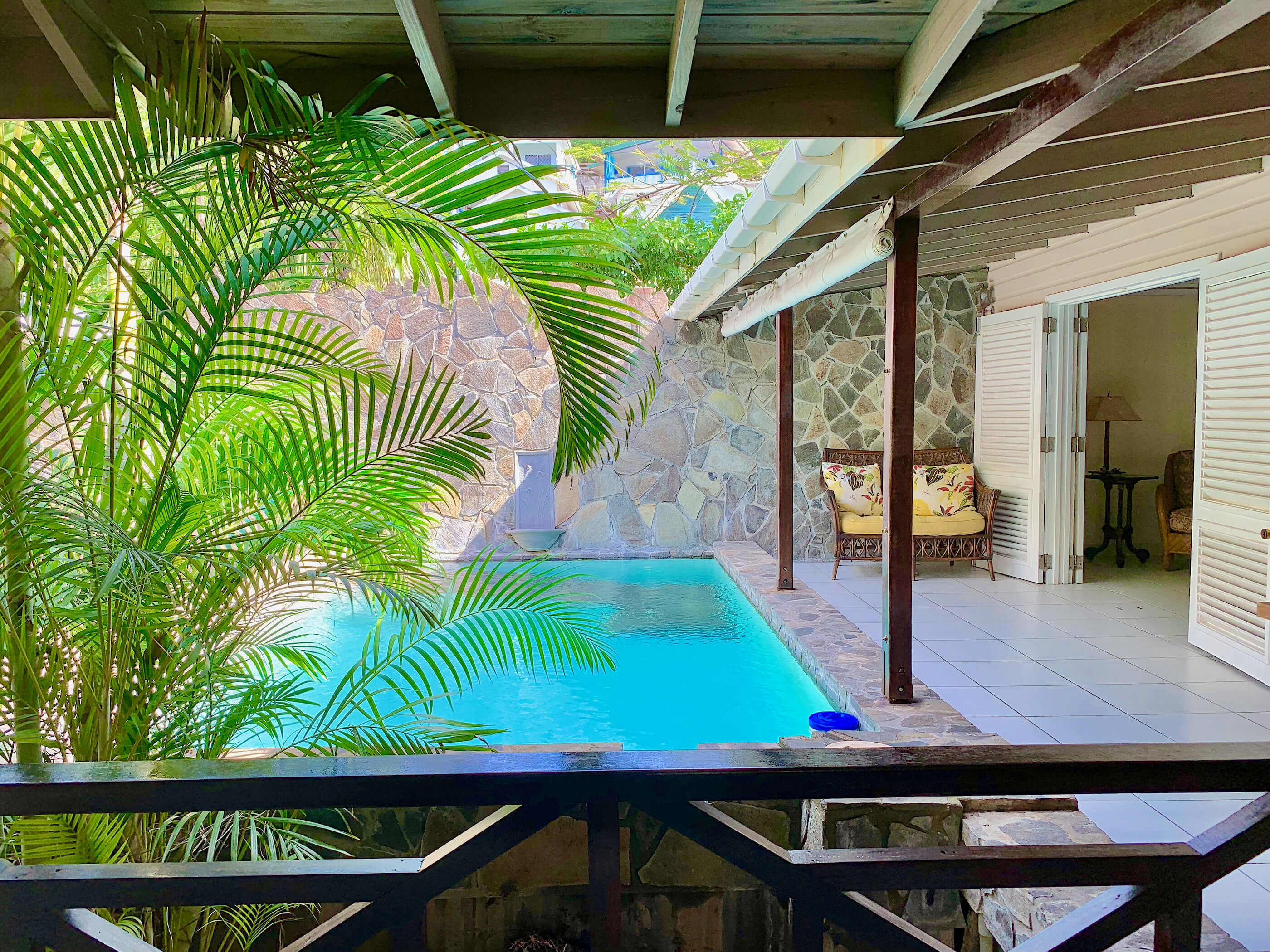 There is an open living area, with large comfortable sofas and large flat screen cable TV located just by the central pool area. This is a great space in which to relax, with comfortable seating and a coffee table - the perfect spot to place that Rum punch pitcher . . .