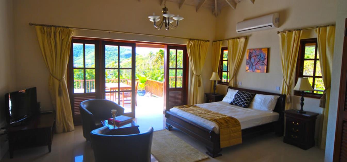 Panorama sleeps 2 guests and is located on the Upper pool level of 340 square ft with direct access via it's large 12 ft wide French doors to the upper levels 1,500 square ft of verandas, Sundecks and panoramic views. Of a traditional design with high, open, hand finished 'pickled' white boarded ceiling and mahogany furniture with a US 'Queen' size sleigh bed.