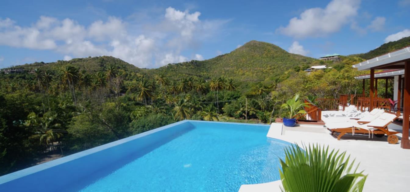 Shared sundeck and freshwater infinity swimming pool with ample sun loungers to relax in after taking a dip in the beautiful infinity pool looking directly South over the bay towards Mustique.