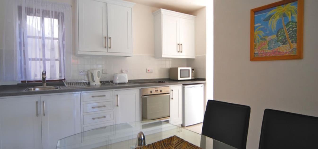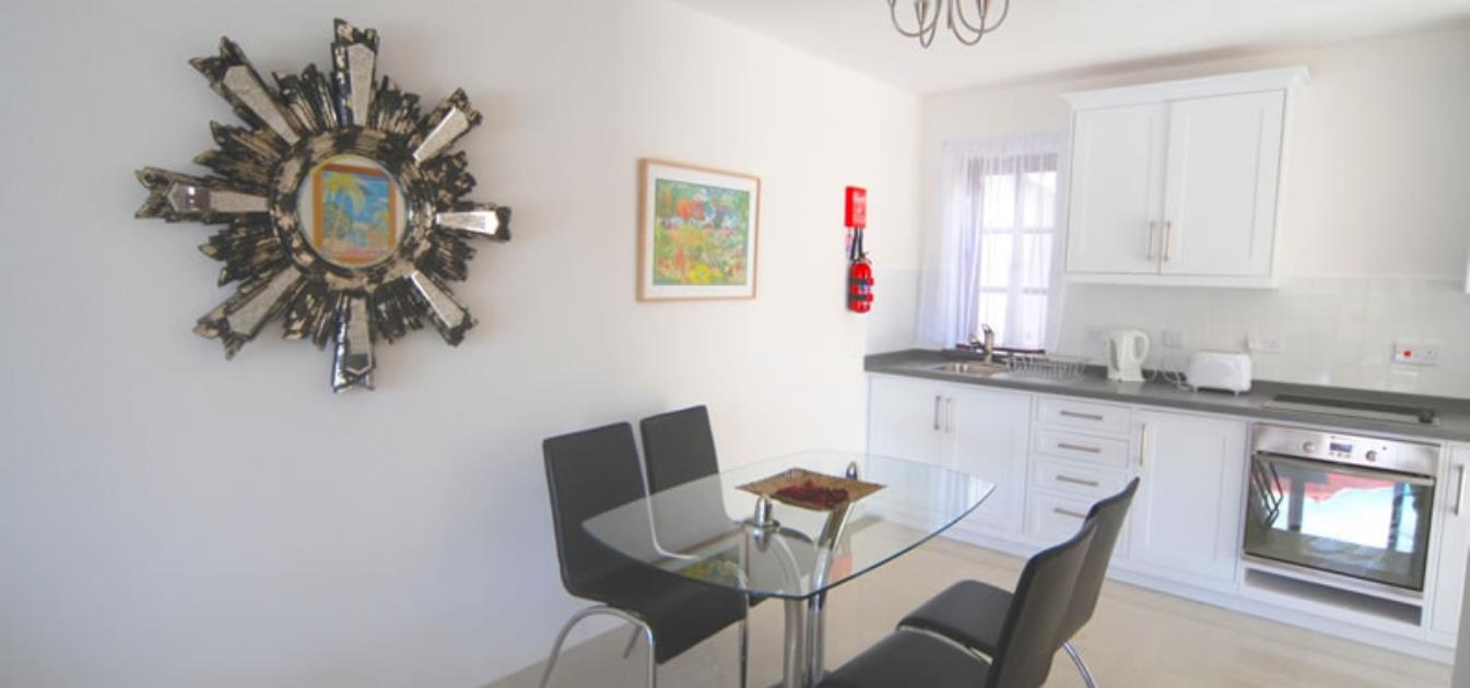 Well equipped kitchen area comprising hand built units, fridge with freezer compartment, 4 ring halogen hob, combination microwave and convection oven, single stainless steel sink. Also fully equipped with full range of modern crockery, cutlery and kitchen utensils. Furnished with a stylish chrome and glass dining table for up to four people.