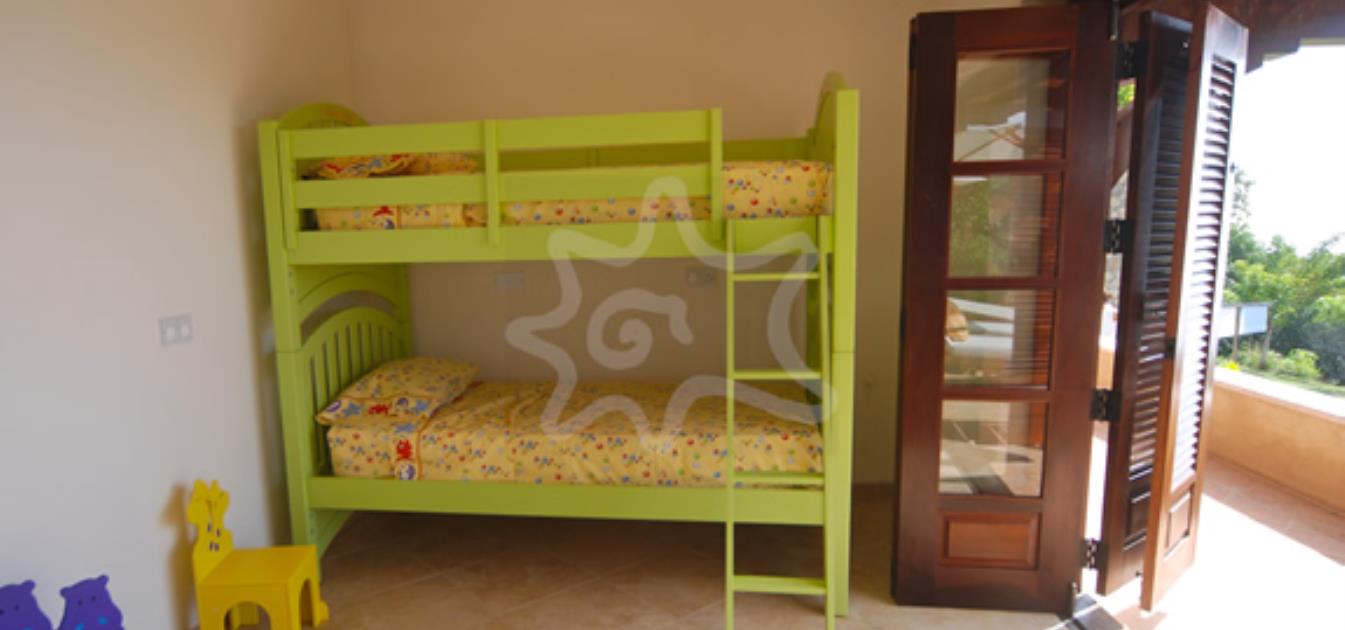 On the lower level, the bedroom layout is very spacious and well suited for family 2 adults and 2 children. The twin bed portion of the room can be separated by a screen for privacy. The Twins can also be made into a bunk bed and it is decorated in fresh, Caribbean colors. There is also a pack n' play portable crib available if needed.