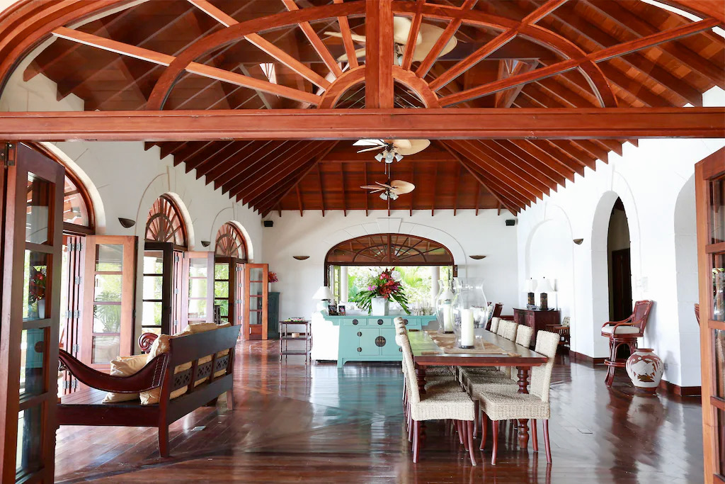 The architect of Sights & Sounds is Beyer Binder Belle of New York City. World renowned Architects for many landmark buildings in New York, London and Washington DC, as well as premier homes. This is an ideal property for discerning clients looking to avoid commercial areas and enjoy wonderful seclusion with a special ambiance, sophisticated interior design and world class build quality. The heart of this 6000 square-foot property is the great room, which encompasses the living and dining areas. This room literally "opens" up to the views through a series of five large tri-fold doors located on three sides of the room all leading to a generously-sized covered veranda - seamlessly integrating indoor and outdoor living space. The living area is cool and light, with a spectacular vaulted Brazilian Ipe wood ceiling and architecturally designed Ipe floors. The room is elegantly and comfortably furnished with two oversized white sofas, tables, lounge chairs and ottomans. A perfect place to retire at the end of a busy day and enjoy the ocean breezes while playing cards or board games with the family. Please note that there is no TV at this villa.
