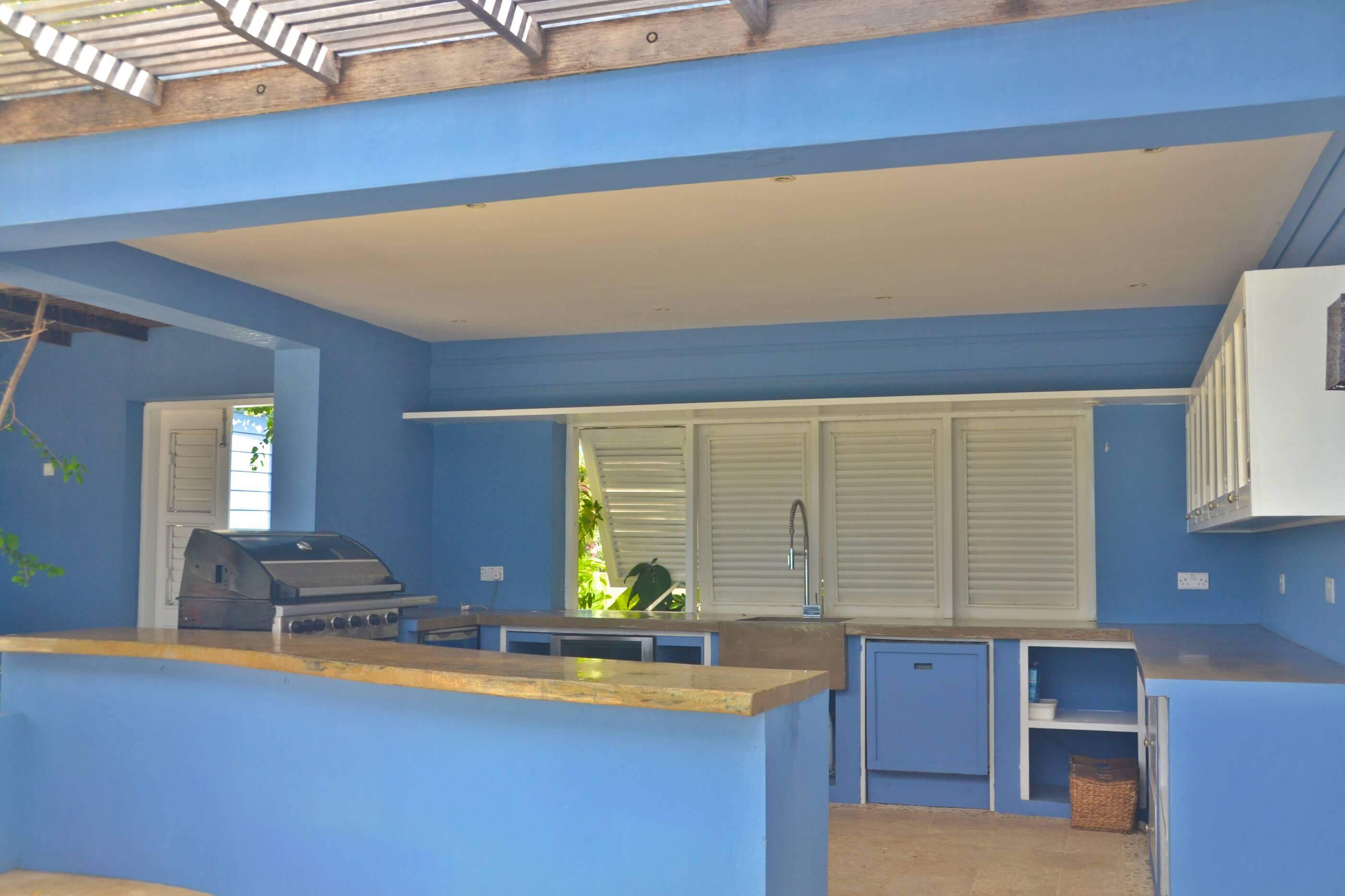The bedrooms at King House are pure Mustique inspired comfort and elegance. The main house contains the master bedroom on the upper floor, with It's own plunge pool. The lower level contains a guest bedroom with direct access to the swimming pool, and a third bedroom in a separate building off from the kitchen. These 3 bedrooms have private bathroom with sublime waterfront views, a pebble finished bathtub, raised bowl double vanity, lots of storage space for products and natural stone floors. There are a further two bedrooms in a separate wing by the entrance, with a shared central bathroom and direct access to the gazebo & bbq area.