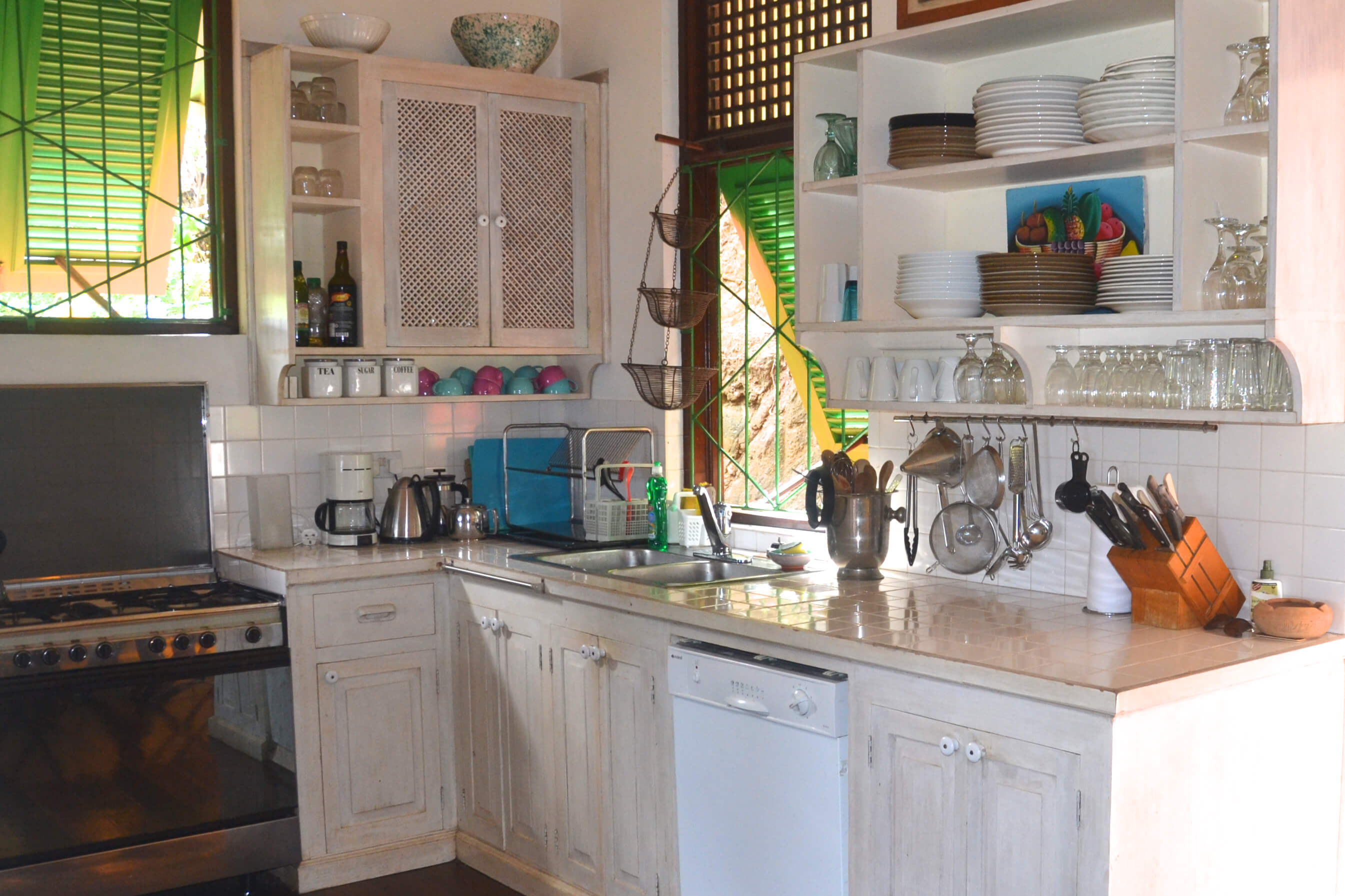The large kitchen with lovely high ceiling, is very well equipped with everything you need during your stay including a diswasher, a great space in which to prepare and enjoy your meals. There is a small breakfast dining table within the kitchen, the larger more formal table is located just outside on the shaded veranda and looks out through the greenery onto Lime Tree's lovely Lower Bay views.