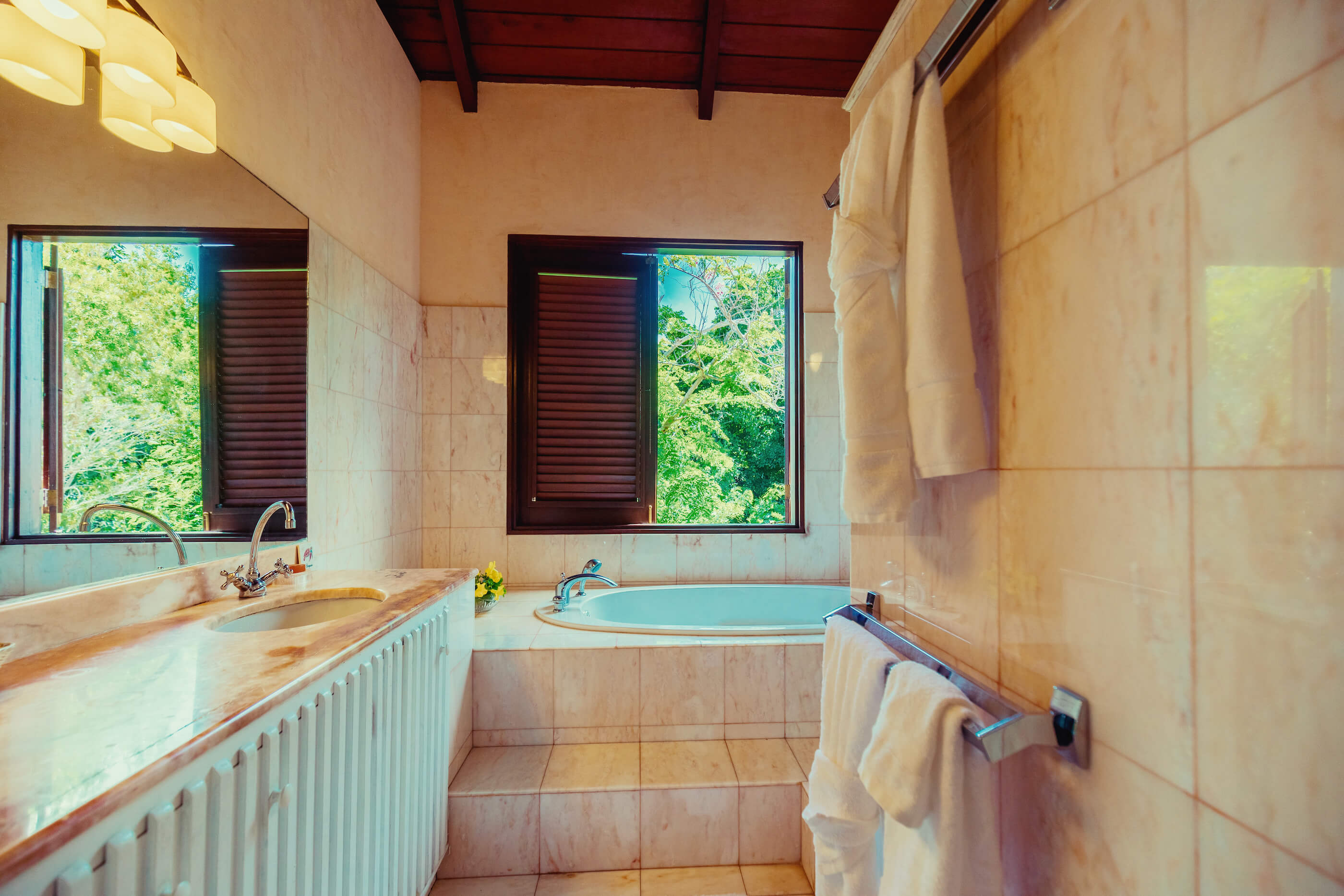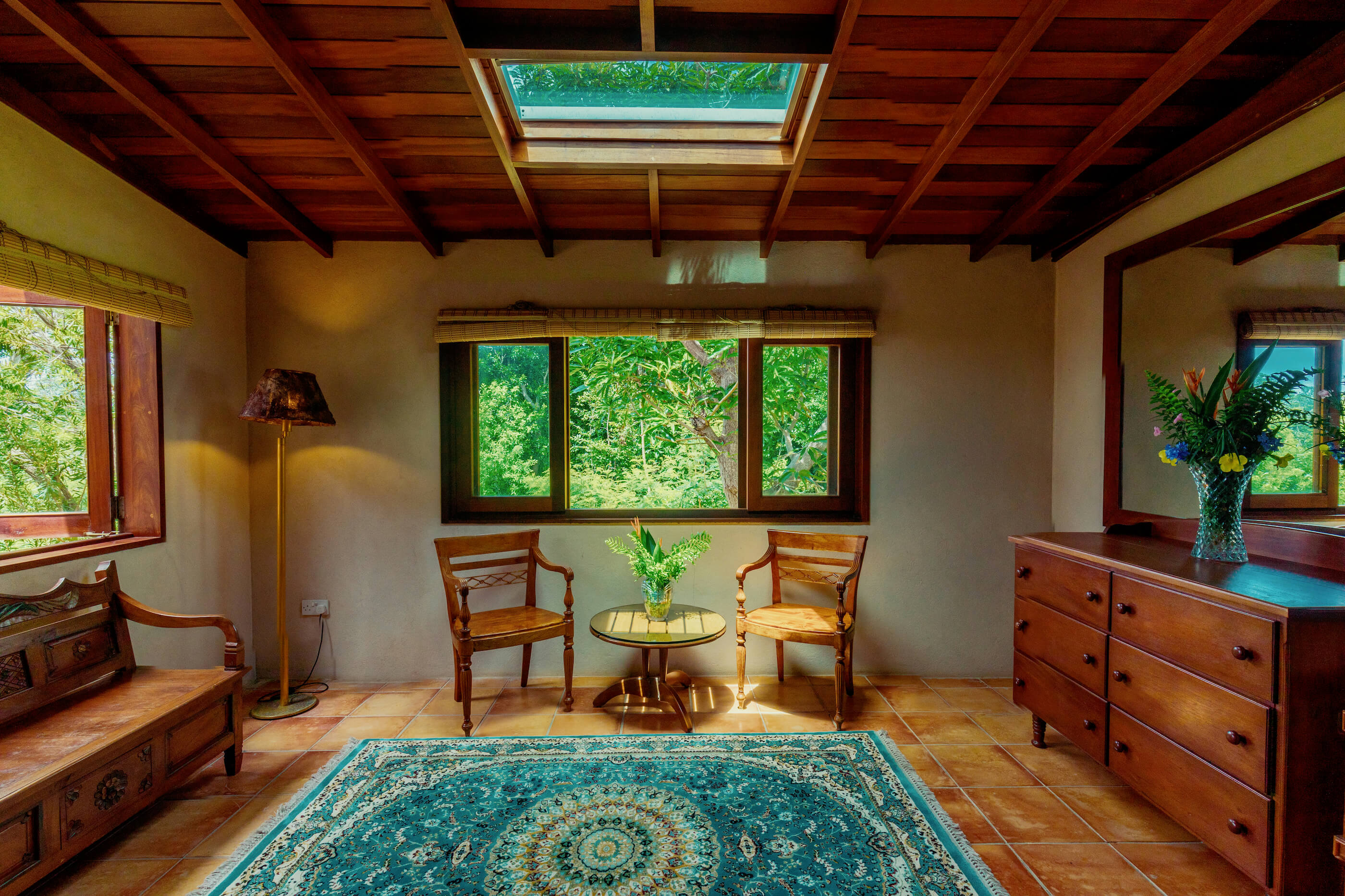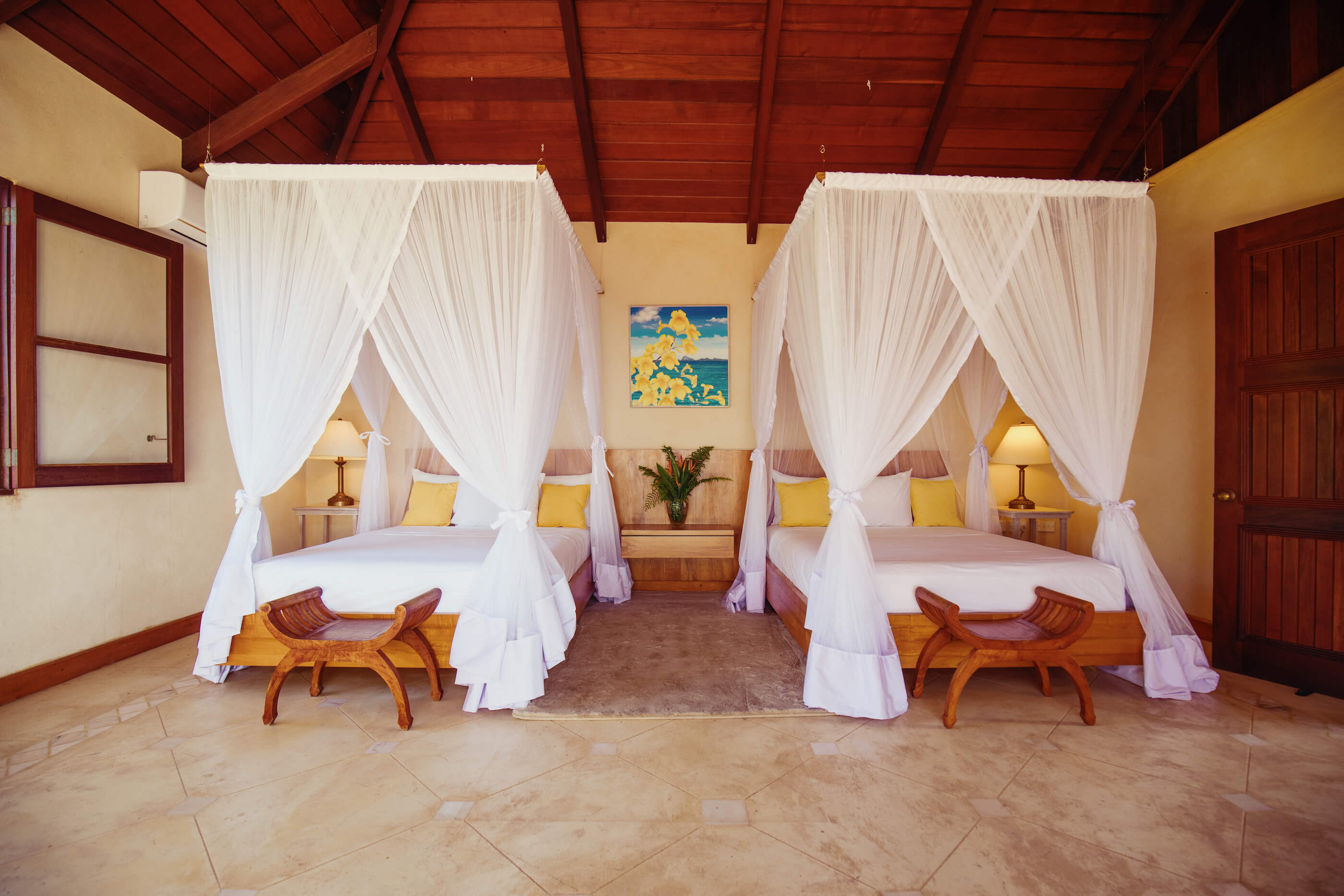 Villa Helianthus has 4 large, luxurious bedrooms each with it's own spacious and stylish bathroom. Classically decorated with high vaulted ceilings and cooling fans, beautiful spacious beds and stunning views. Three of the bedrooms have air conditioning along with the lounge. A standing aircon unit is available for the 4th bedroom along with ceiling and standing fan if required.
