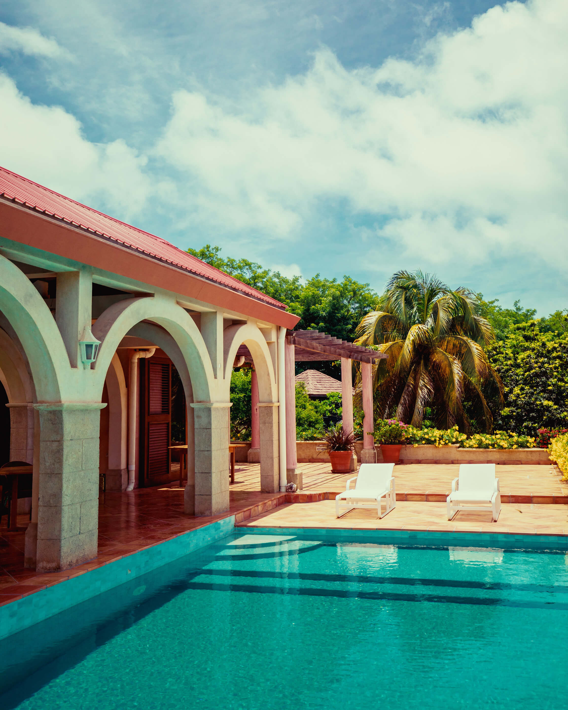 The living room is cool and beautifully furnished by the Italian and French interior designers who managed to mix their continental style with a Caribbean finish. There is satellite TV and Video, DVD, internet, telephone and fax providing all the modern amenities connecting you to the rest of the world whilst this beautiful villa preserves your privacy and escape. The expansive luxurious white sofas stretch around the living room for your total relaxation whilst the tall vaulted ceilings maintain a cool and serene atmosphere.