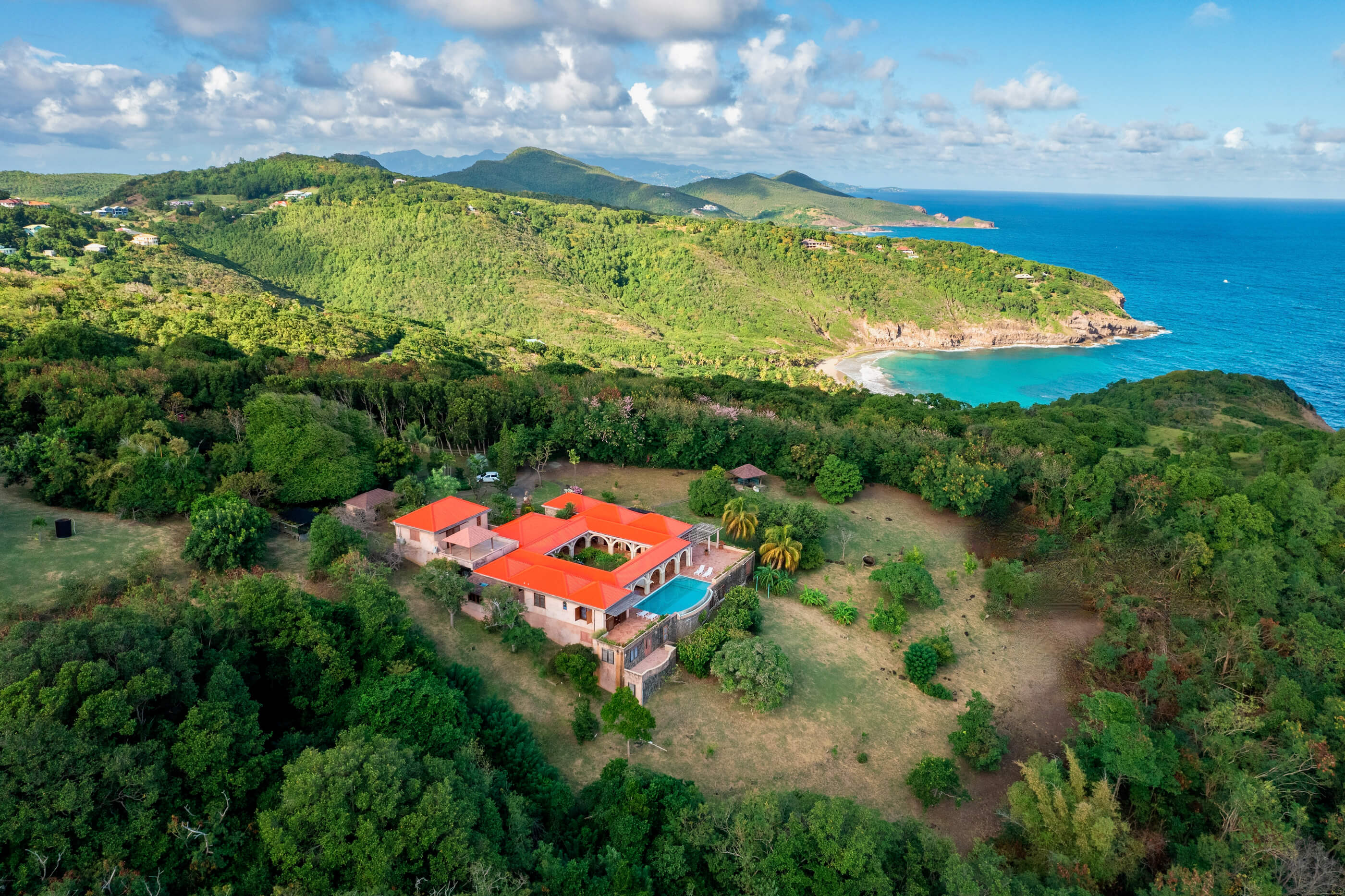 Villa Helianthus enjoys unique privacy, nestled luxuriously in 9 acres of mature cedars, mahogany & fruit trees. This stunning classical villa boasts breathtaking scenery, with an uninterrupted panoramic Caribbean Sea views. The secluded location offers simply the sounds of the tropical breezes blowing through the trees, the local birds in the established gardens that surround this fabulous villa and the distant sounds of the surf below. Each day mornings begin with sunrise over the untouched islands Balliceaux and Battowia to the East, ending with beautiful sunsets reflecting off the island of opulance that is Mustique to the South.