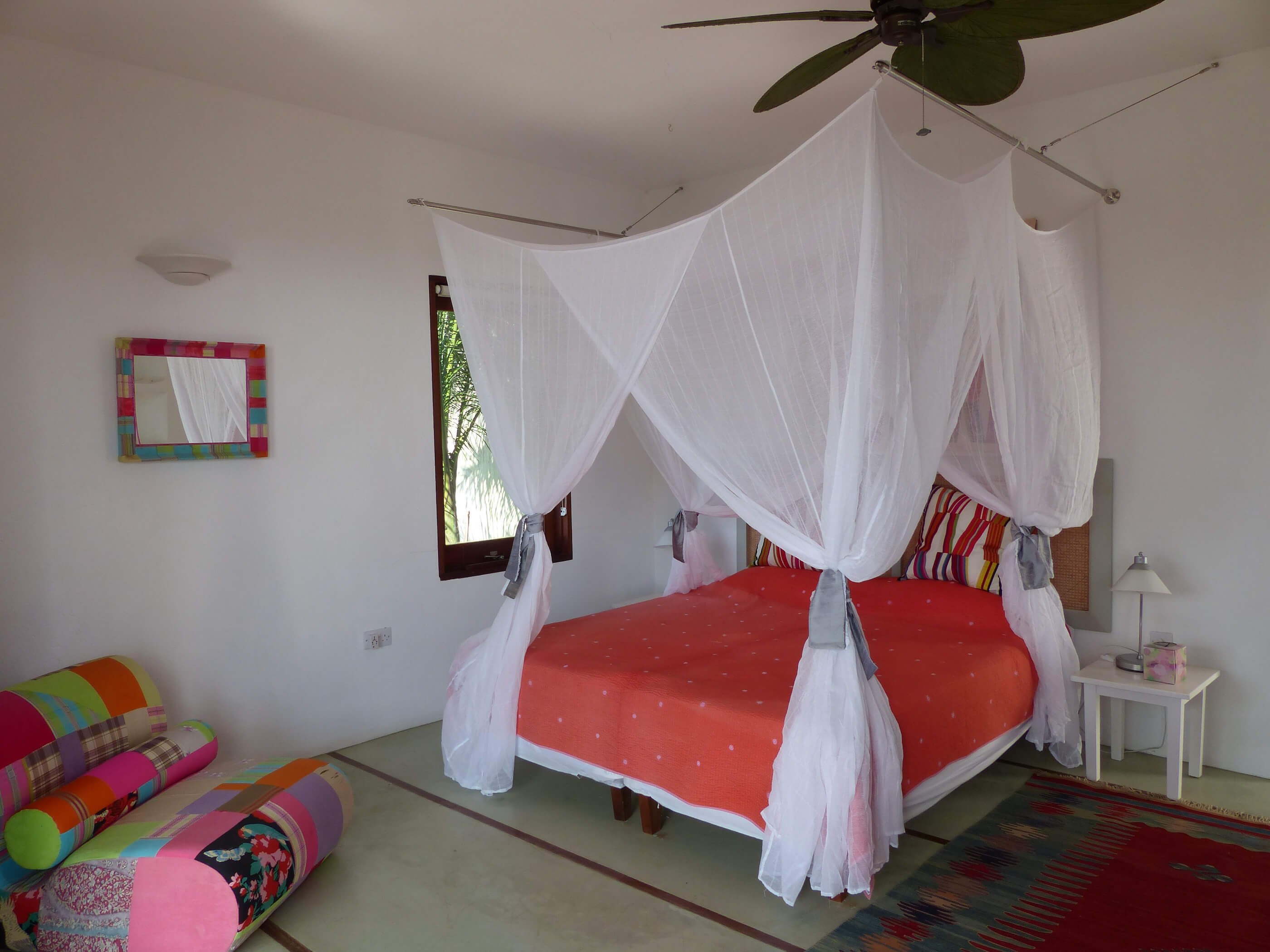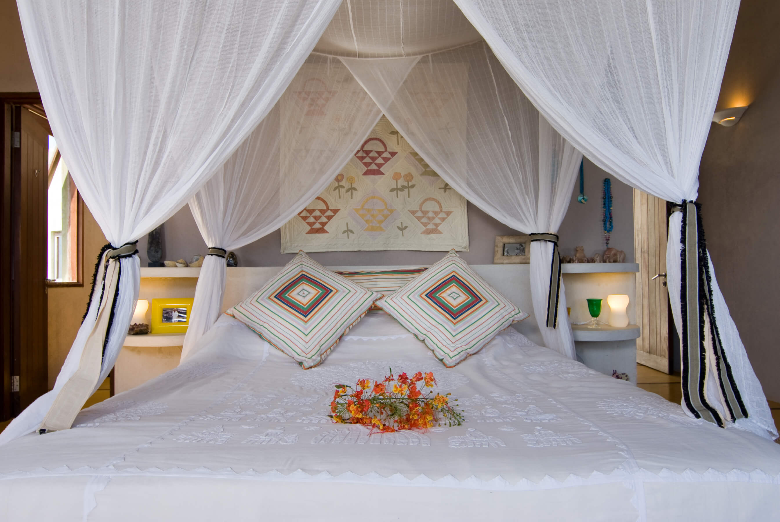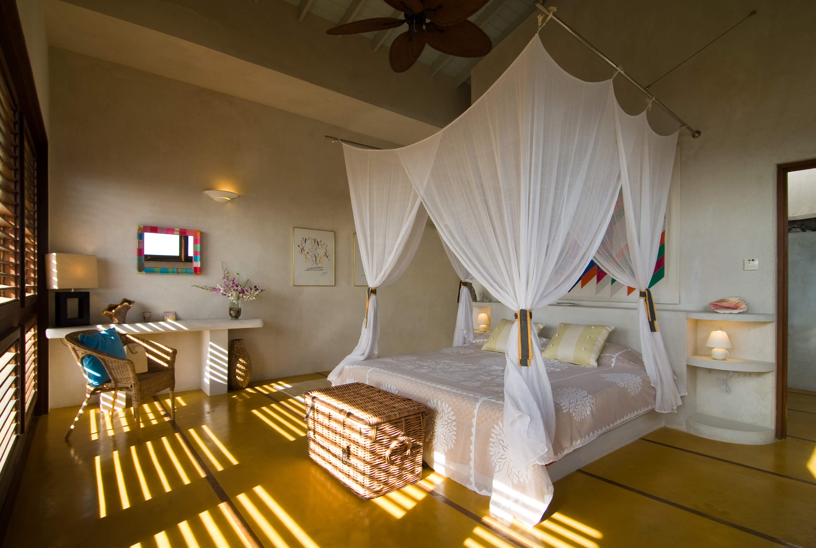 Mangwana's six cool and breezy bedrooms are large and versatile. Two have king-sized beds whilst the remaining four have twin beds, all of the twins can be locked together as doubles. Five of the six bedrooms have their own en suite bathrooms; two of them open up to the night skies. All bedrooms have their own private balcony, some overlooking the pool, others looking outwards over the ever-changing seascape.