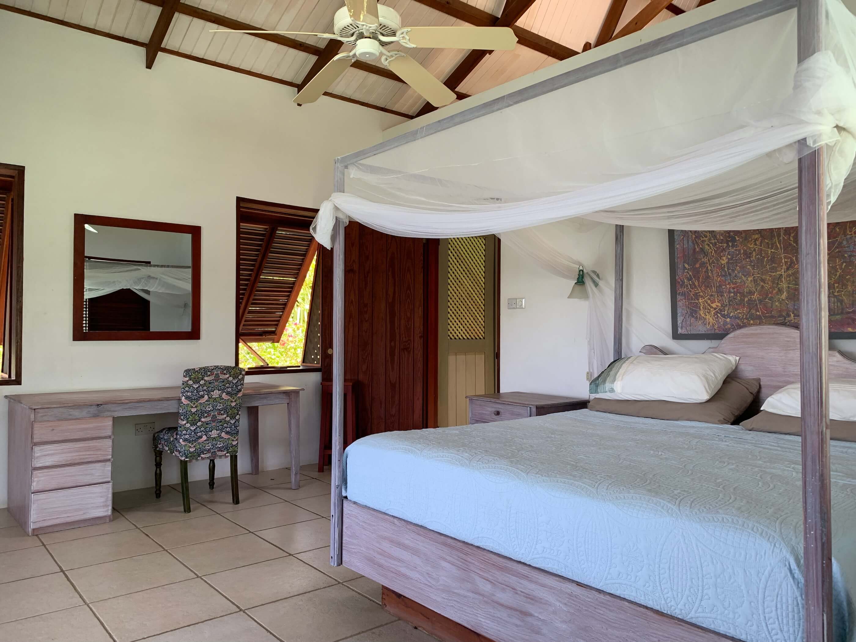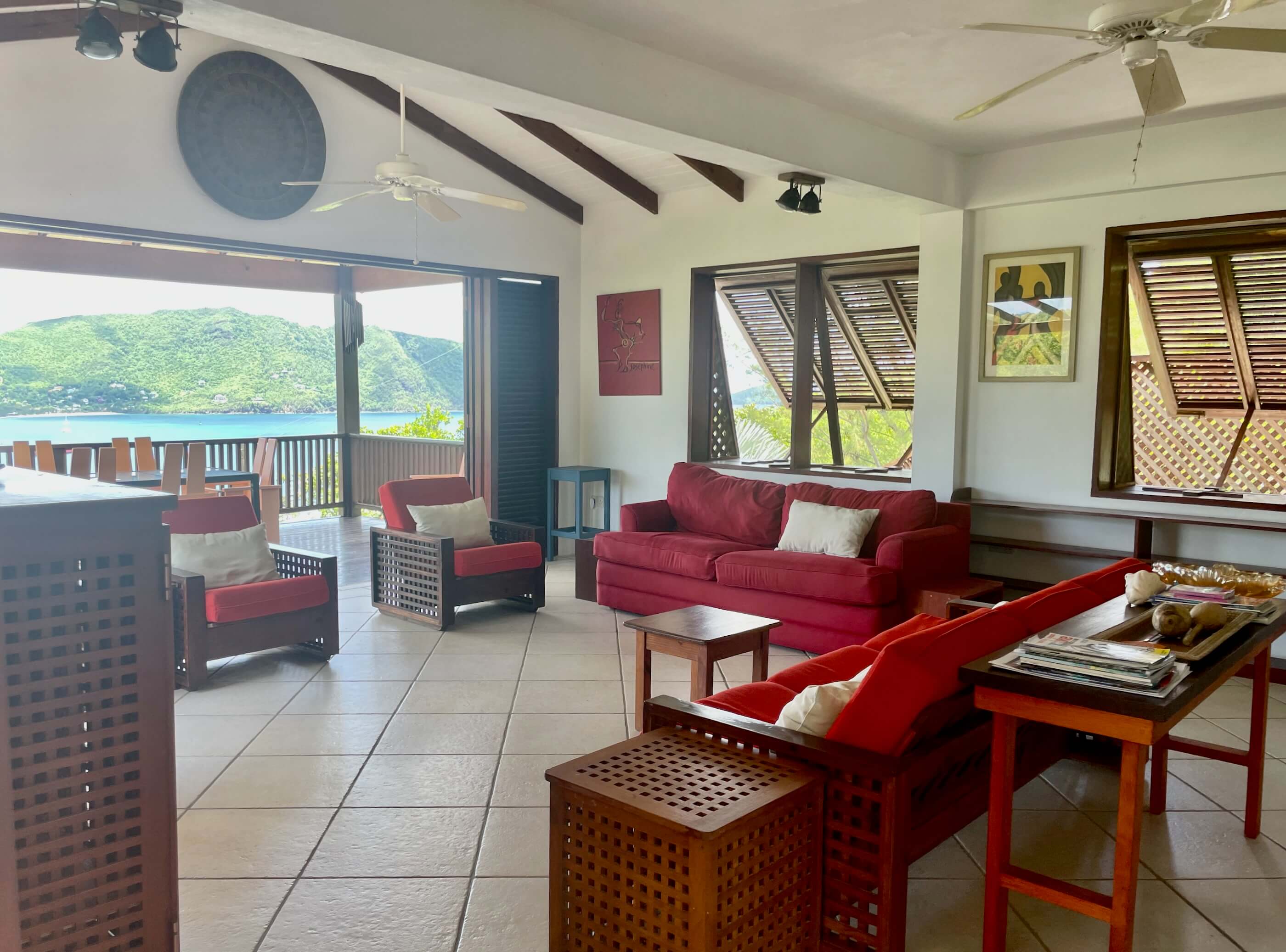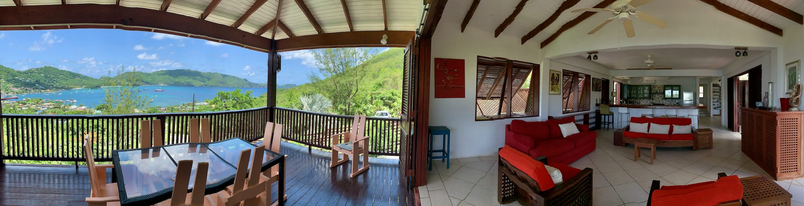The massive kitchen has wooden countertops, a US style fridge and plenty of space for food preparation. Sublime harbour views can be glimpsed via the refreshing louvred windows and the temperature remains cool via the light, tiled floors and high ceilings. All the windows and doors can be thrown open to introduce further refreshment via the constant trade winds that embrace the island. A breezy hillside location and all the wooden louvre windows & doors always letting air in means air con is not required.