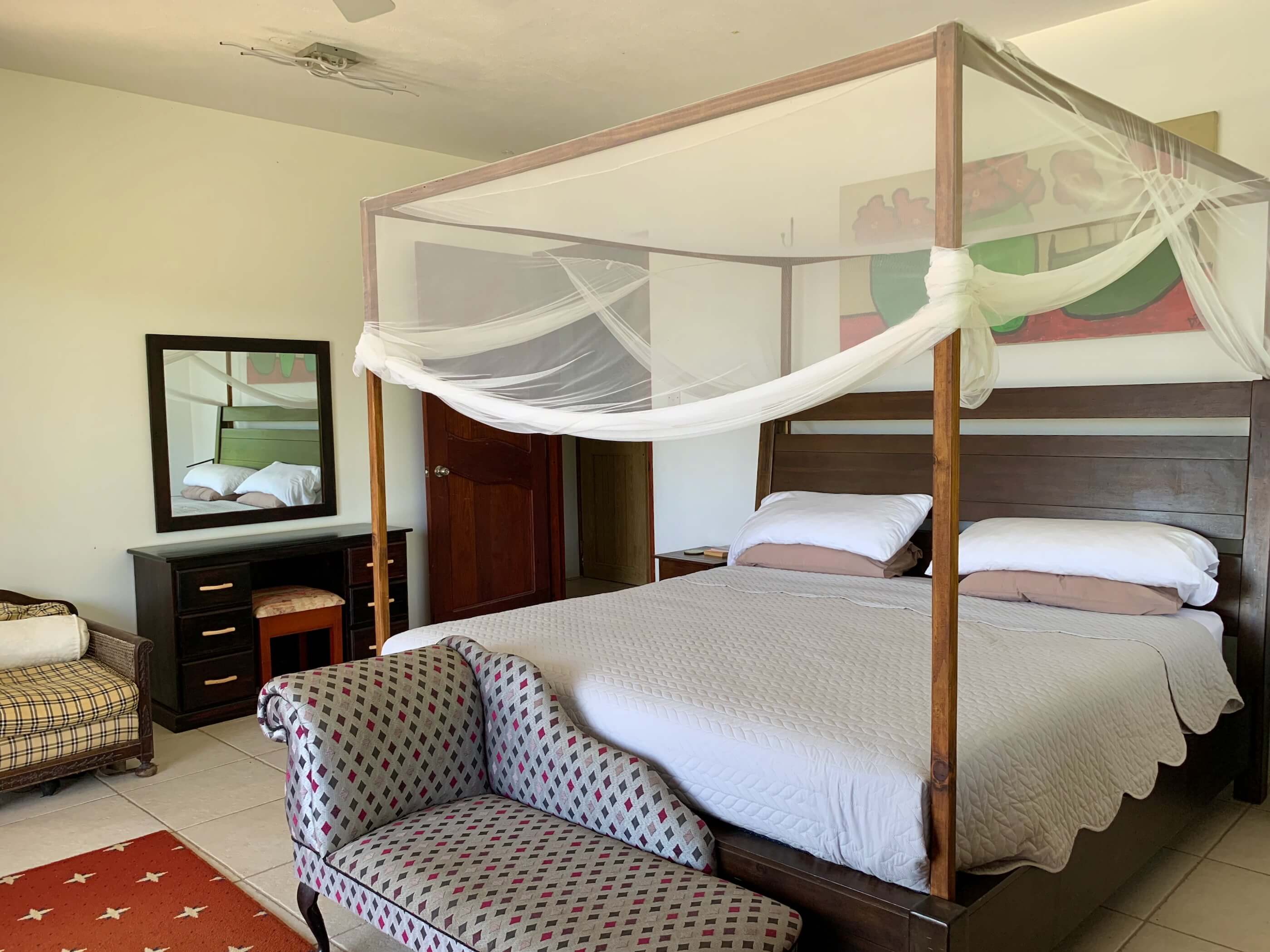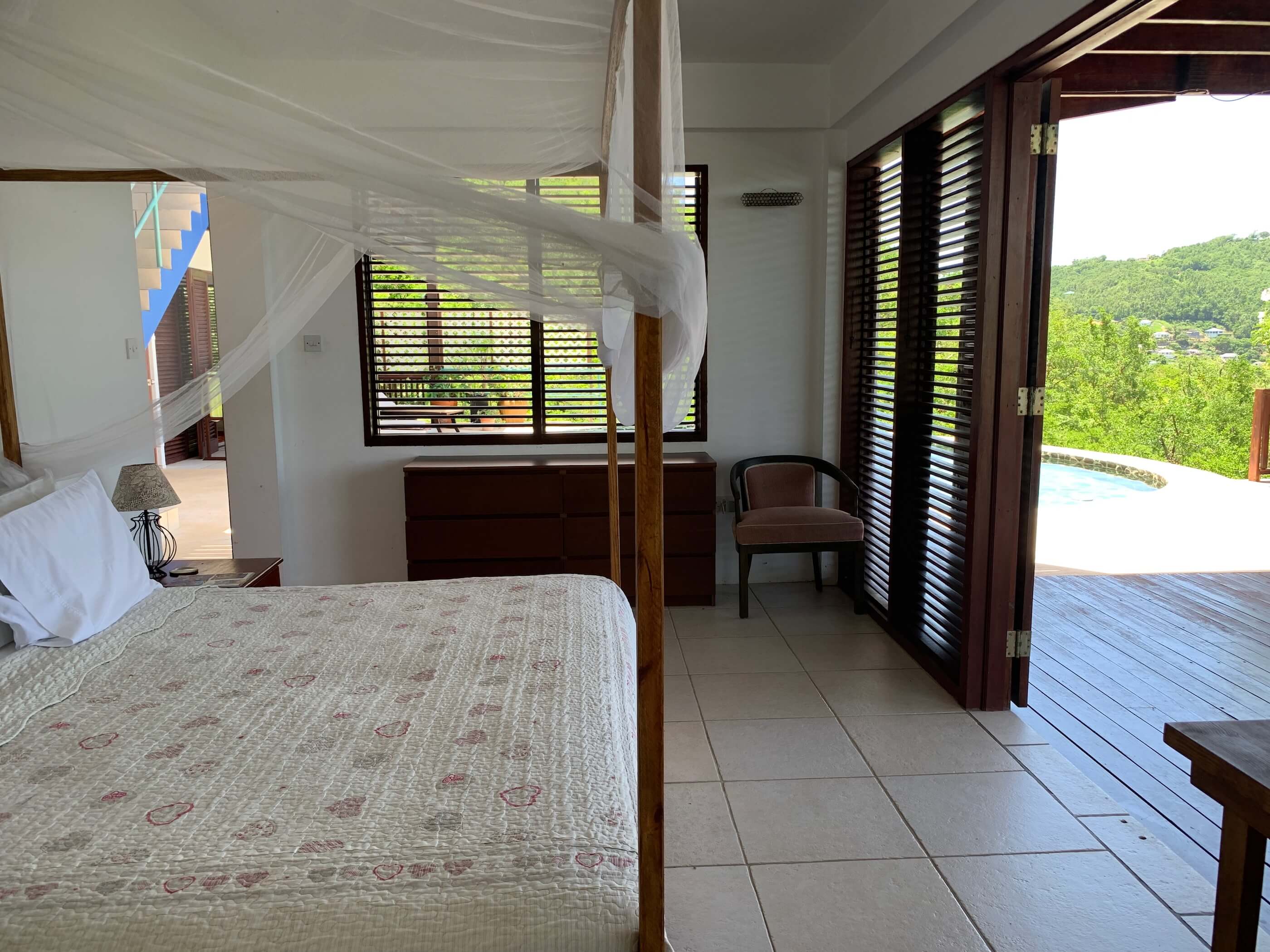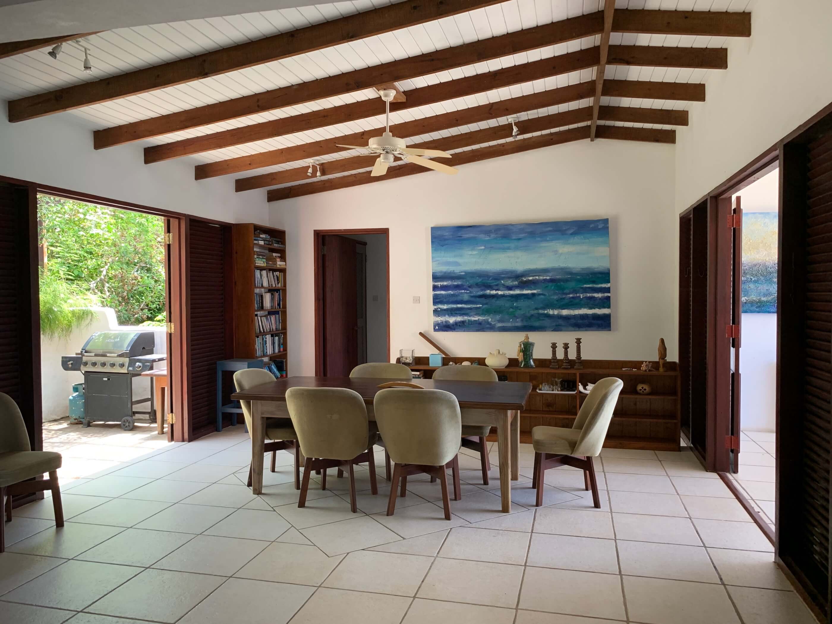 The massive kitchen has wooden countertops, a US style fridge and plenty of space for food preparation. Sublime harbour views can be glimpsed via the refreshing louvred windows and the temperature remains cool via the light, tiled floors and high ceilings. All the windows and doors can be thrown open to introduce further refreshment via the constant trade winds that embrace the island. A breezy hillside location and all the wooden louvre windows & doors always letting air in means air con is not required.
