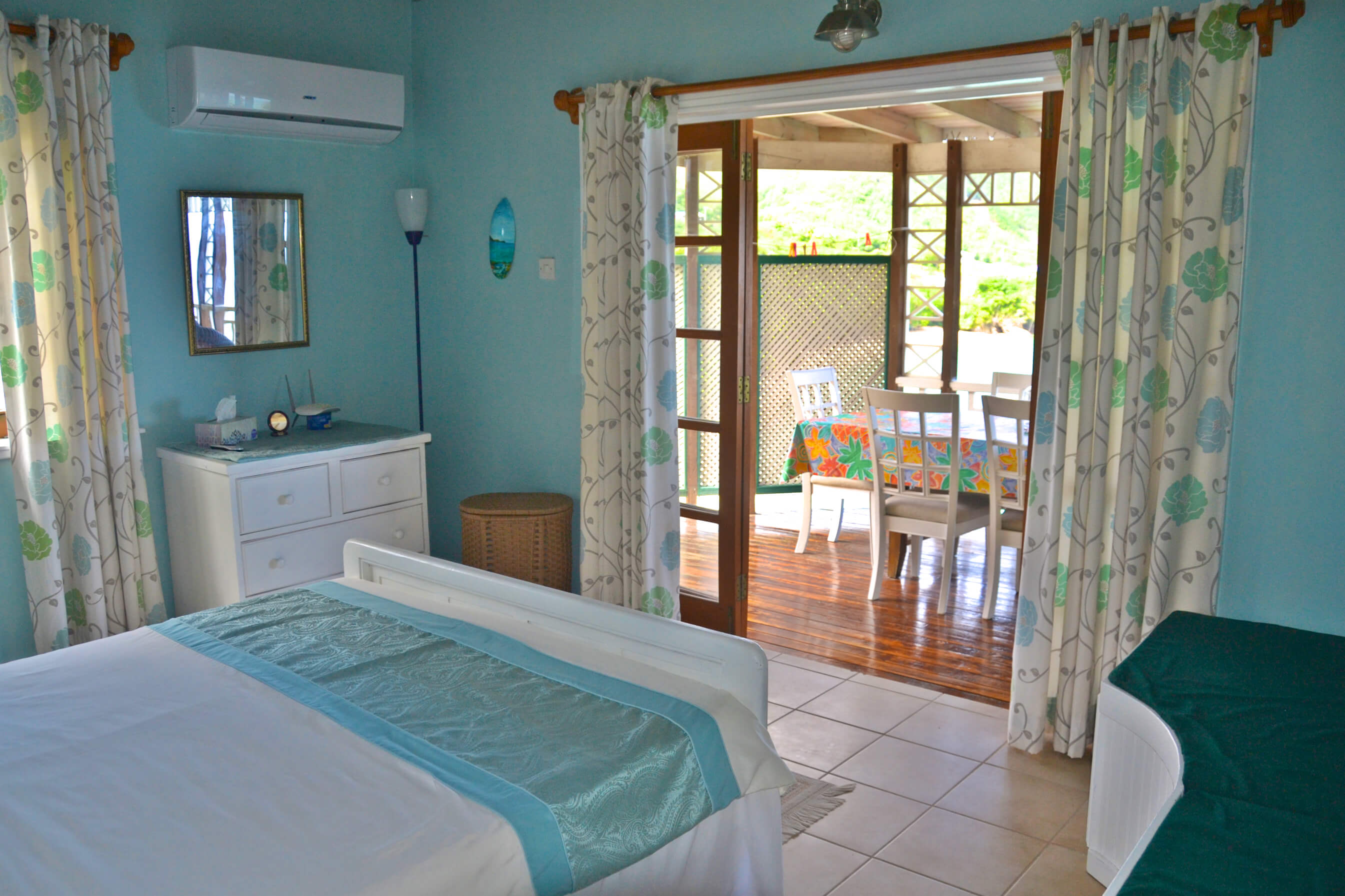 The living area is open plan and comfortable, with TV and board games to keep you entertained, after a hard day of Bequia exploring! This villa is a short taxi ride (water or land taxi) or 10 minute walk from the bustling Port Elizabeth Harbour, and from here you can arrange many activities, as well as day cruises to places like the fabulous Tobago Cays, or Mustique. The living area has large double doors that open out onto the balcony with large daybed to relax on, giving a nice breeze and feeling of space. There is WiFi available on the balcony.