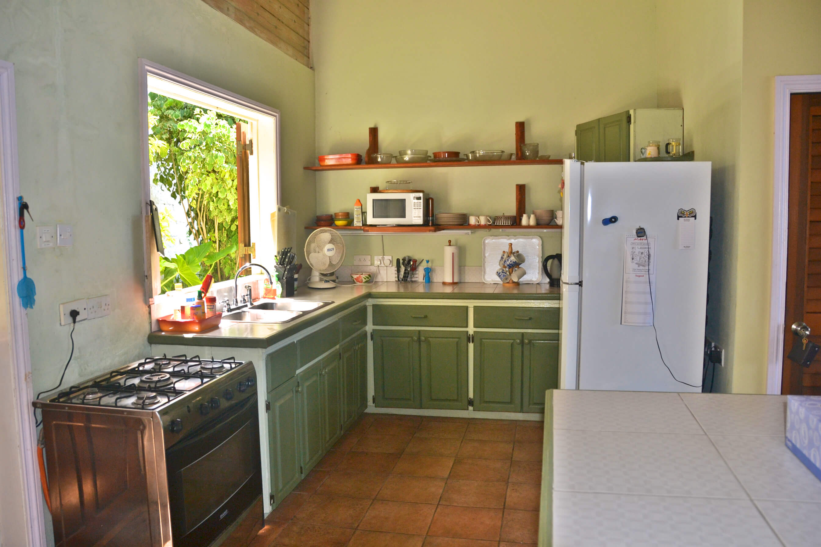 The open plan kitchen and dining area with breakfast bar is spacious and well equipped with all you will need during your Bequia vacation. There are large fans installed in the high beamed ceilings, to keep you cool and feeling refreshed whilst you eat. There is also a simple outside dining area.