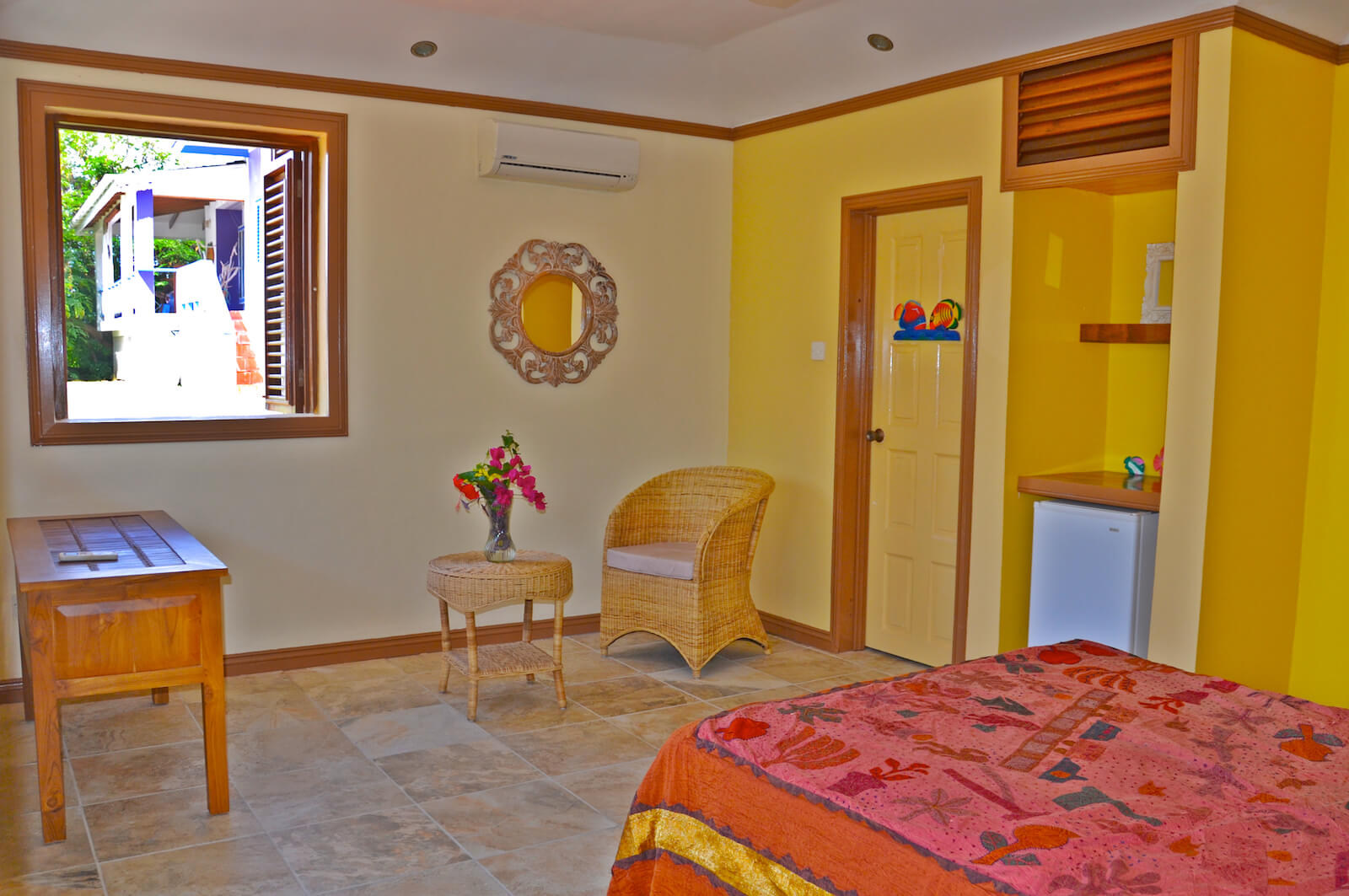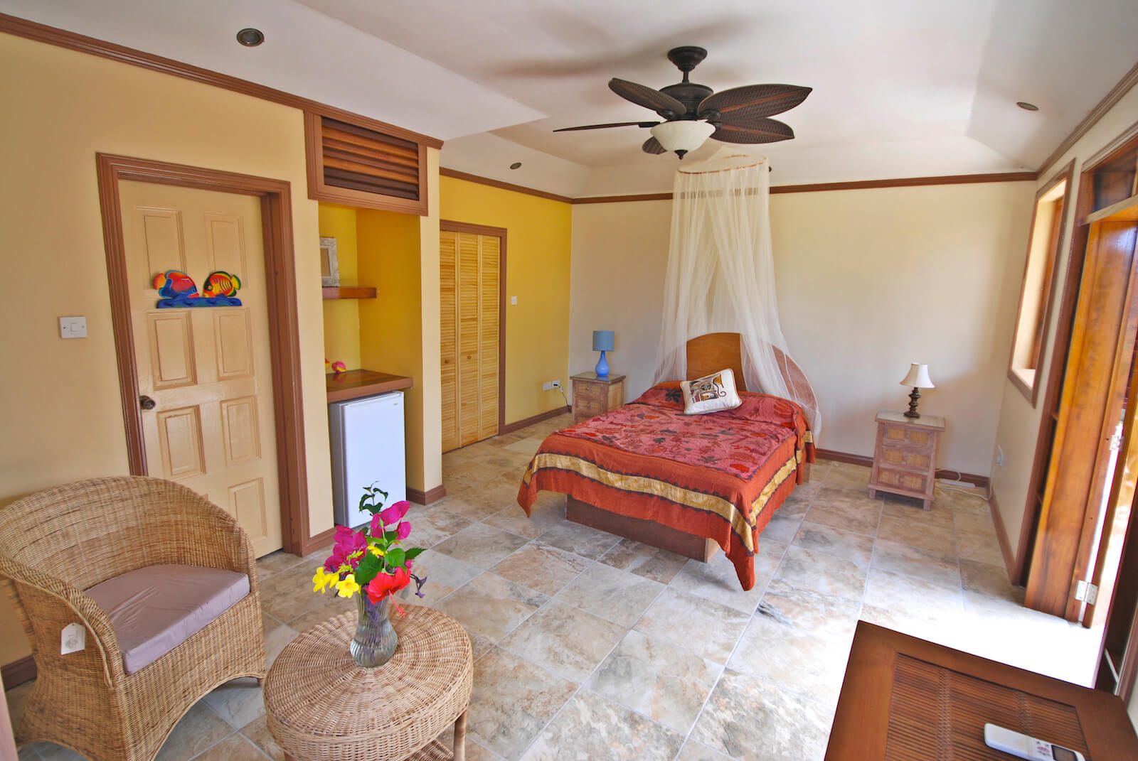 The guests at Princess Hill Villa benefit from the newly renovated Garden Suite that has AC, modern bathroom, vented shutters and walk in closet. It also has a private porch and garden views: intimate and a little removed.