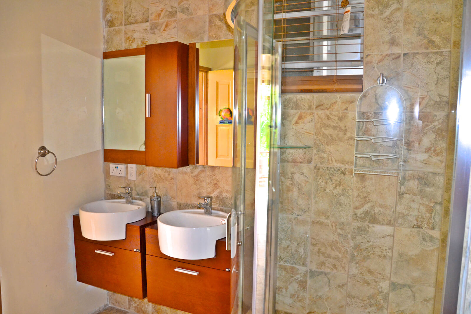 Downstairs there is a bedroom/bathroom suite with twin sinks and a small frig. It has an open plan studio look with a covered porch facing the tropical gardens. This ground floor level offers additional privacy and was recently renovated throughout, with hand made wooden shutters and attractively tiled floors.
