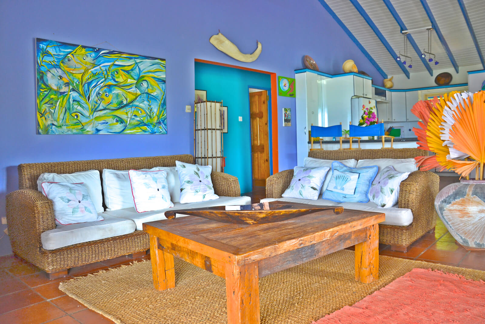 The interior styling of Princess Hill Villa offers a comfortable mix of chunky, rattan and wooden furniture and soft, earthy colours. The floors have been tiled throughout and the ceilings are high, which maintains a cool atmosphere throughout. Vented doors and a roof cupola enhance the natural air flow.