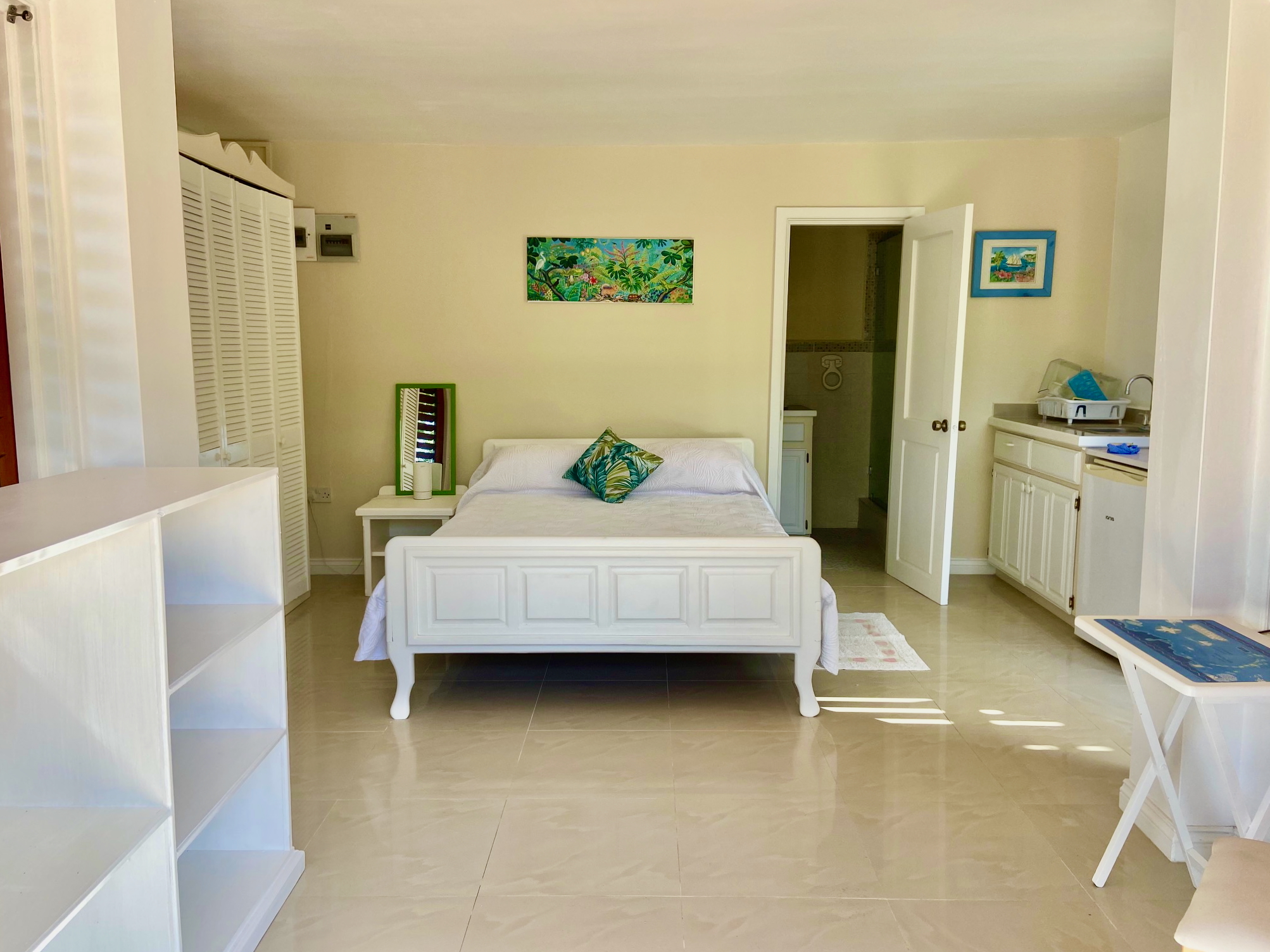 The upper level of Gumbo Limbo as two airy bedrooms (one double & one twin), both of which open out onto the balcony, so you can wake up and look out onto the wonderful views of the Princess Margaret Beach. The bedrooms also have lovely high wooden ceilings, and the breeze coming in from the open double doors keeps you nice and cool. There is also a comfortable double bed in the studio apartment, which also has large doors that open out onto the balcony.