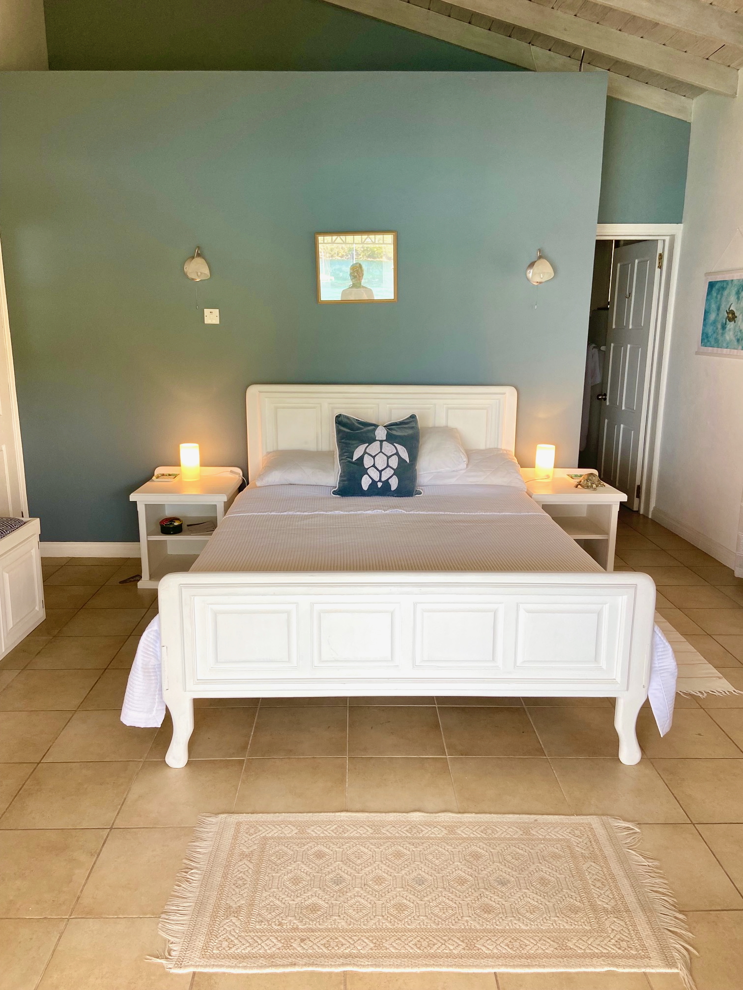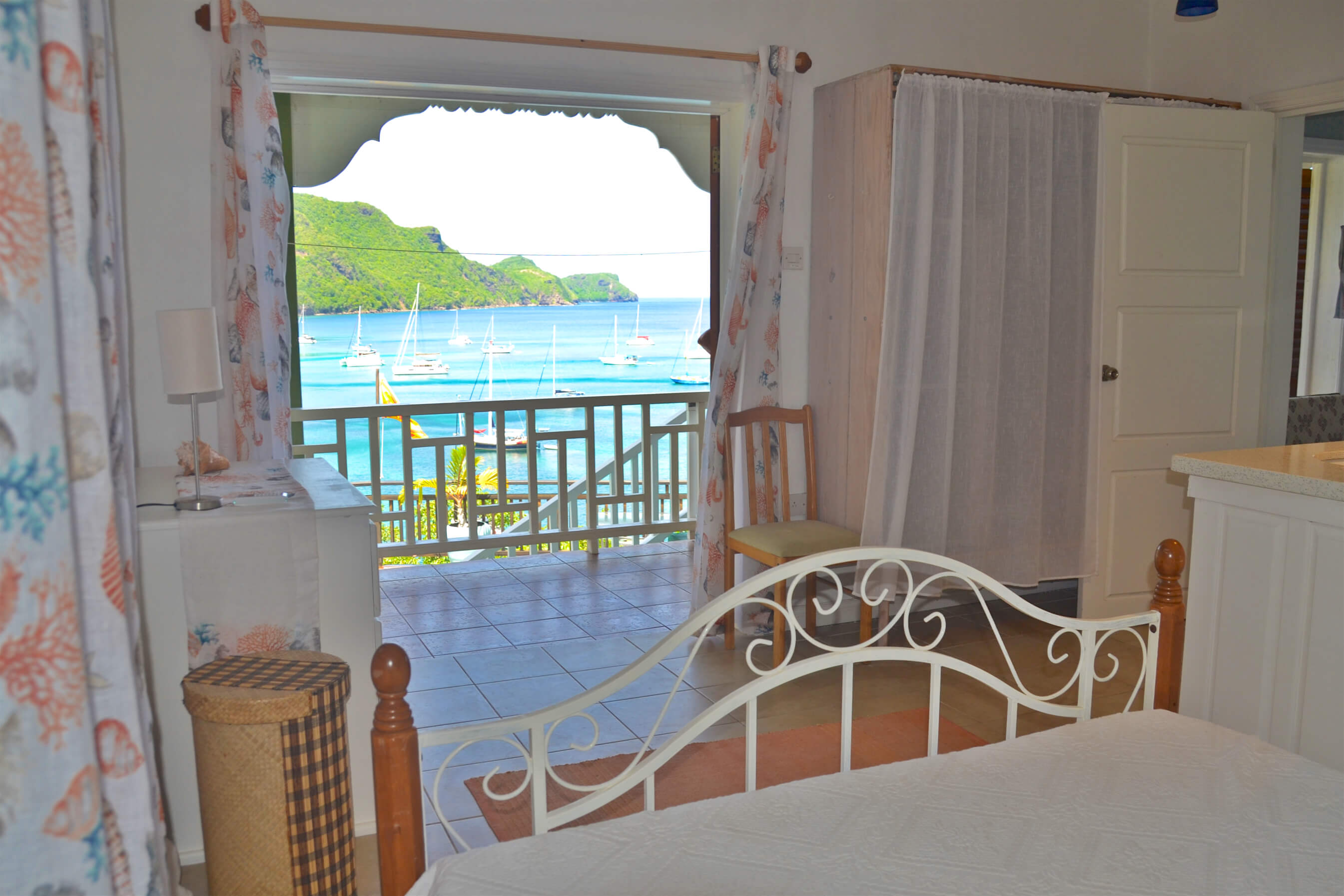 The living / dining / kitchen areas are all open plan and comfortable, with plenty of seating, a tv and board games to keep you entertained, after a hard day of Bequia exploring! Large double doors open up from the living area onto a large balcony with daybed and simply stunning views out over the bay.