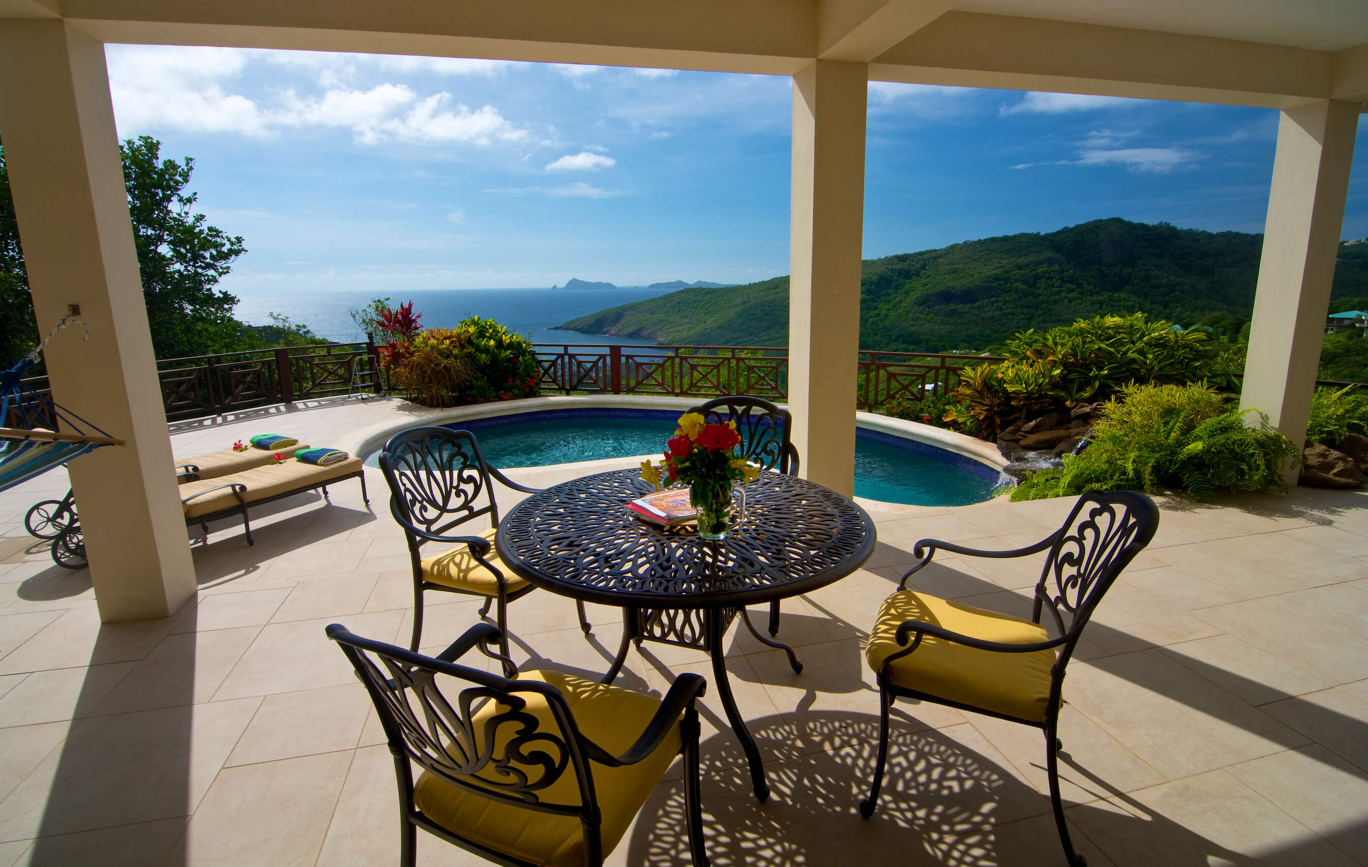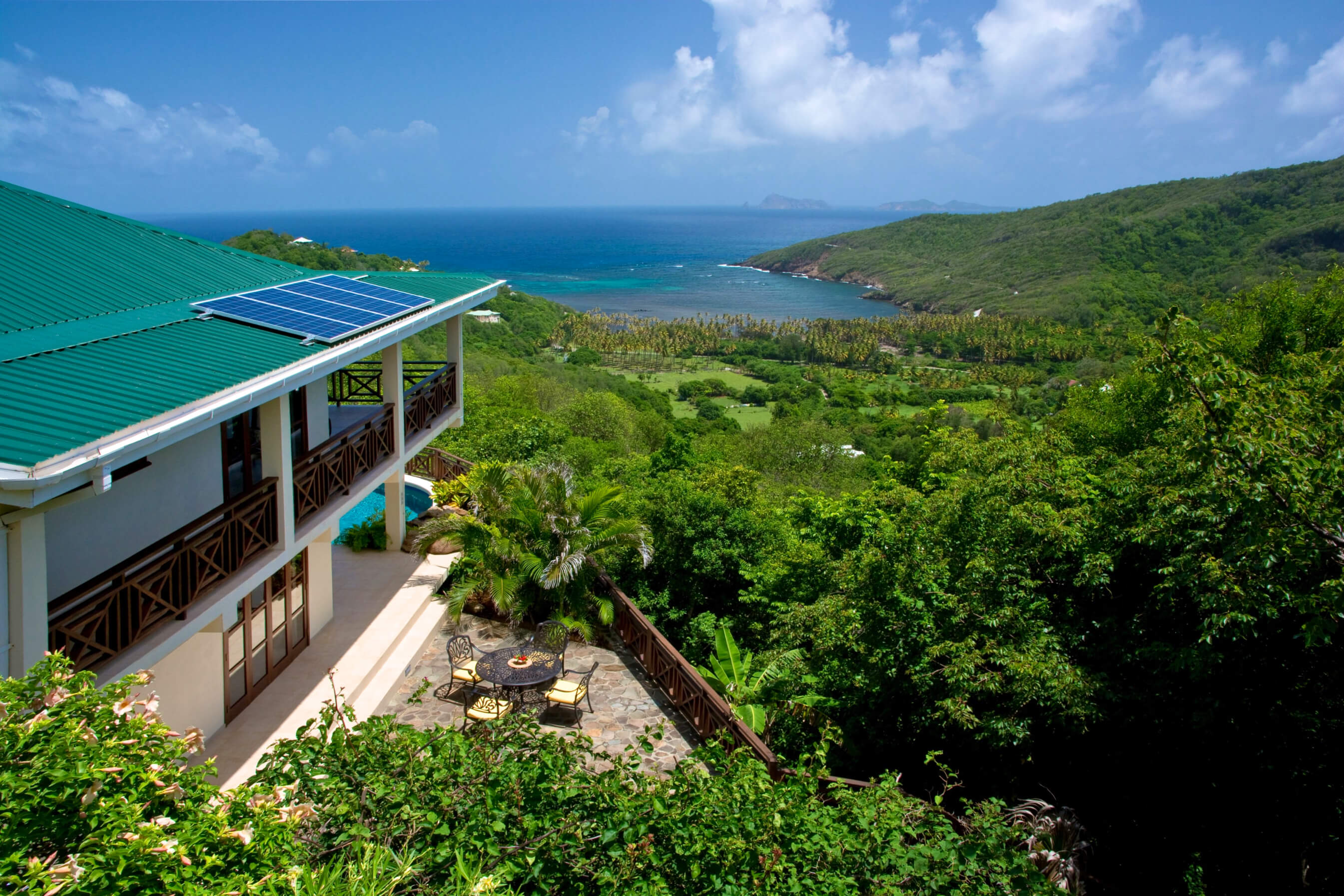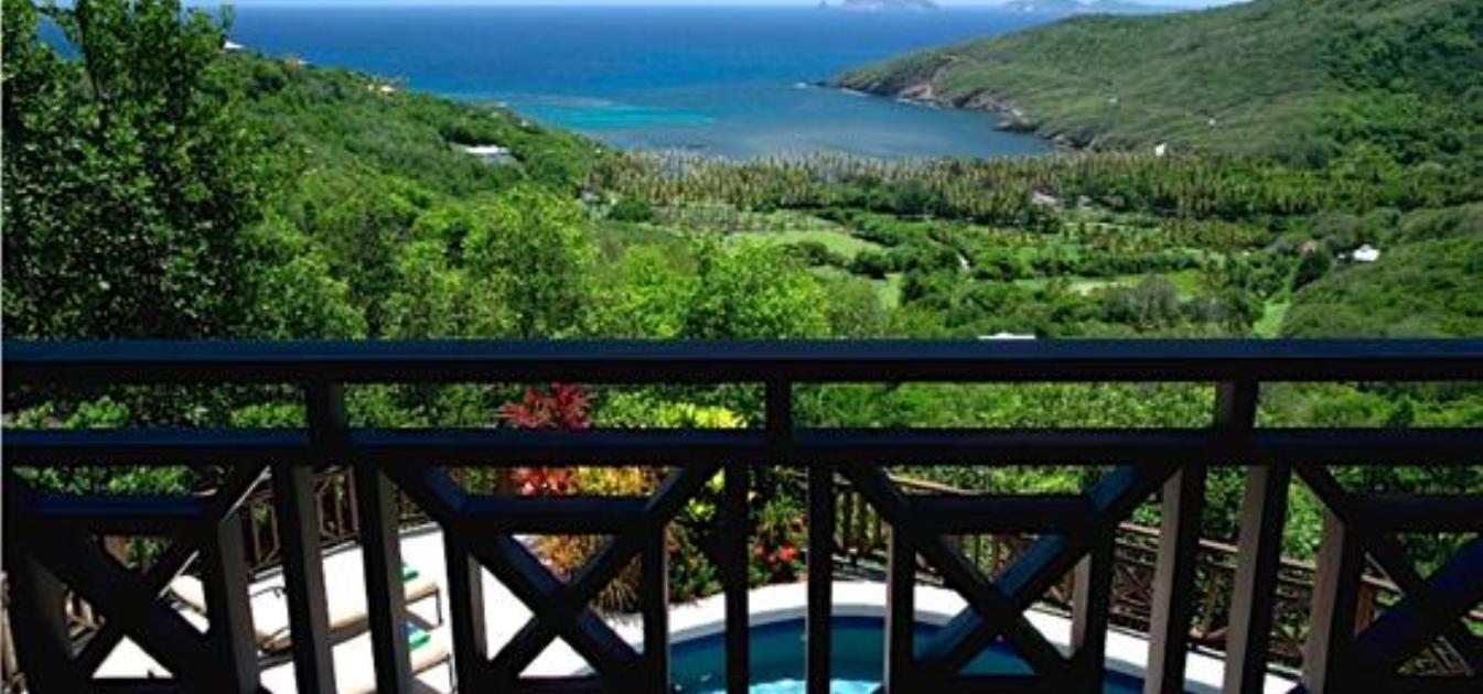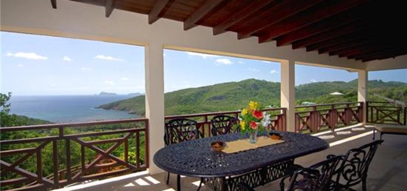 Bellevue Terrasse is set up high overlooking the lush green tree-covered canopy beneath which leads out to the beautiful blue ocean and onto Spring Bay beyond. The islands of Battowia and Baliceaux are to be seen on the horizon.