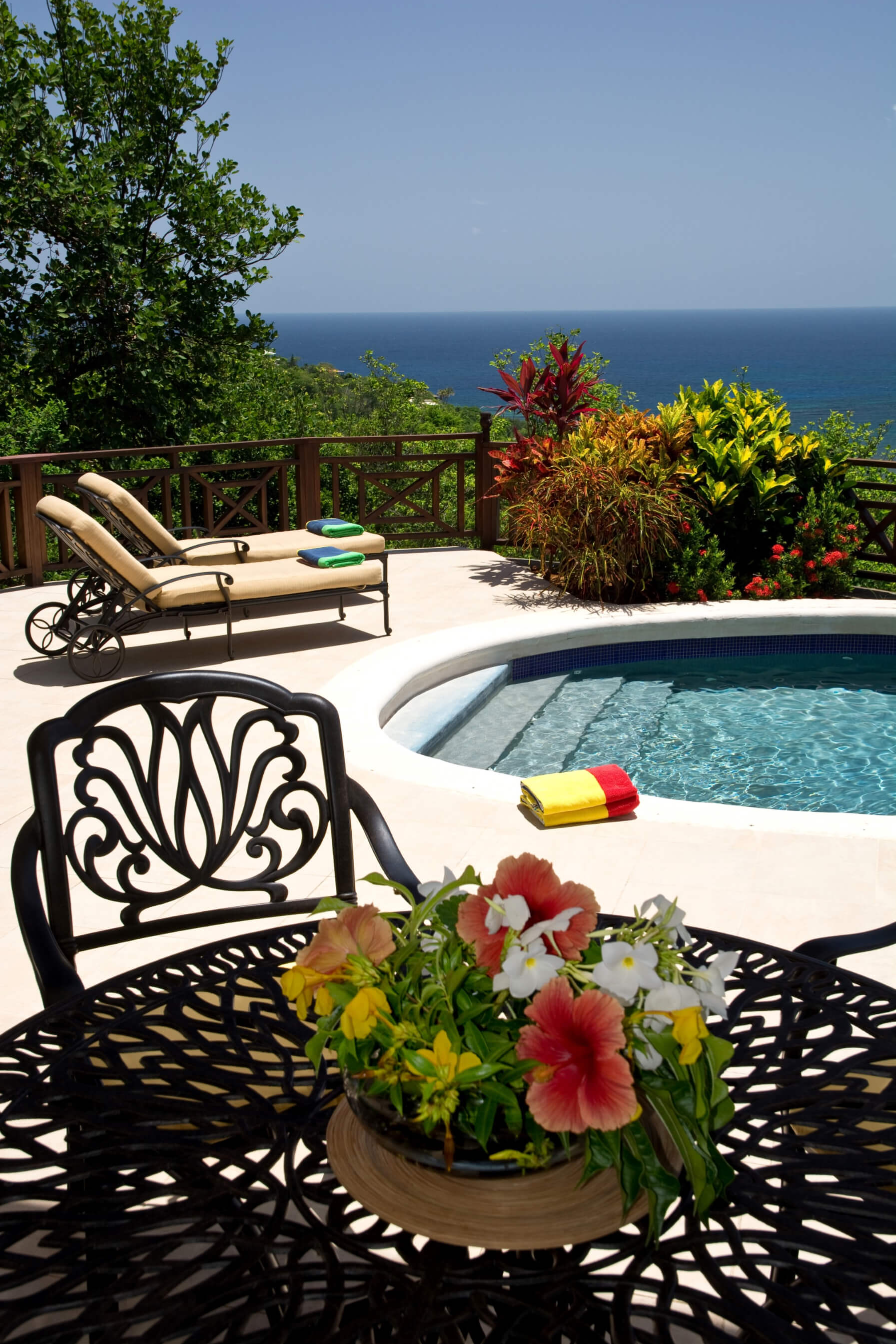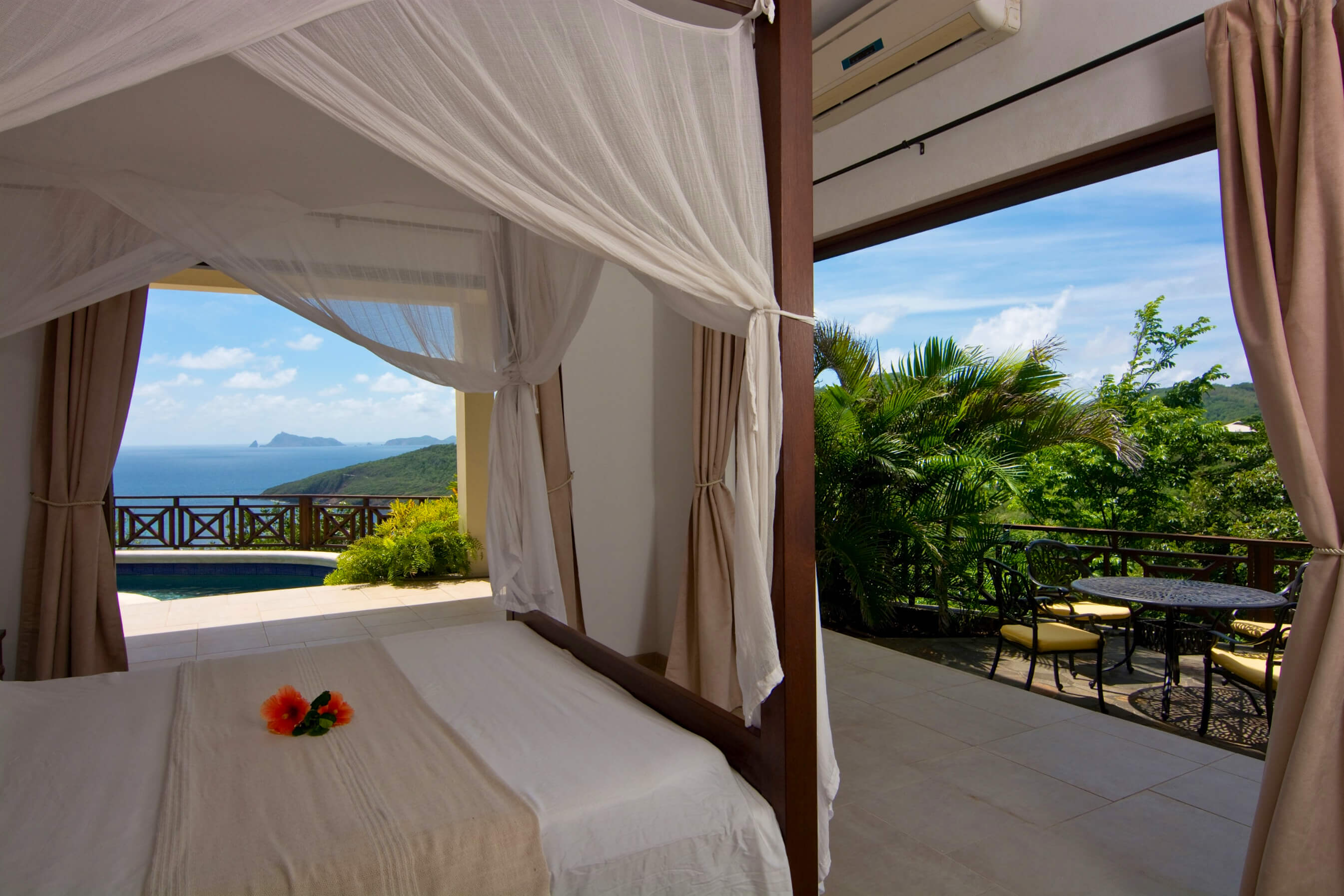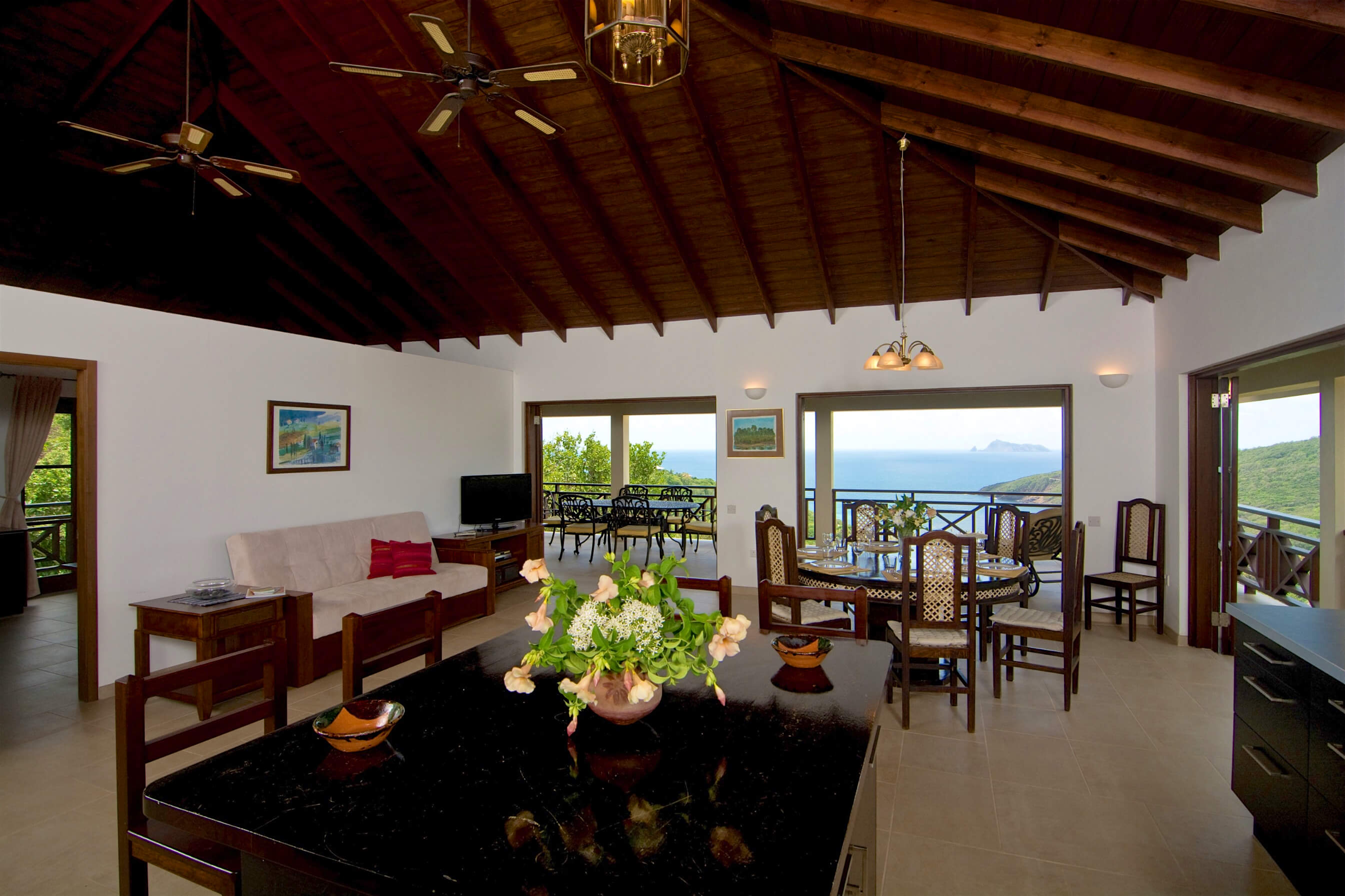 Bellevue Terrasse is set up high overlooking the lush green tree-covered canopy beneath which leads out to the beautiful blue ocean and onto Spring Bay beyond. The islands of Battowia and Baliceaux are to be seen on the horizon.