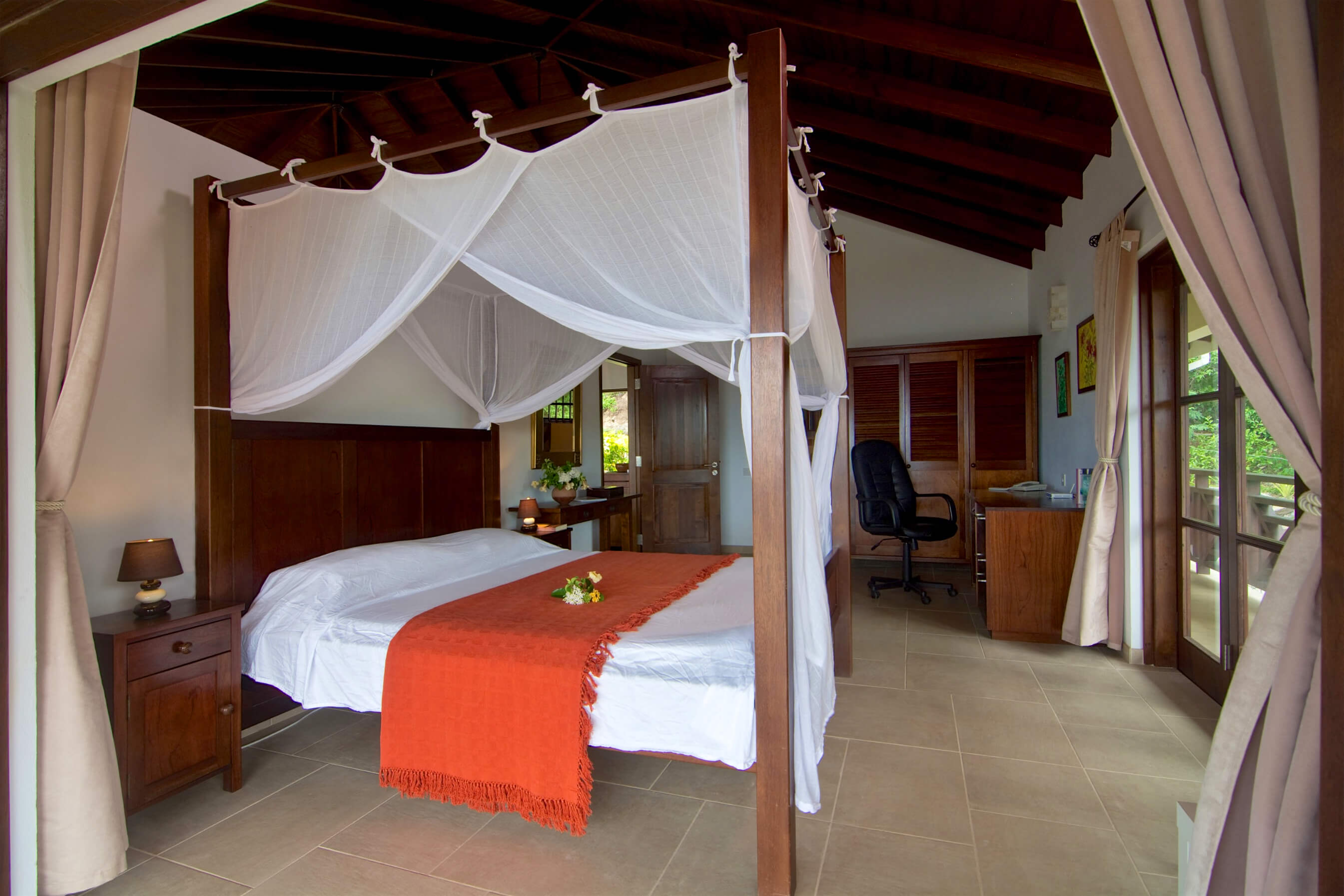 The architecture is based on the traditional tropical island concept of open spaces, surrounded by generous verandahs and covered by a spacious roof structure, which is most popular in the Grenadine Islands. Built by craftsmen from the island and from a variety of local materials, the ceramic tiles from Italy, the enchanting alabaster lamps and the artwork from Latin America are all blending in in harmony.
