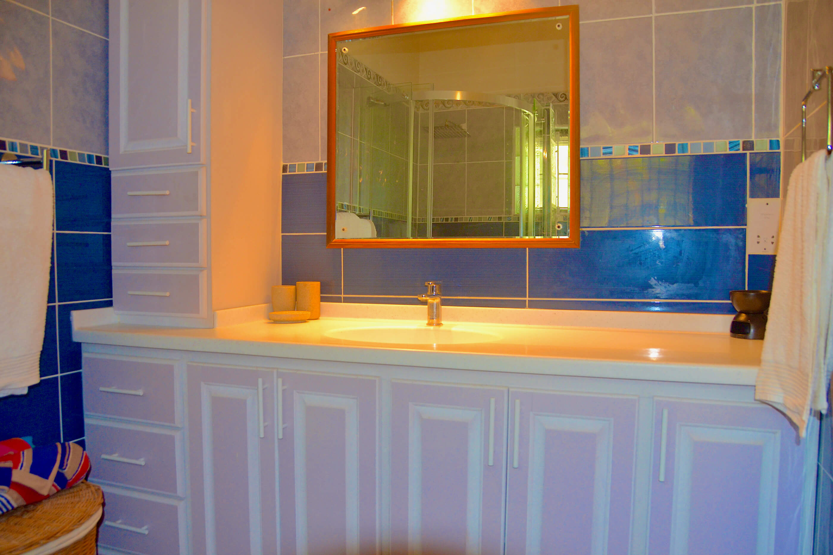 Villa Santa Maria has 3 good sized bedrooms, with high wooden ceilings and decorated in calm, refreshing colours. All 3 rooms are en suite and have mosquito nets, fans and air conditioning to keep you comfortable at night. Two of the rooms contain queen beds with the third containing 2 single beds. Relaxing spaces in which to recharge your batteries, ready for the next day of your Bequia vacation.