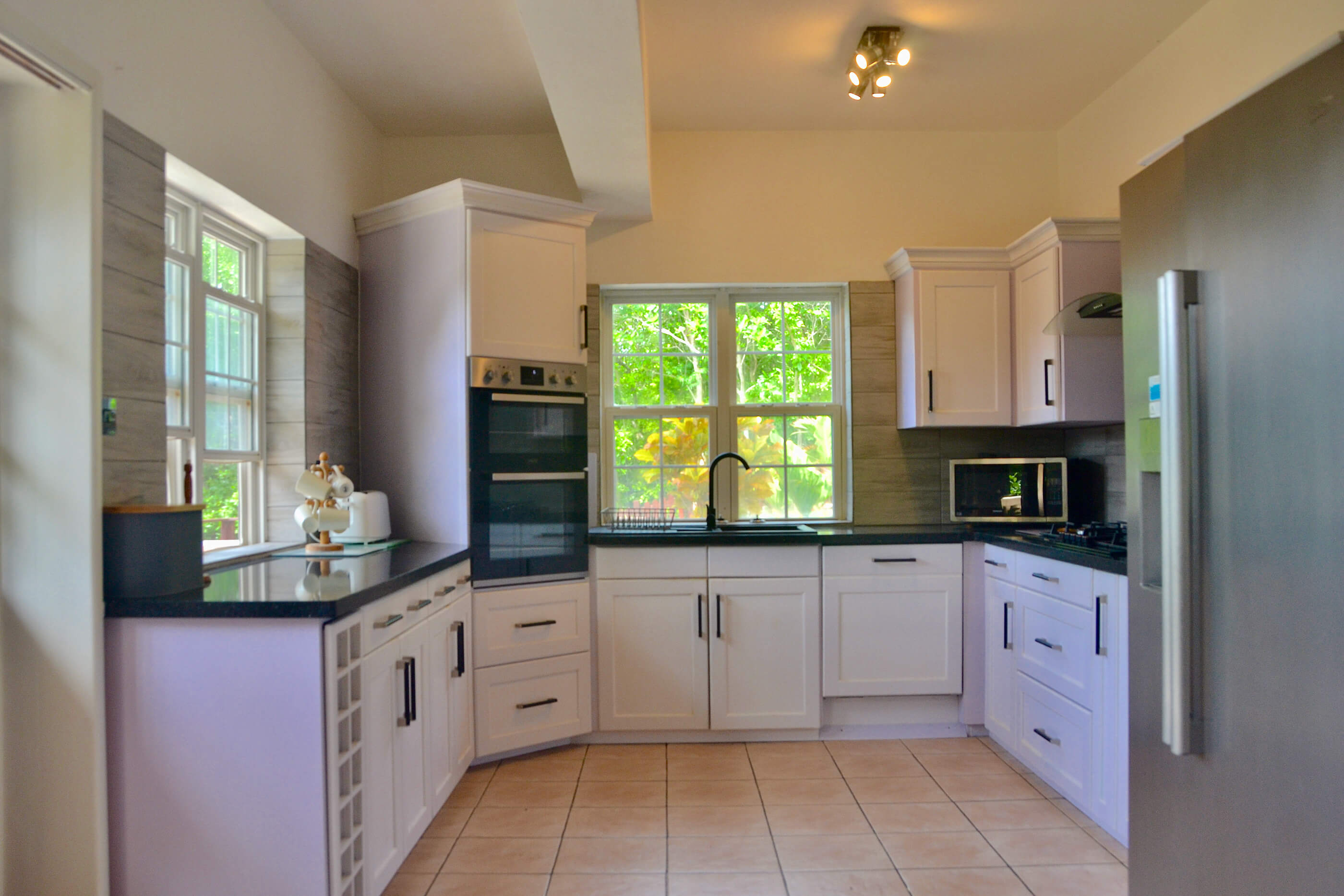 The open plan kitchen / dining room is located on the ground floor of the villa. The kitchen is a good size, and is very well equipped with all usual appliances and with plenty of surface space to prepare delicious Caribbean dinners. There is a microwave, oven, huge fridge freezer with ice machine, juicer & bread maker etc. The attached dining room is also spacious with a large dining table in the center, and again big double doors that open out onto the balcony, letting in a cool breeze as you dine.