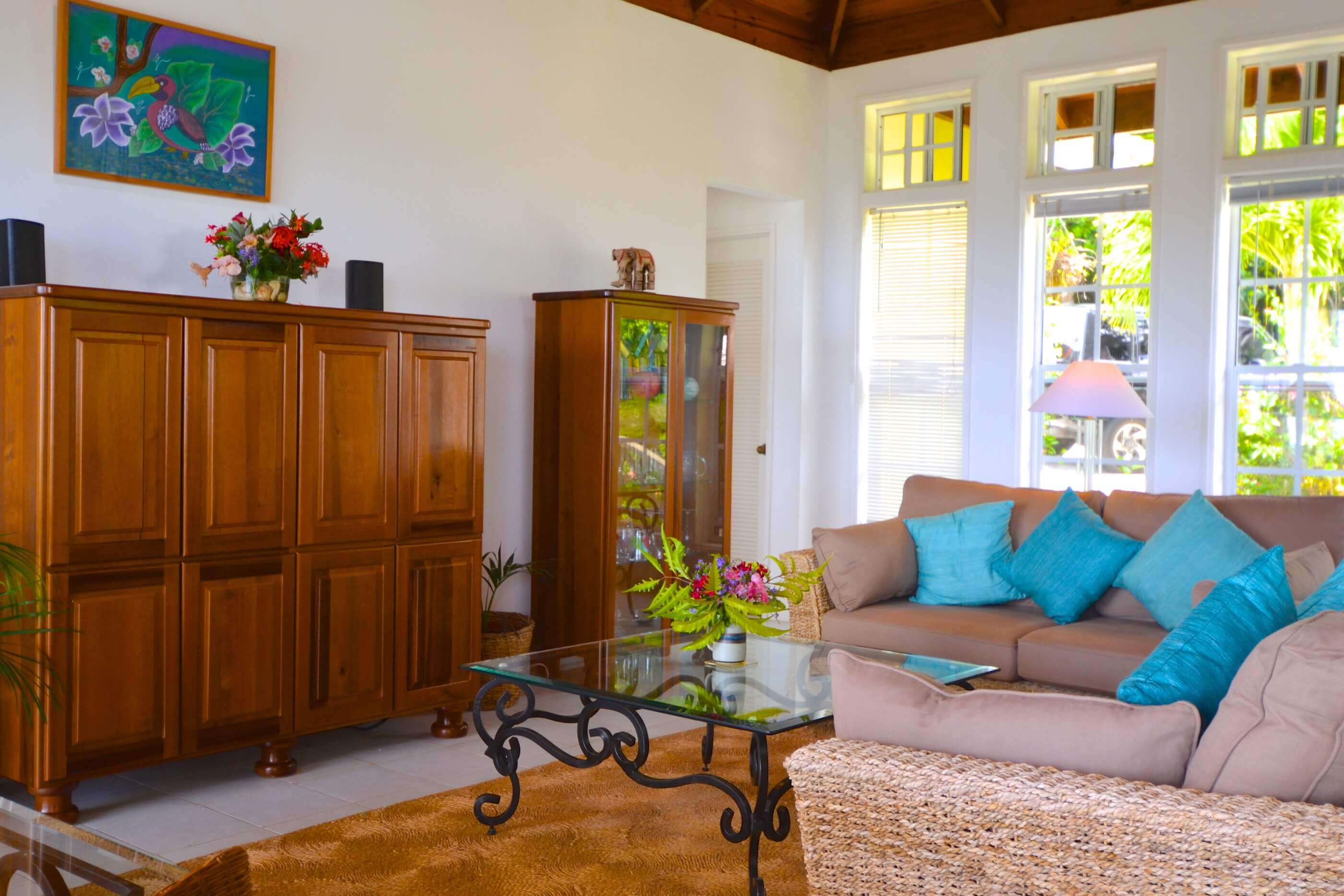 The main living area is large with high ceilings so is light and breezy with four double doors that open out onto the veranda. Lounge seating area with a 2 x 2 seat sofas and 2 x armchairs with low level glass coffee table and TV and entertainment area.