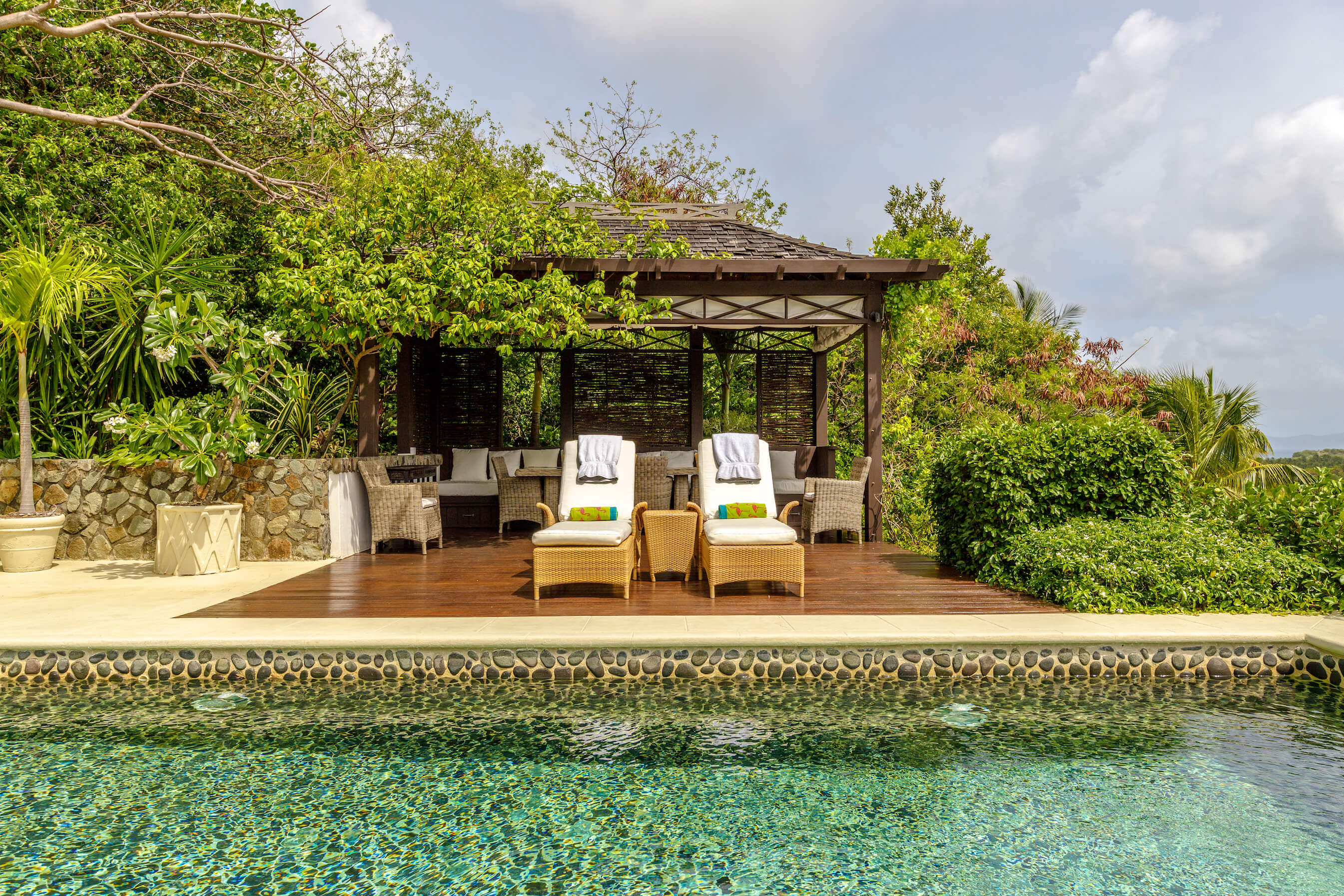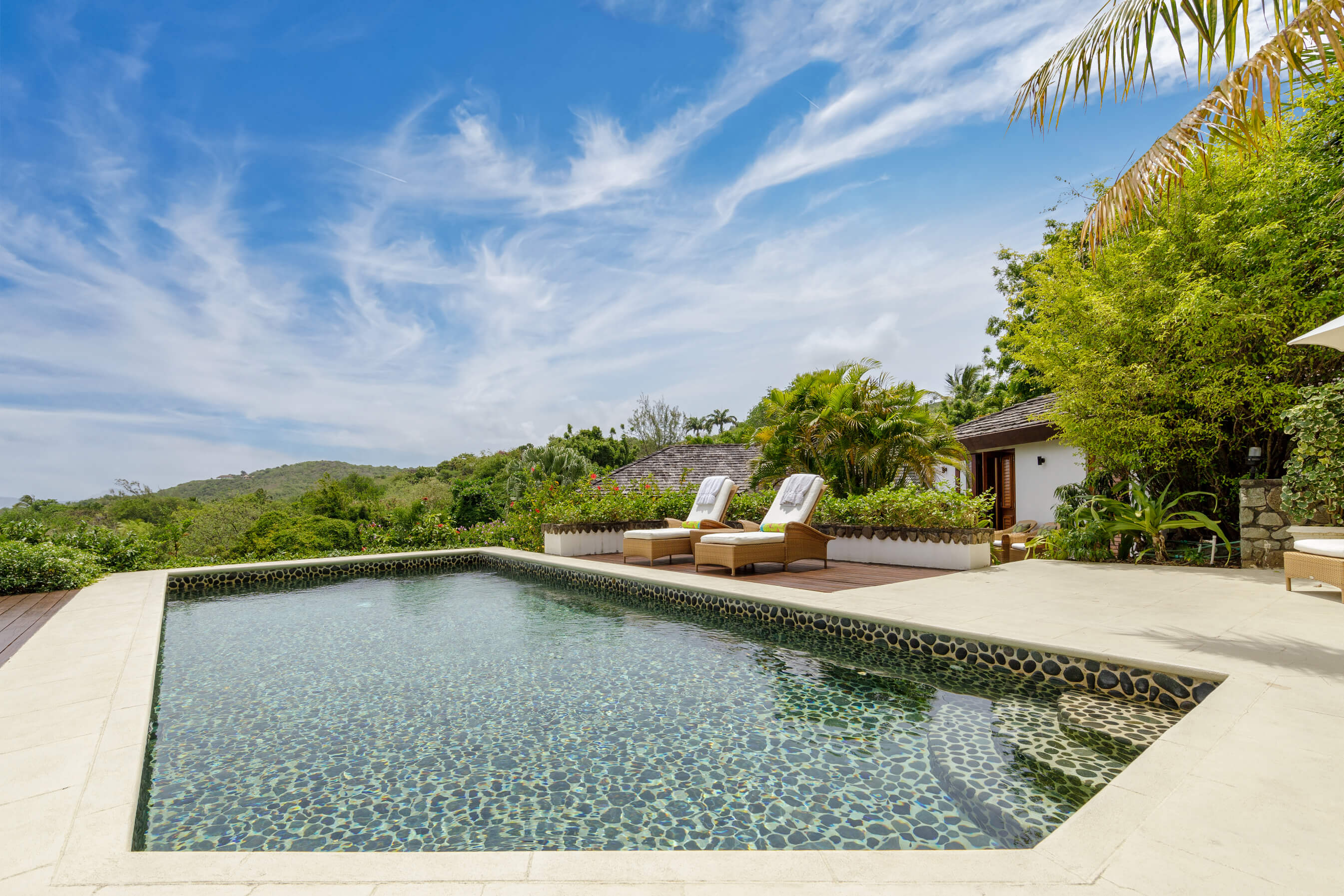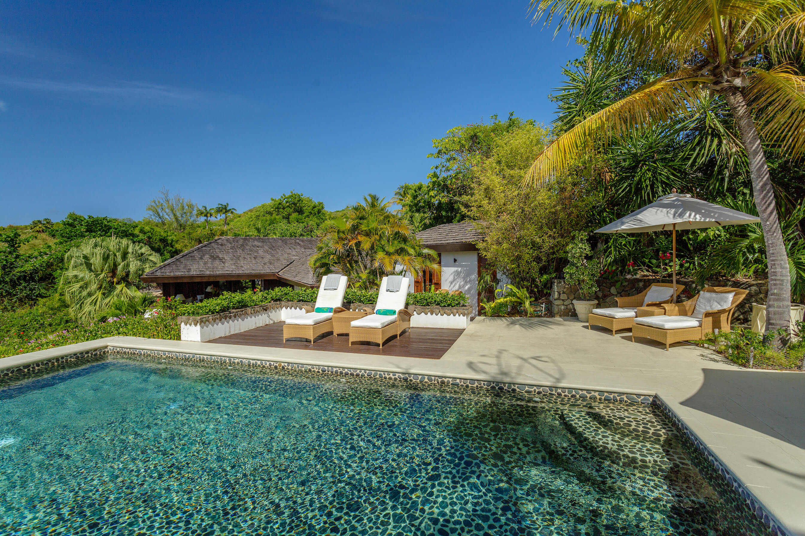 The freshwater stone lined pool is 29' long with sun loungers and a dining gazebo, outdoor showers finished in the same curvaceous pebbles that line the pool. The pool area overlooks the tropical gardens and Caribbean sea beyond - the perfect place to relax or enjoy a meal.