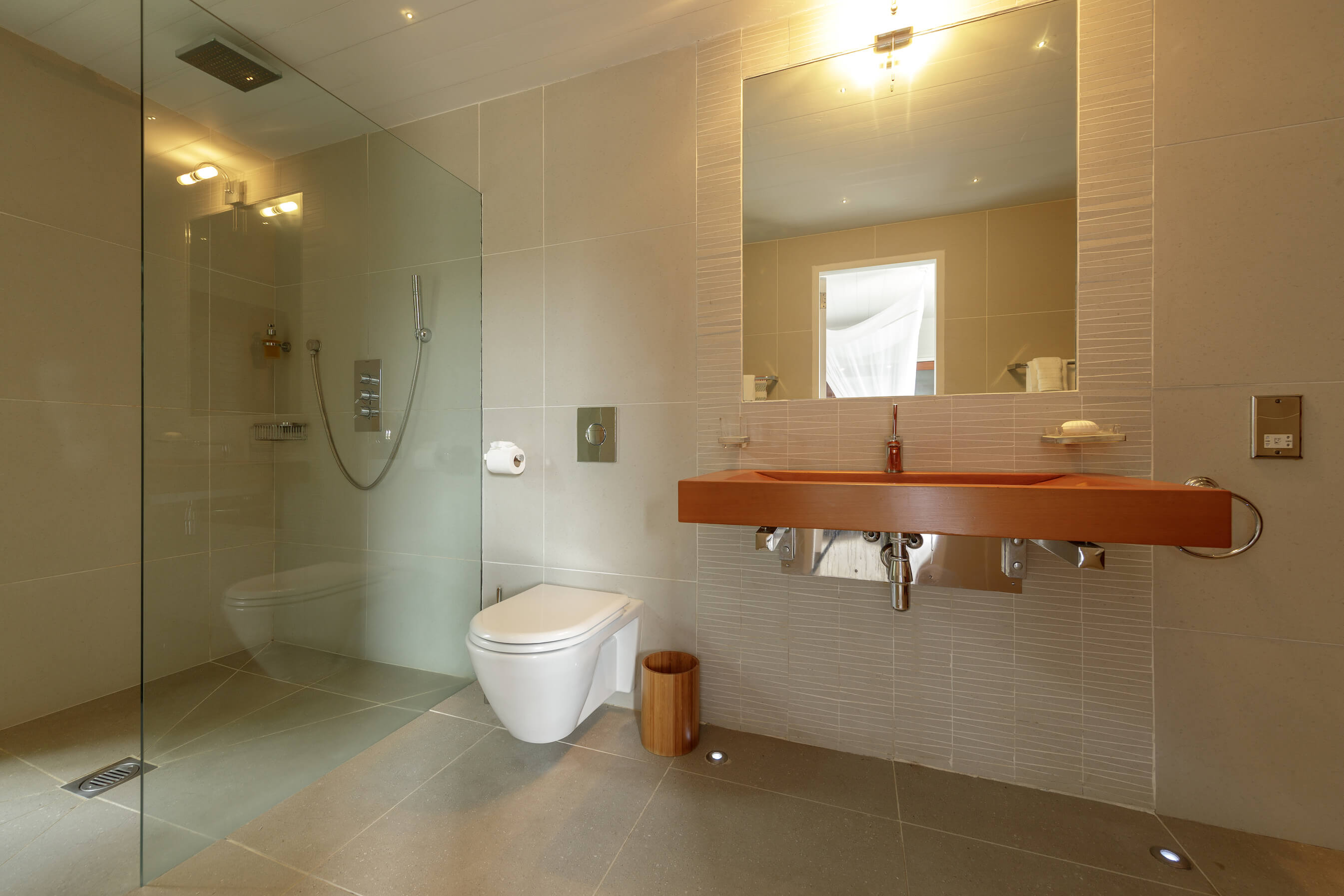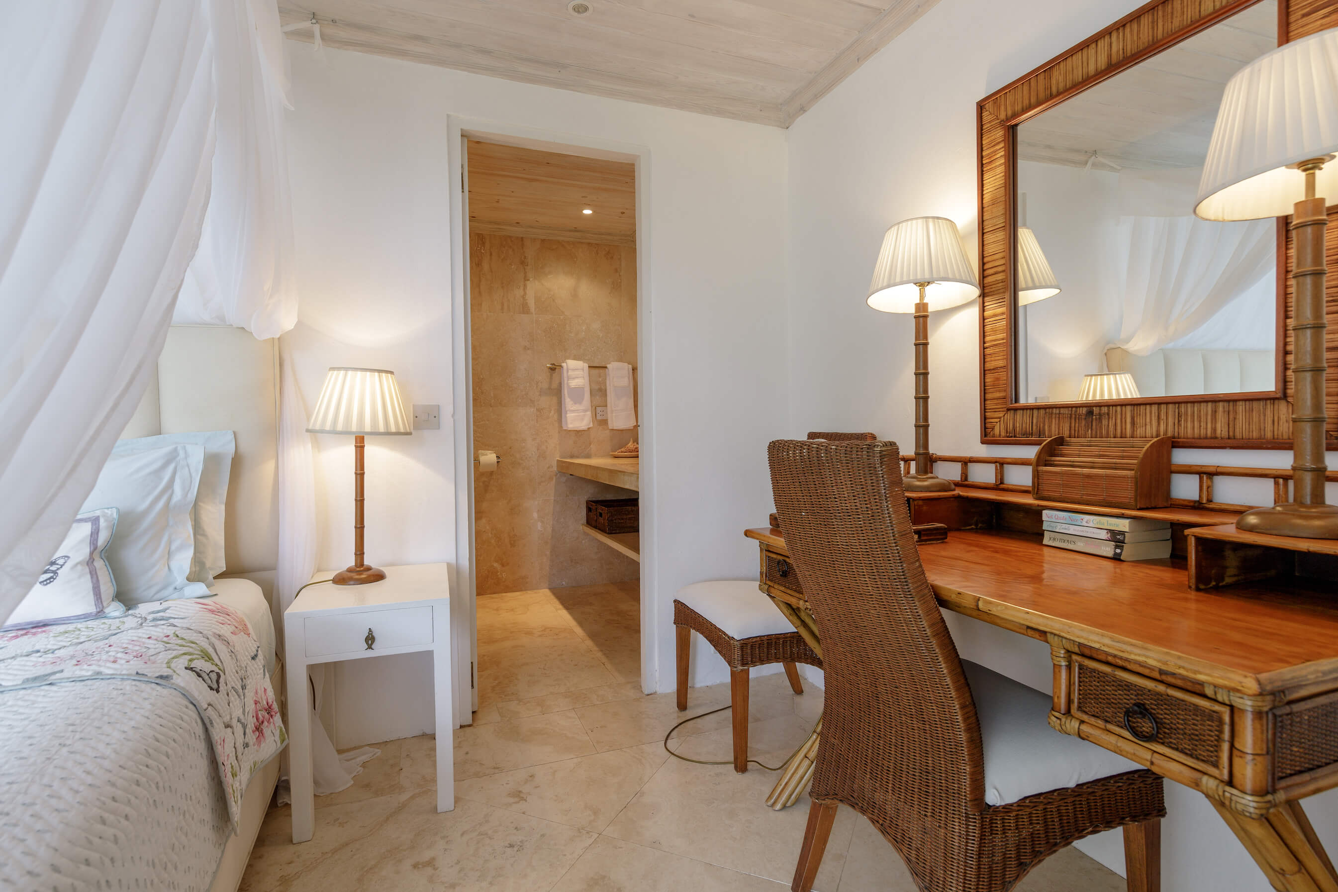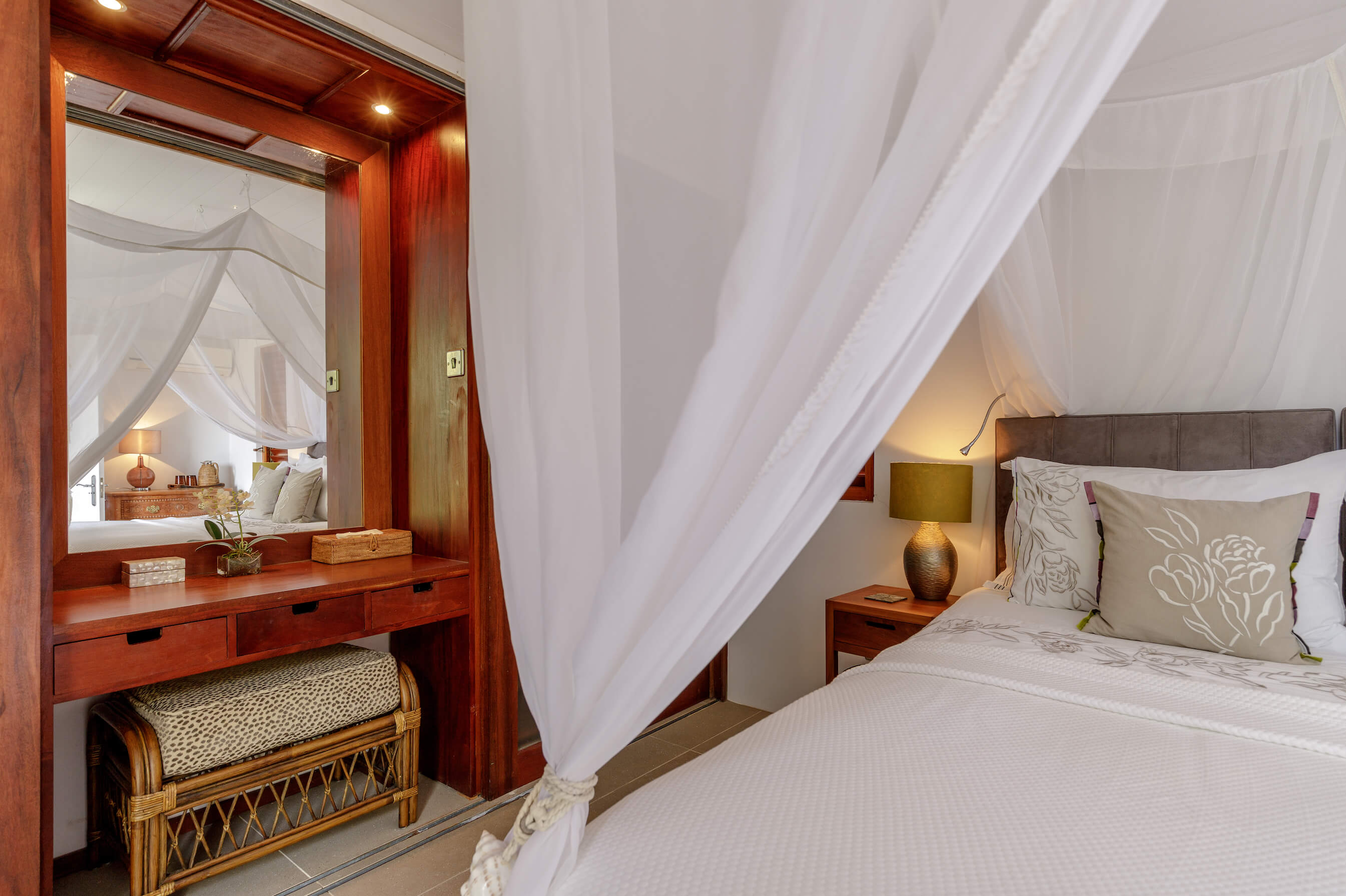 3 bedrooms, 2 twin rooms and a King Size master bedroom all feature modern, sleek, spa style bathrooms, have air conditioning, louvered windows and mosquito nets over the beds.