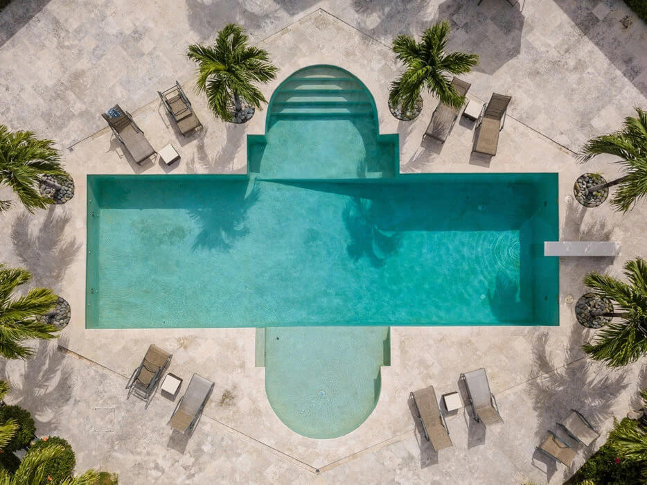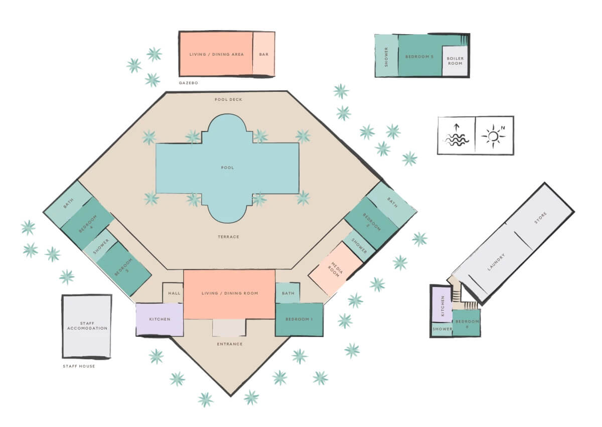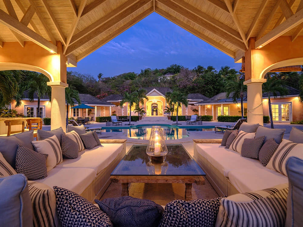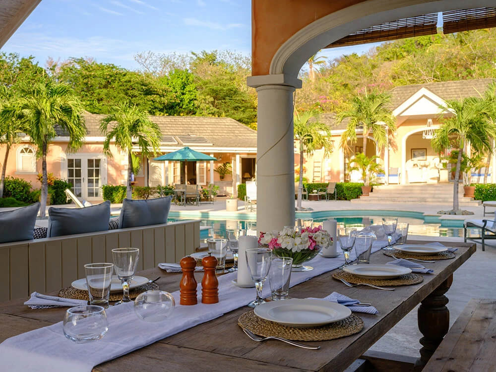The property has five bedrooms and media room plus multiple outdoor dining tables and lounge areas around the pool.