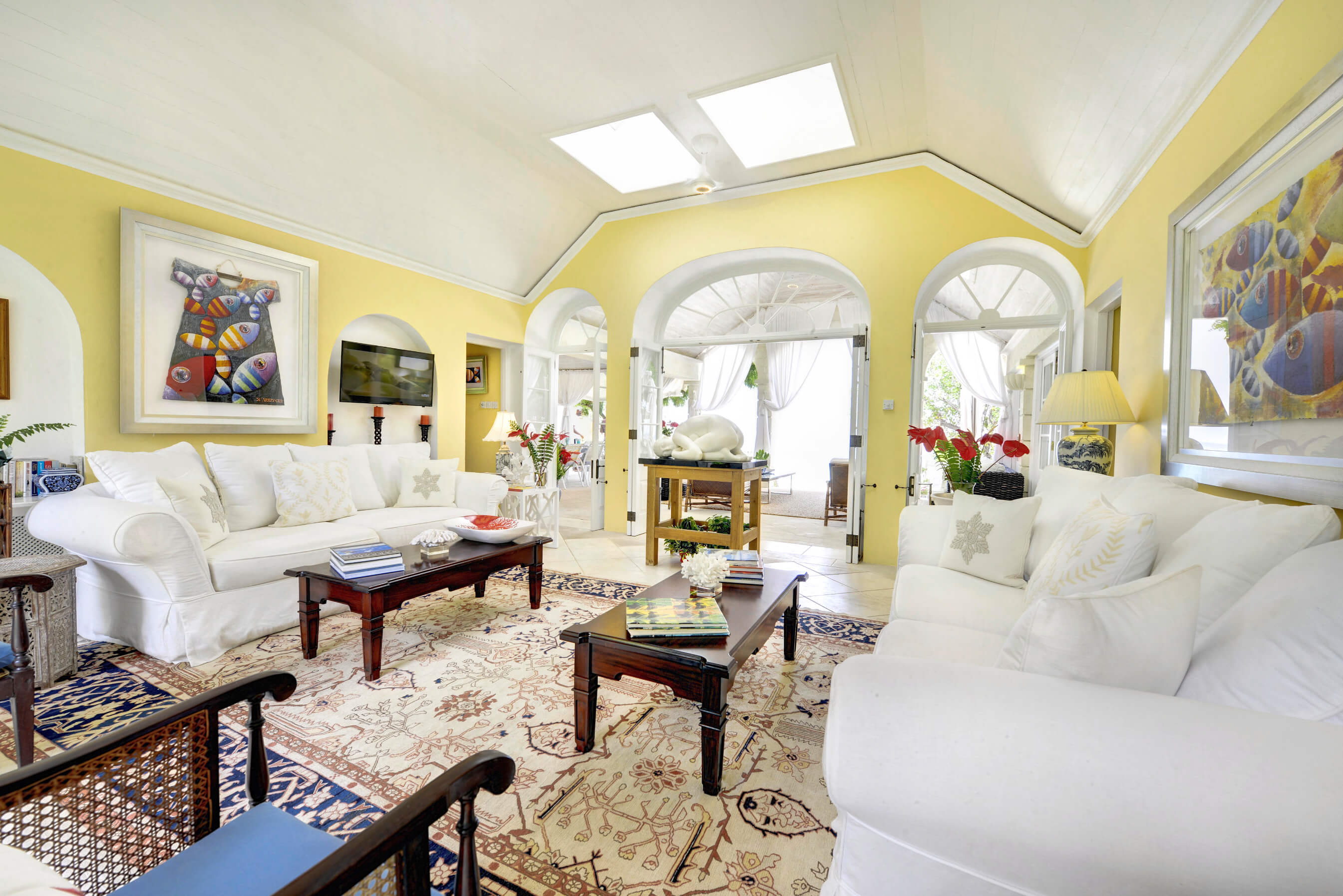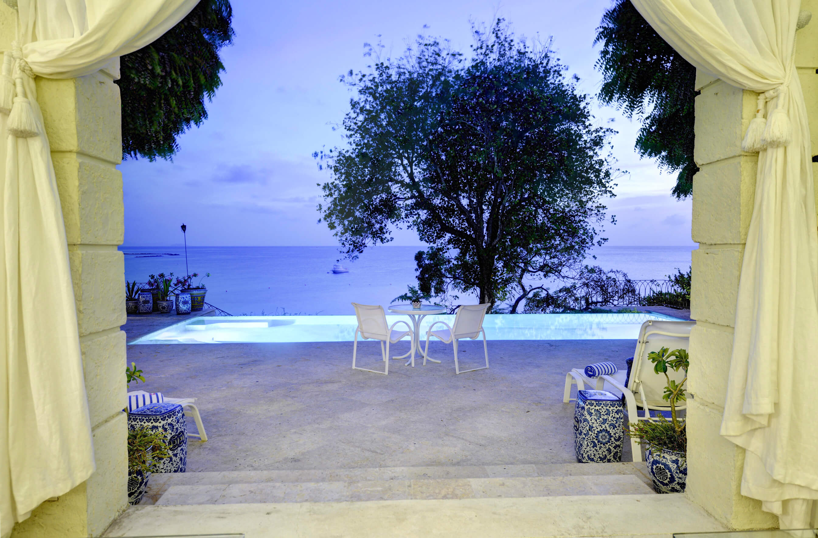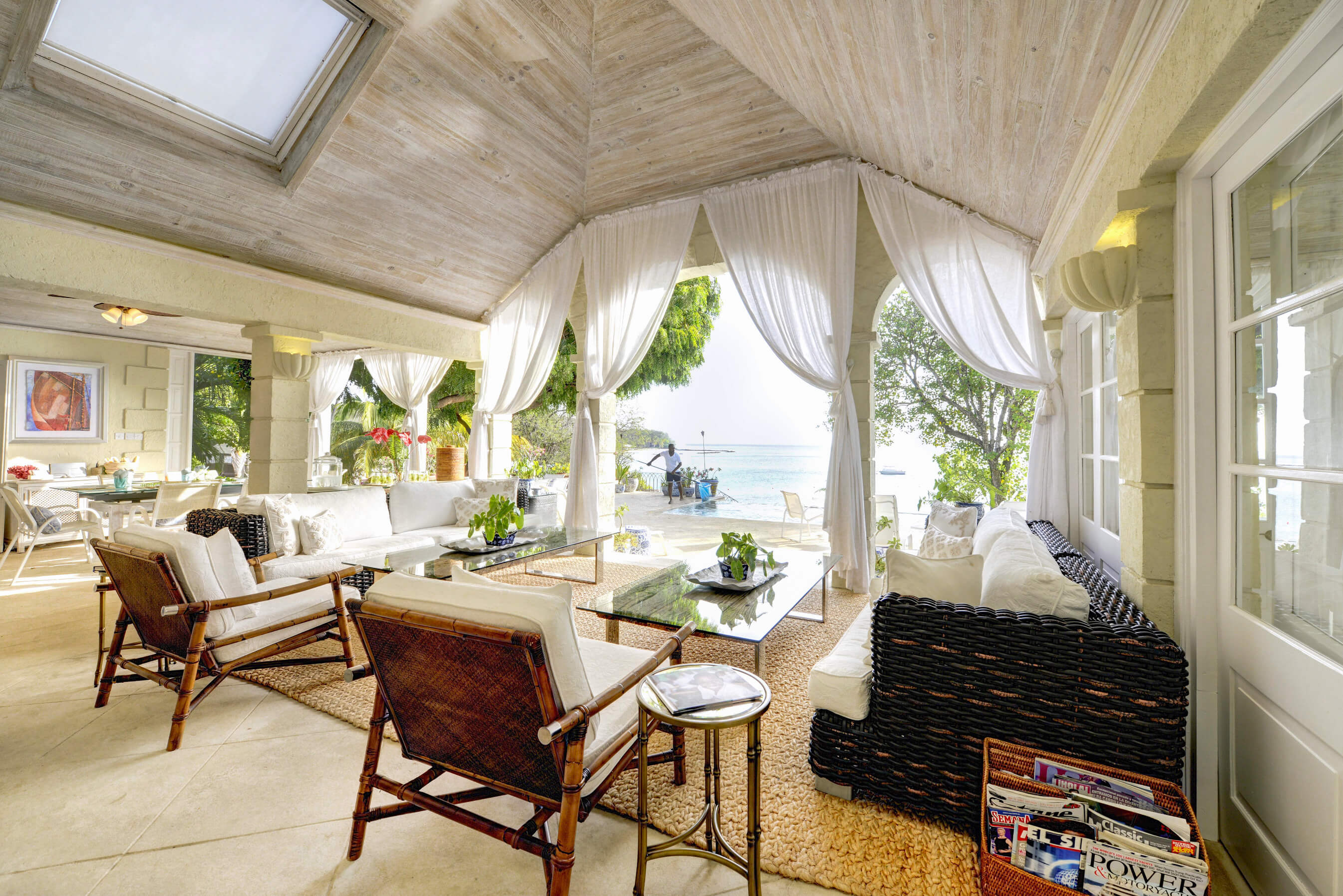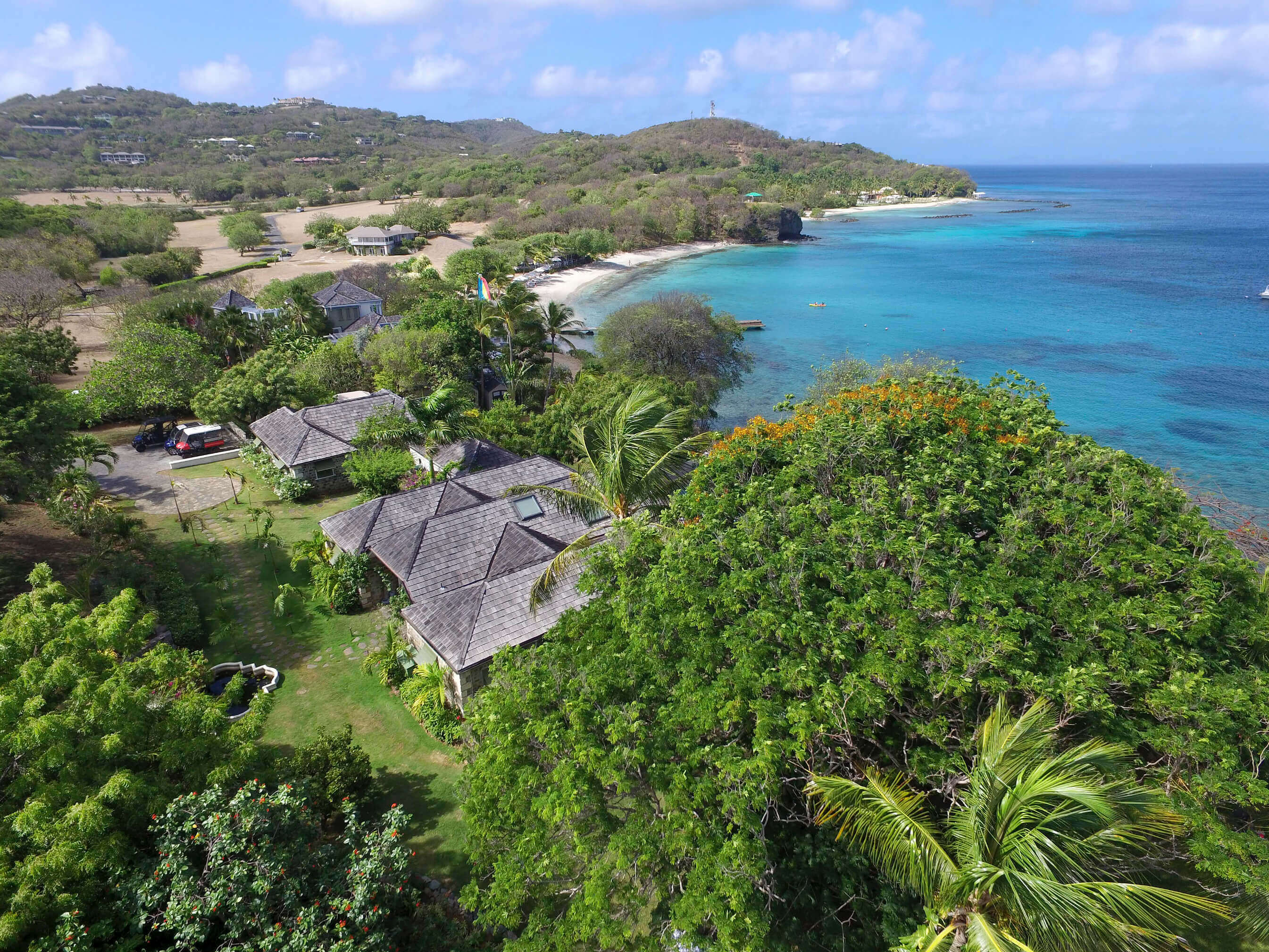 The stylish living room is located at the centre of the property, with impressive arched doors at either end leading onto an open verandah with both a family room and dining area, perfect areas to enjoy the expansive views in comfort. The central living space is flanked by two classically styled en suite bedrooms, furnished & tastefully decorated tastefully. The newer, seaside bedrooms, have simply wonderful views and the soothing rhythm of the Caribbean sea to enjoy.